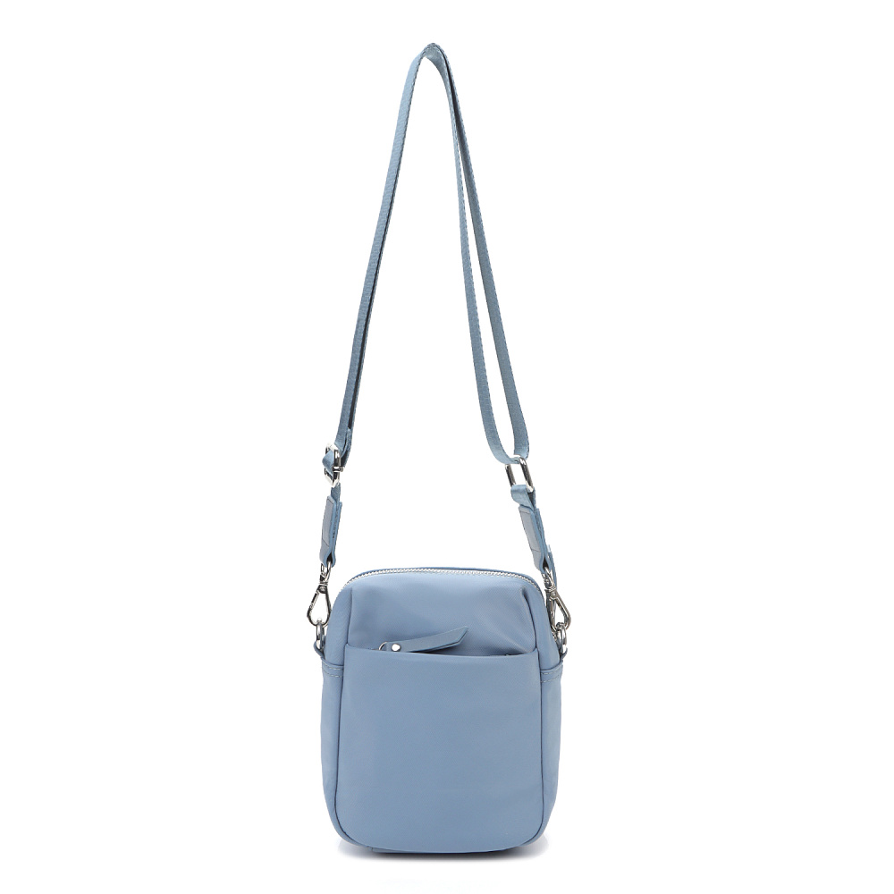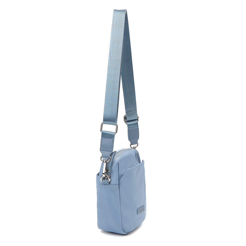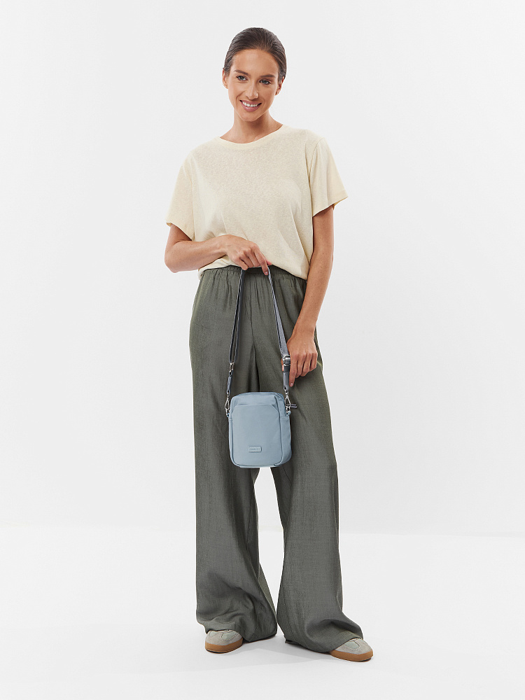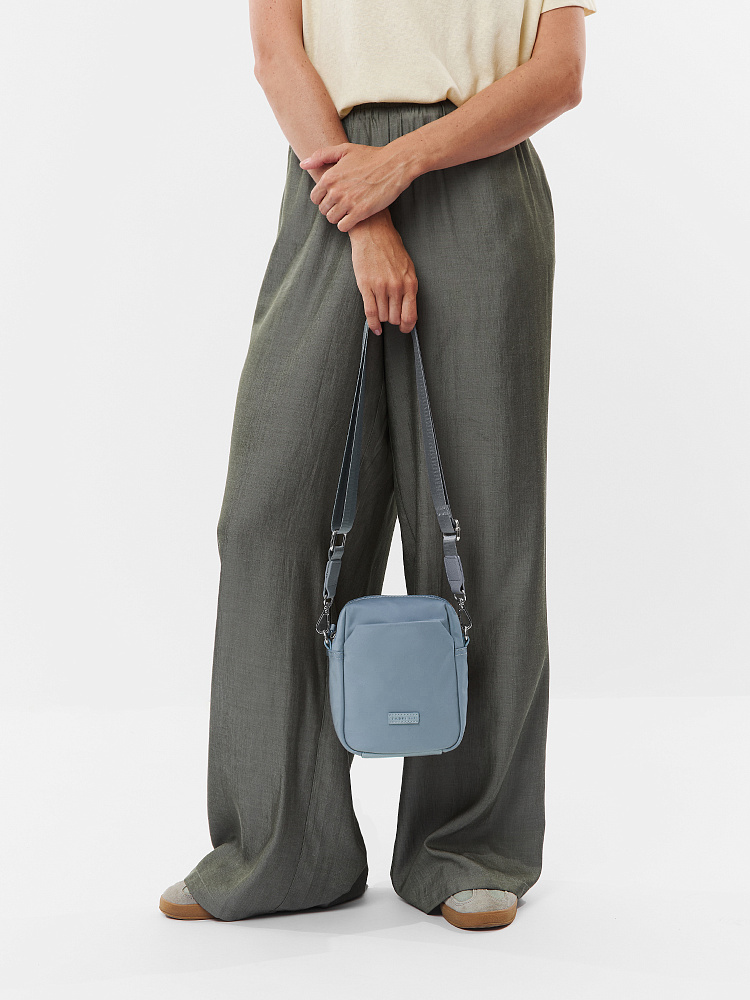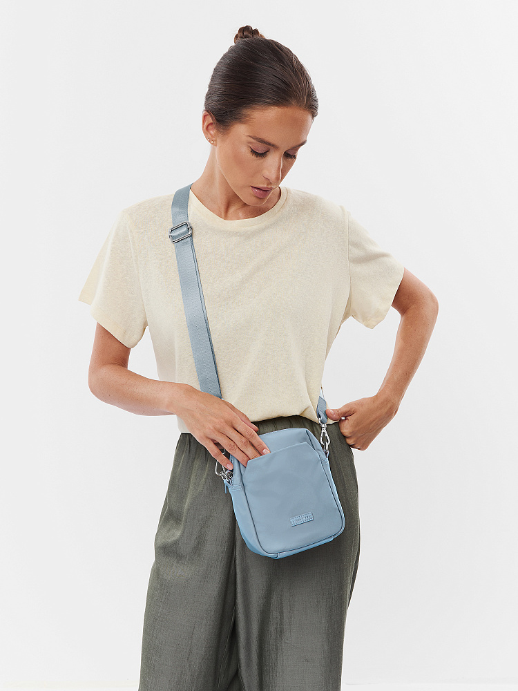 Компактная сумка для телефона из коллекции итальянского бренда FABRETTI в легком небесно-голубом оттенке. Небольшой, но вместительный аксессуар для прогулок и путешествий.У сумки одно основное отделение на полукруглой металлической молнии. Внутри открытый карман и на молнии. На лицевой стороне открытый карман с магнитным замком, на тыльной стороне карман быстрого доступа на молнии. Пришивной логотип и поводки на молниях выполнены их экокожи в тон сумке.Сумка дополнена съемным регулируемым текстильным ремнем на карабинах. Длина 135 см. Дно усилено вставкой из экокожи. Цвет фурнитуры – серебро.