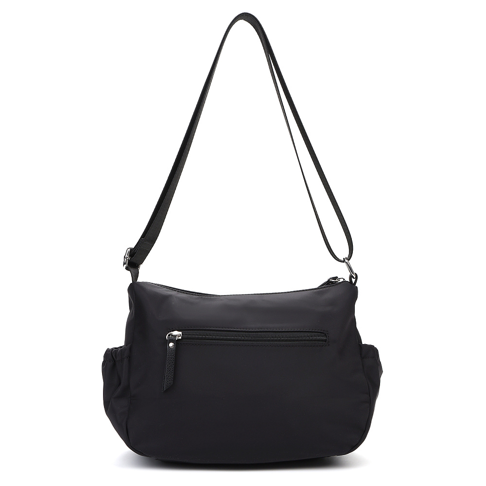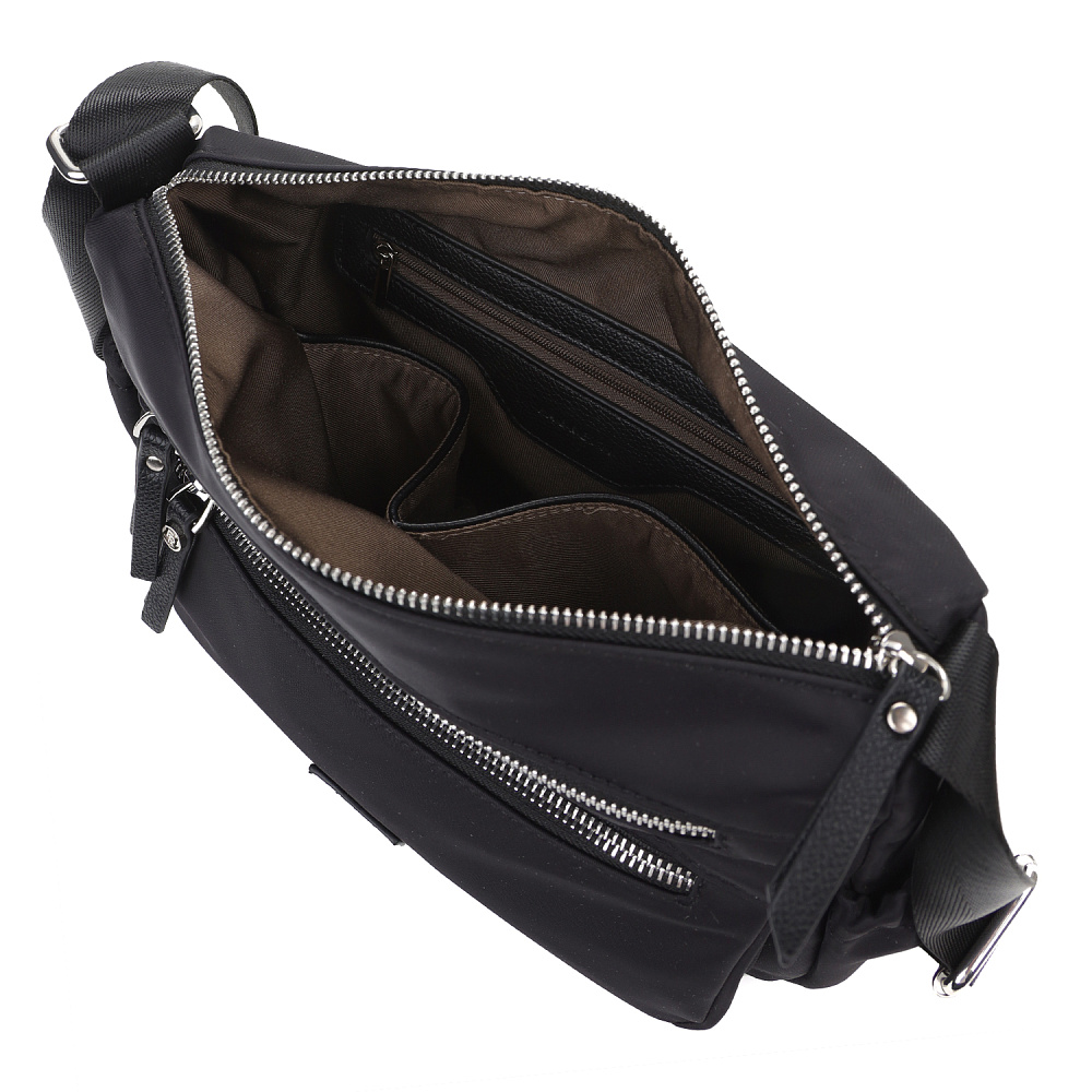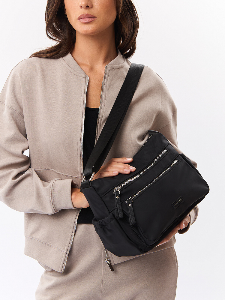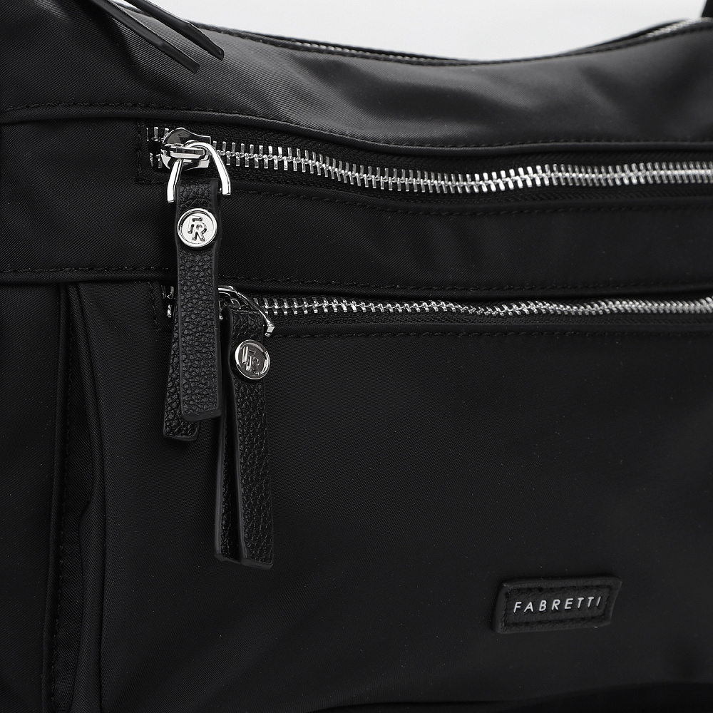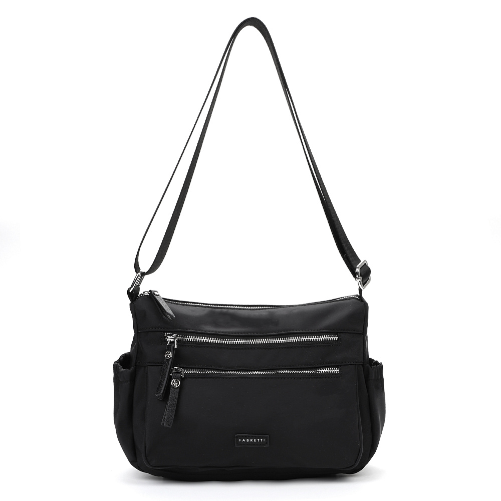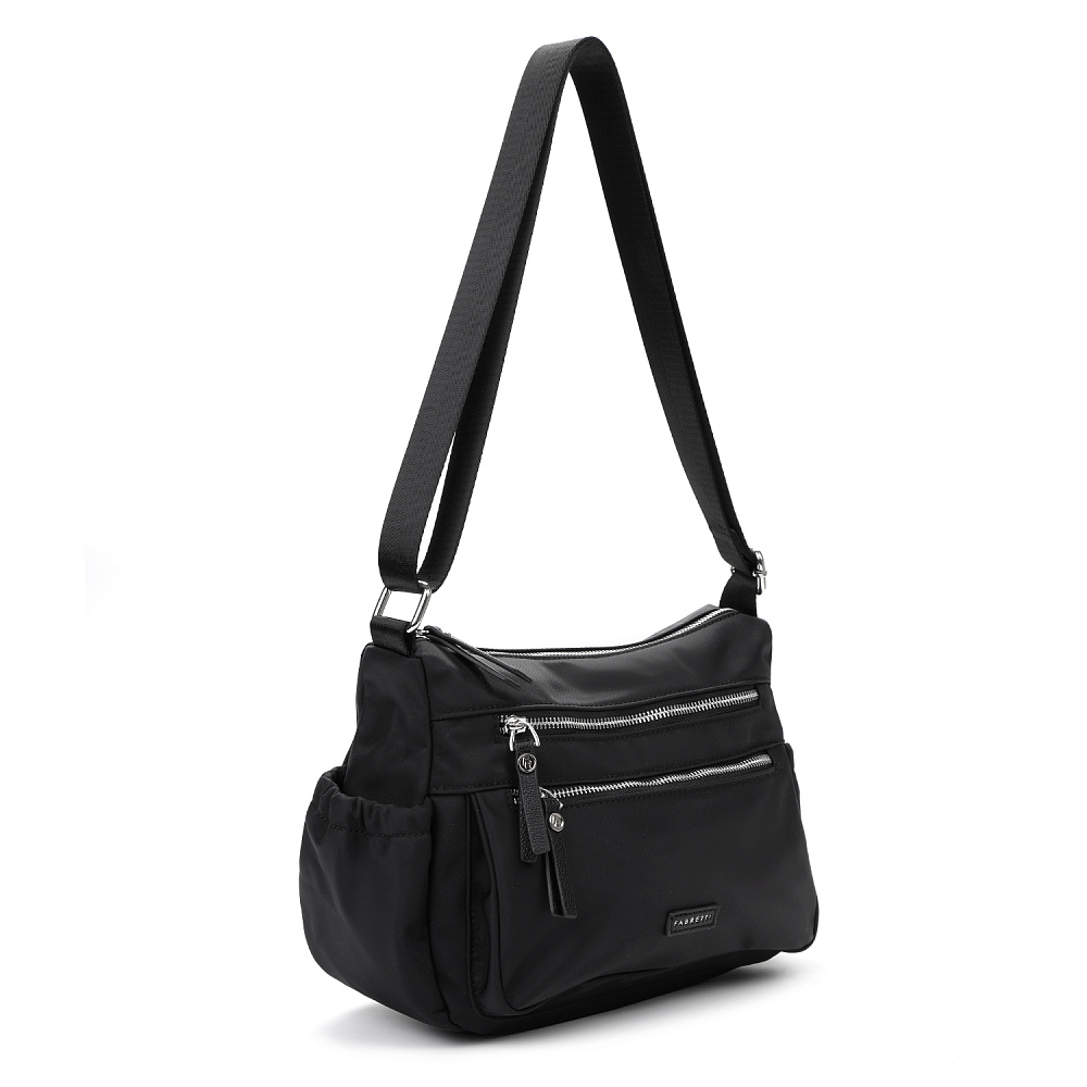 Женская сумка кросс-боди из коллекции итальянского бренда FABRETTI в классическом черном цвете с продуманным функциональным дизайном.Модель имеет одно отделение, закрывающееся на металлическую молнию. Внутри два открытых кармана и один на молнии. На лицевой стороне два кармана на молнии, на тыльной – карман быстрого доступа на молнии. По бокам два открытых кармана для воды или мелочей с вшитой резинкой.Поводки на молниях и пришивной логотип выполнены из экокожи в тон сумки.Эксклюзивная плотная гладкая ткань с деликатным сатиновым блеском имеет водоотталкивающие свойства.У модели регулируемый текстильный плечевой ремень, длина 135см.Дно усилено вставкой из экокожи. Цвет фурнитуры – серебро.Эта сумка станет стильным и продуманным дополнением для городского образа или удобным аксессуаром в поездке.