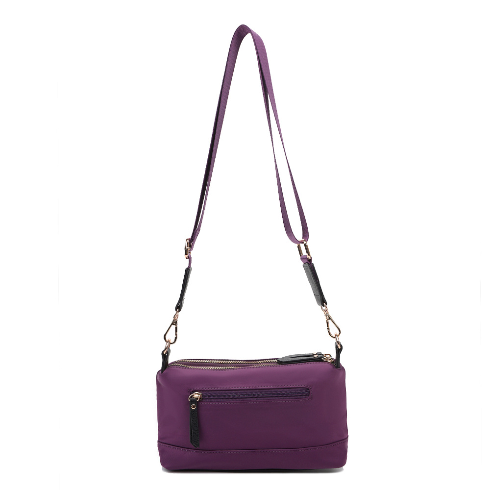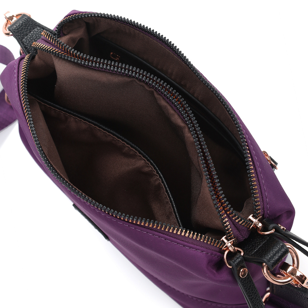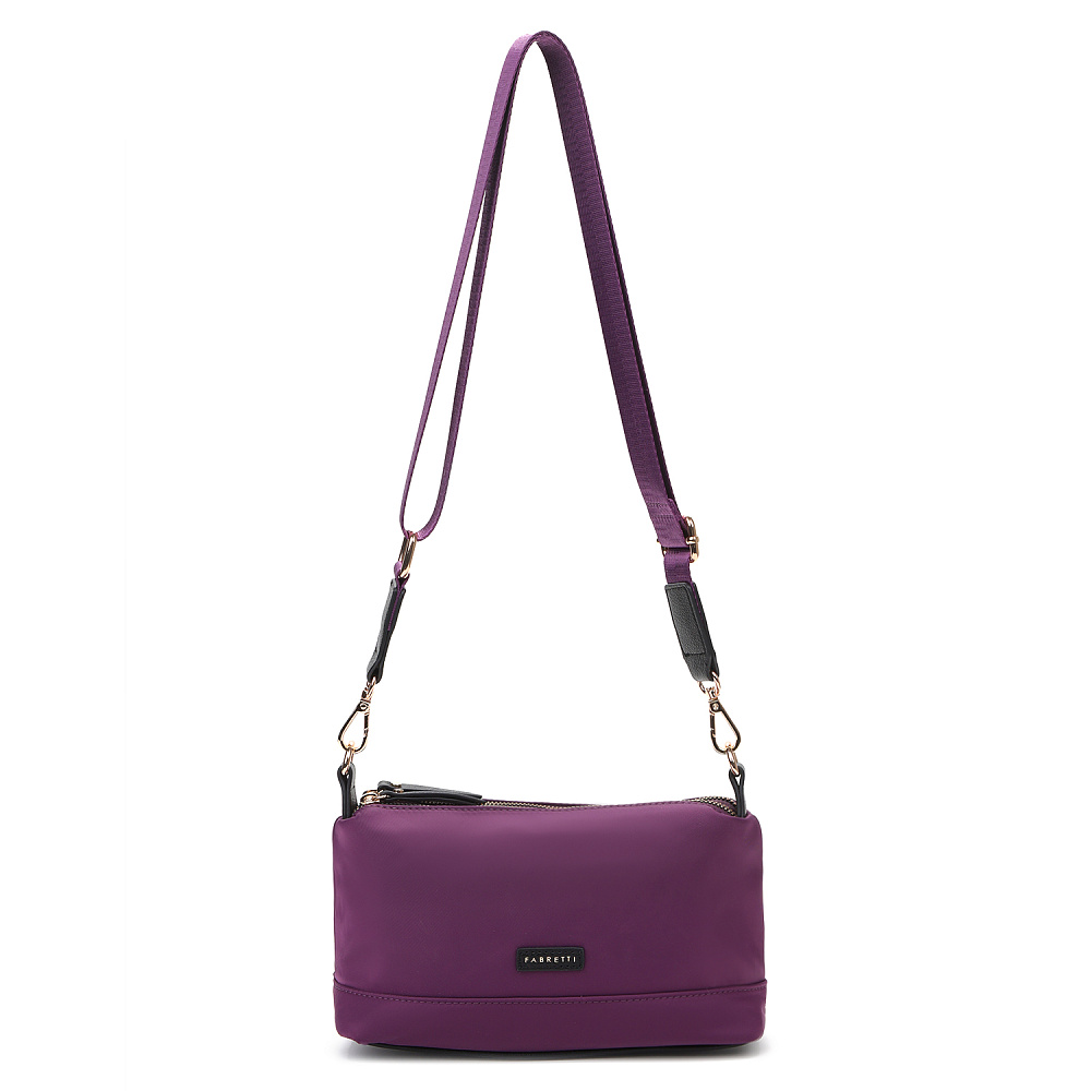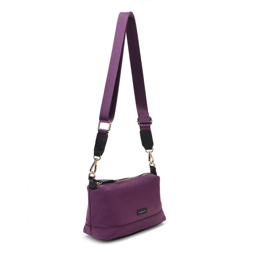 Миниатюрная женская сумка кросс-боди из коллекции итальянского бренда FABRETTI в роскошном фиолетовом цвете. Компактный аксессуар, который подойдет для повседневного ношения и дополнит дорожный багаж.У сумки два отделения, закрывающиеся на металлические молнии. Внутри одного карман на молнии, другого – открытый карман. На тыльной стороне сумки карман быстрого доступа на молнии.Поводки на молниях и пришивной логотип выполнены из экокожи в тон сумки.Эксклюзивная плотная гладкая ткань с деликатным сатиновым блеском имеет водоотталкивающие свойства.У модели съемный регулируемый текстильный плечевой ремень на карабинах, длина 130см.Дно усилено вставкой из экокожи. Цвет фурнитуры – золото.