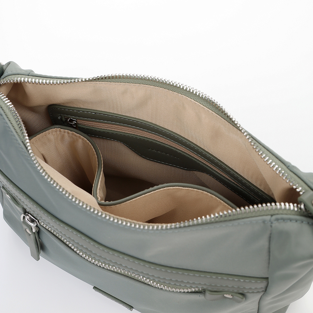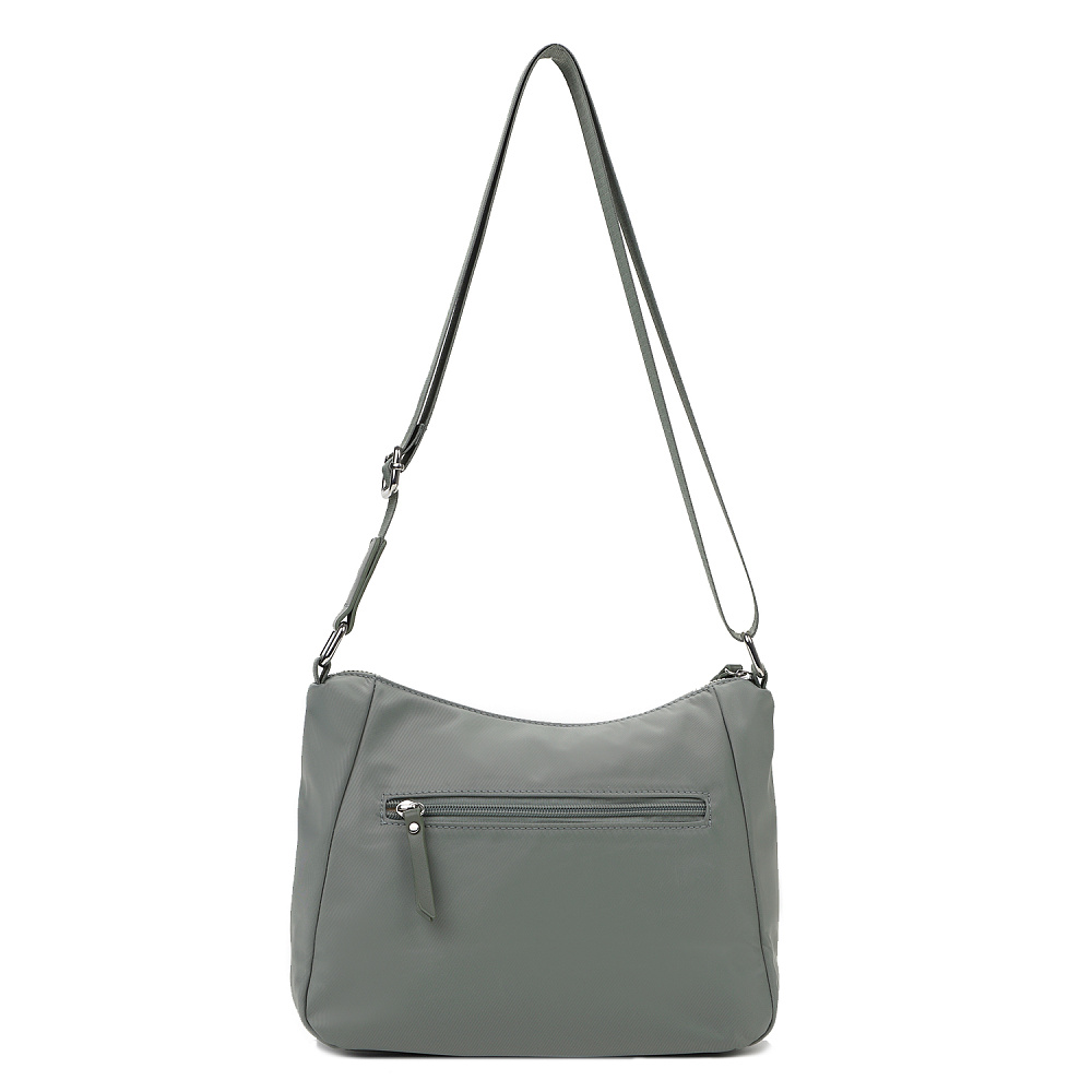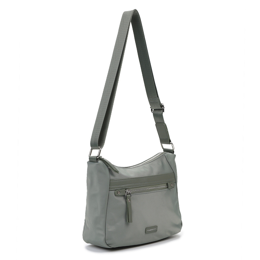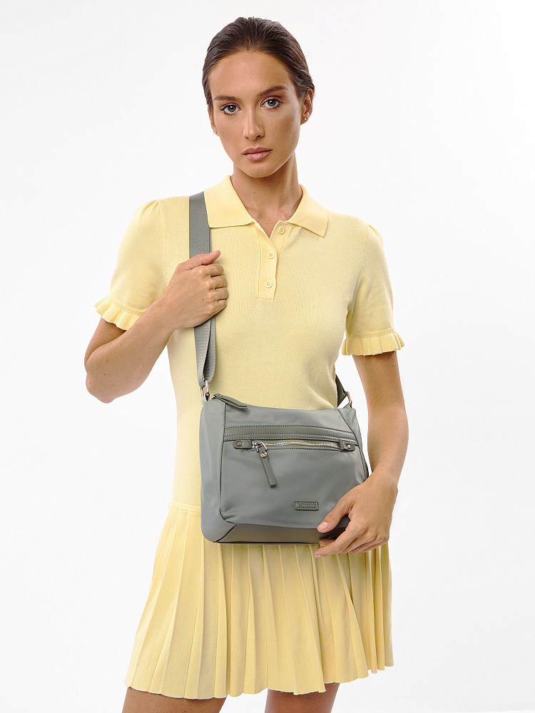 Небольшая женская сумка кросс-боди из коллекции итальянского бренда FABRETTI в холодном серо-зеленом оттенке.Компактная модель с современным дизайном и лаконичным декором, которая подходит и для короткой поездки, и для городского образа.Основное отделение закрывается на металлическую молнию. Внутри три кармана – два открытых и на молнии. На лицевой и тыльной сторонах сумки расположены карманы быстрого доступа на молнии.Поводки на молниях, пришивной логотип и крепления ремня выполнены из экокожи в тон сумки.Эксклюзивная плотная гладкая ткань с деликатным сатиновым блеском имеет водоотталкивающие свойства.У модели регулируемый текстильный плечевой ремень, длина 130см.Дно усилено вставкой из экокожи. Цвет фурнитуры – серебро.