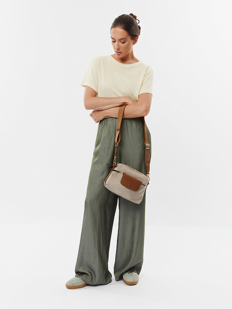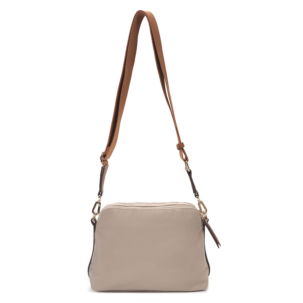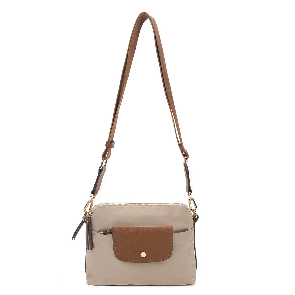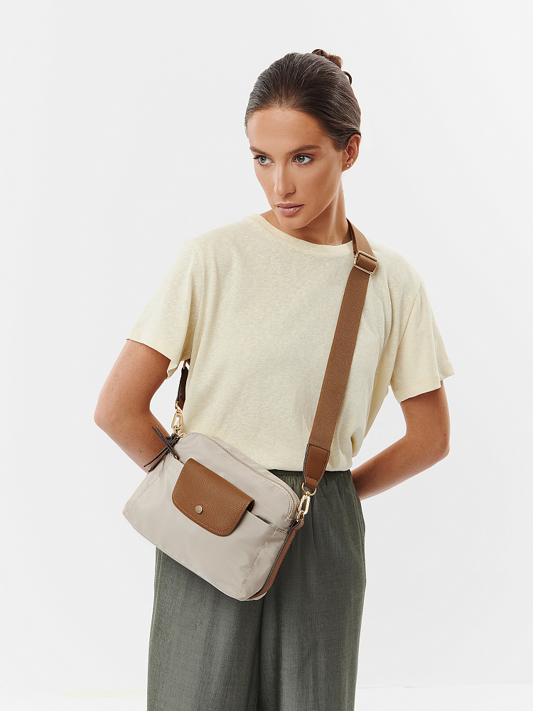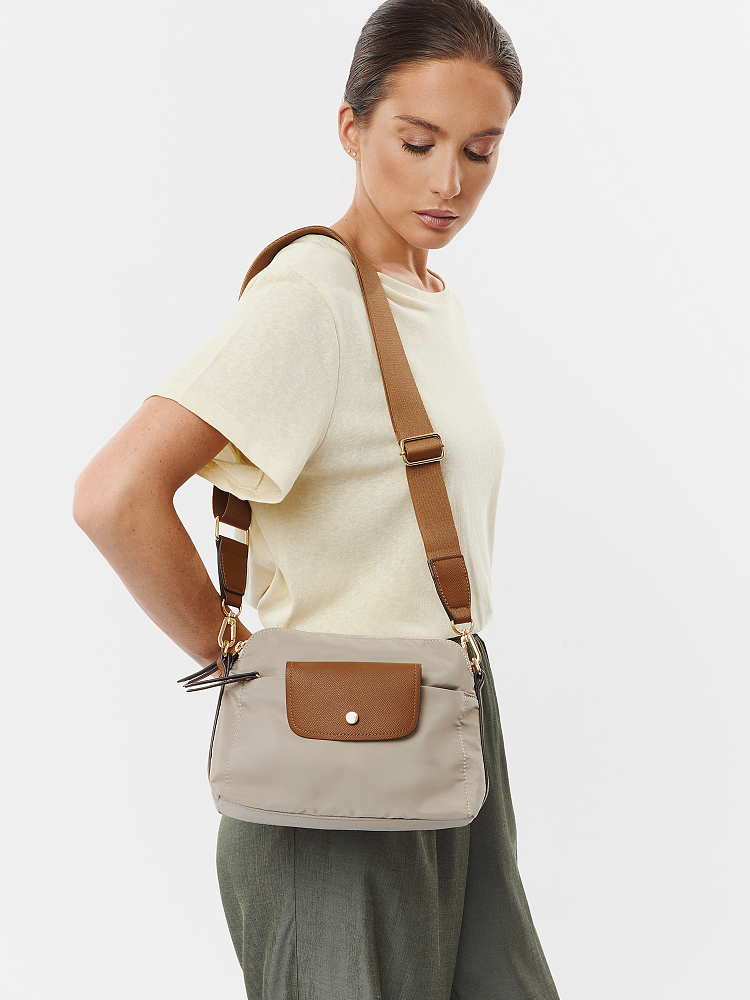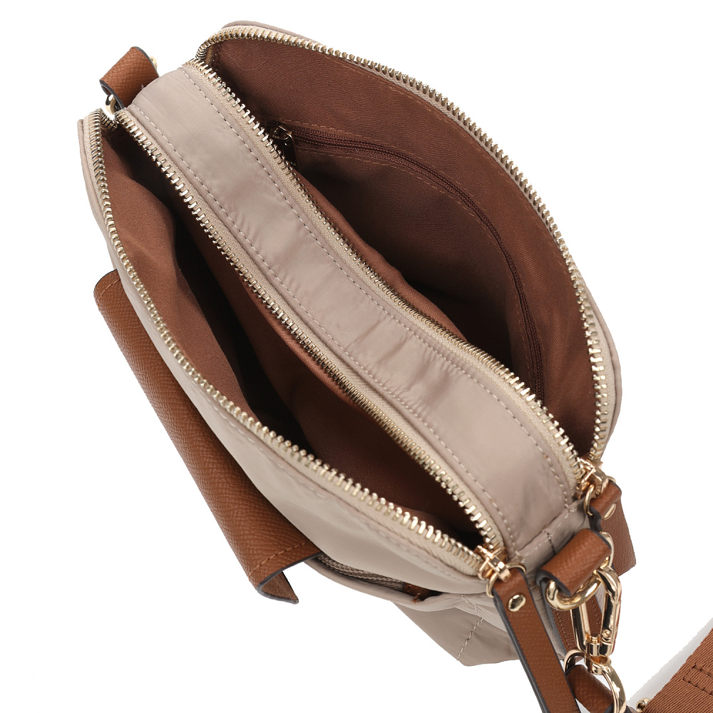 Компактная и удобная женская сумка кросс-боди из коллекции итальянского бренда FABRETTI в холодном серо-бежевом цвете. Удобная модель в трендовом дизайне для повседневного городского образа.У модели два отделения, закрывающихся на молнию. Внутри одного небольшой карман на молнии.На лицевой стороне также сделан карман на молнии, дополнительно закрывающийся клапаном с кнопкой. Съемный текстильный ремень регулируется по размеру.У модели лаконичный декор из коричневой экокожи в тон ремню с тиснением «сафьяно»: клапан на кармане, поводки на молниях, отделка ремня. Эксклюзивная плотная гладкая ткань с деликатным блеском имеет водоотталкивающие свойства.Цвет фурнитуры – золото. Длина ремня 120 см.