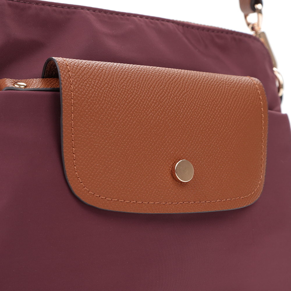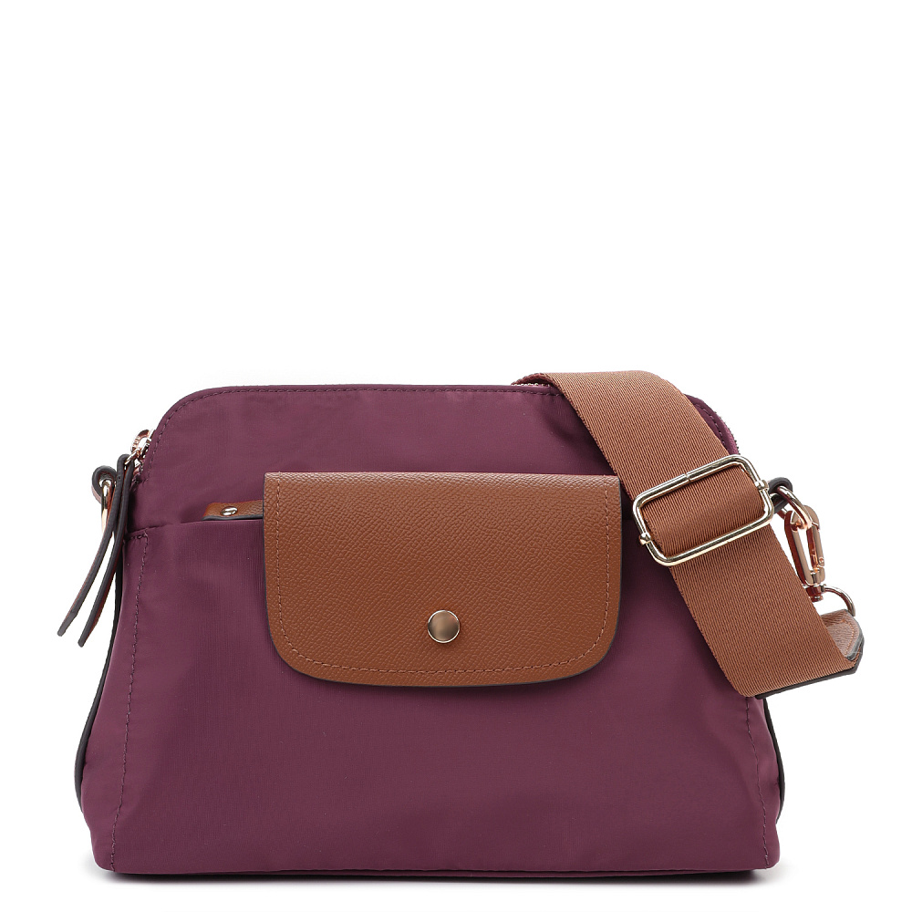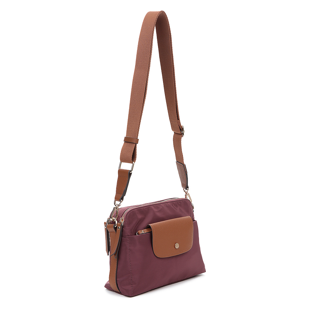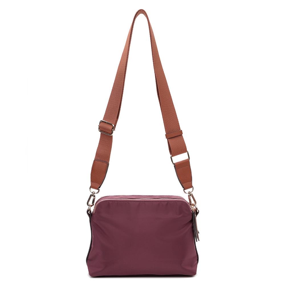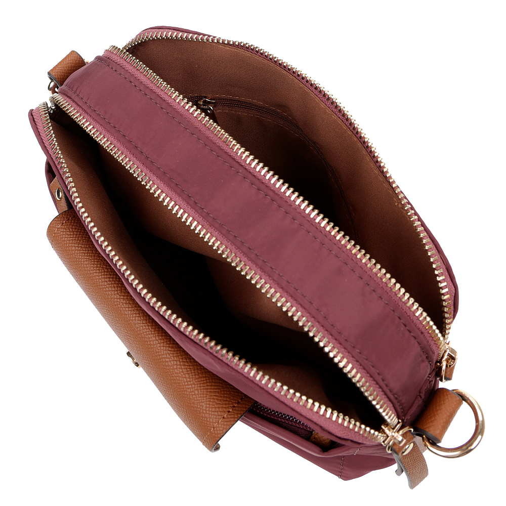 Компактная и удобная женская сумка кросс-боди из коллекции итальянского бренда FABRETTI в благородном оттенке бордо. Удобная модель в трендовом дизайне для повседневного городского образа.У модели два отделения, закрывающихся на молнию. Внутри одного небольшой карман на молнии.На лицевой стороне также сделан карман на молнии, дополнительно закрывающийся клапаном с кнопкой. Съемный текстильный ремень регулируется по размеру.У модели лаконичный декор из коричневой экокожи в тон ремню с тиснением «сафьяно»: клапан на кармане, поводки на молниях, отделка ремня. Эксклюзивная плотная гладкая ткань с деликатным блеском имеет водоотталкивающие свойства.Цвет фурнитуры – золото. Длина ремня 120 см.