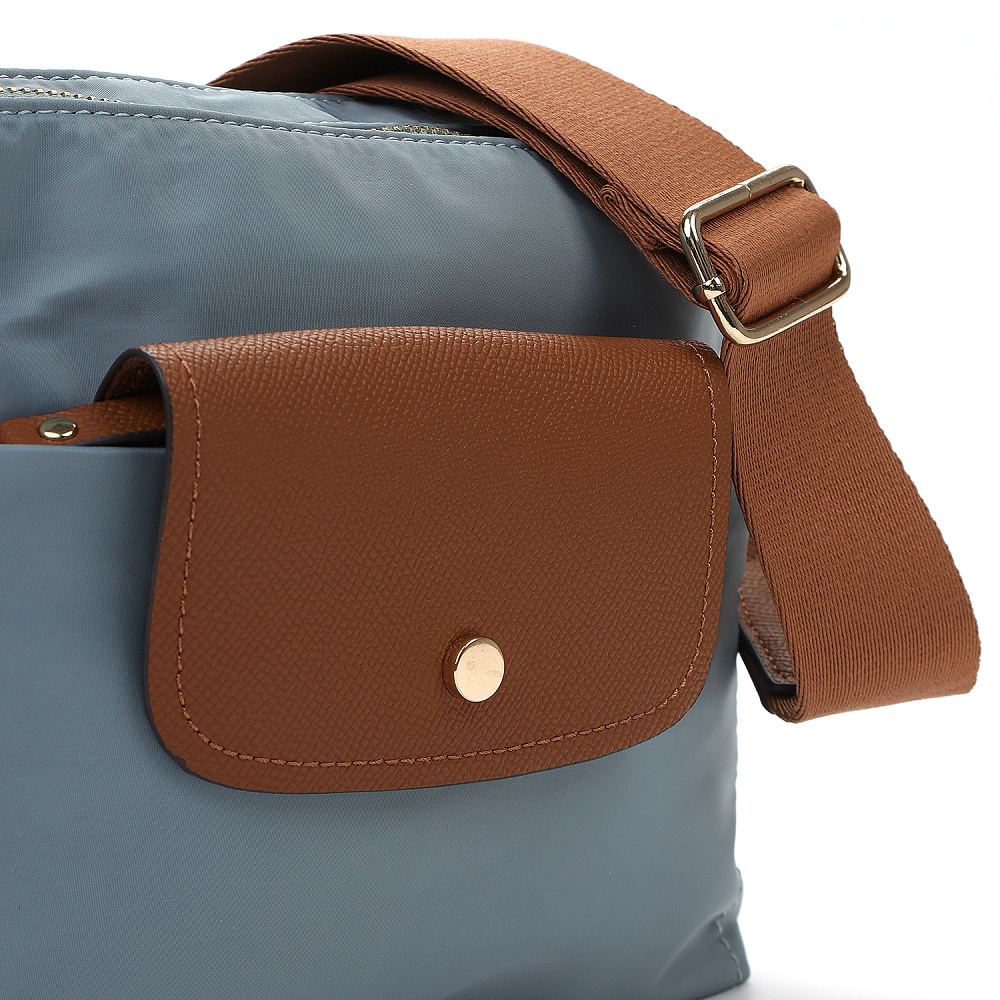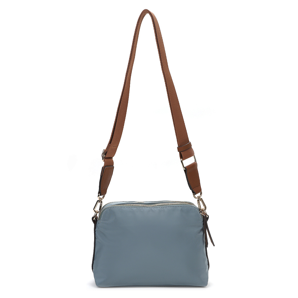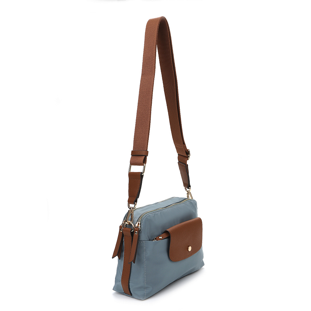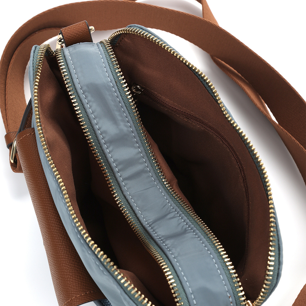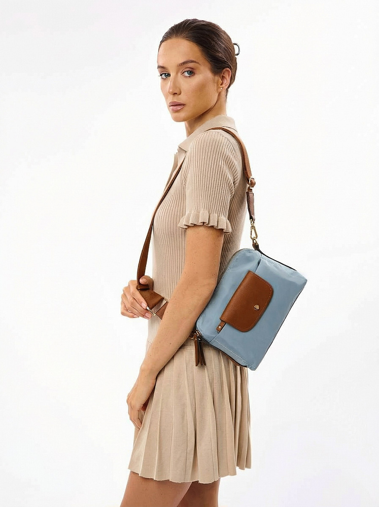 Компактная и удобная женская сумка кросс-боди из коллекции итальянского бренда FABRETTI в трендовом серо-голубом оттенке «Голландский канал». Удобная модель в трендовом дизайне для повседневного городского образа.У модели два отделения, закрывающихся на молнию. Внутри одного небольшой карман на молнии.На лицевой стороне также сделан карман на молнии, дополнительно закрывающийся клапаном с кнопкой. Съемный текстильный ремень регулируется по размеру.У модели лаконичный декор из коричневой экокожи в тон ремню с тиснением «сафьяно»: клапан на кармане, поводки на молниях, отделка ремня. Эксклюзивная плотная гладкая ткань с деликатным блеском имеет водоотталкивающие свойства.Цвет фурнитуры – золото. Длина ремня 120 см.