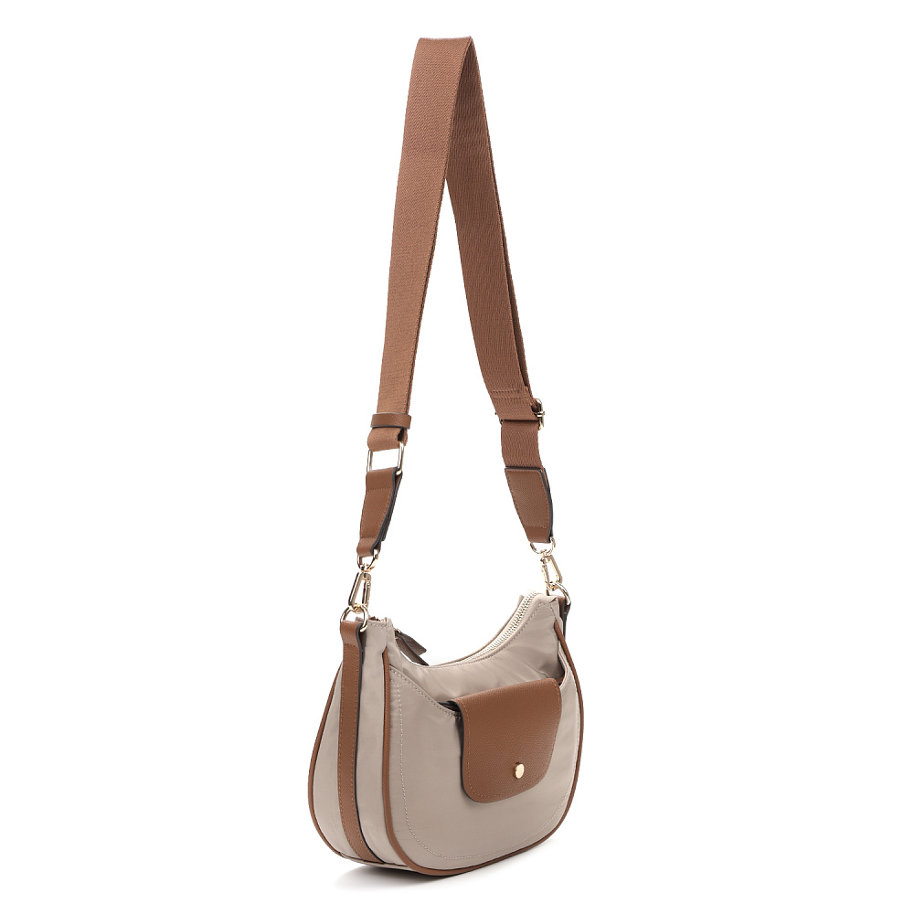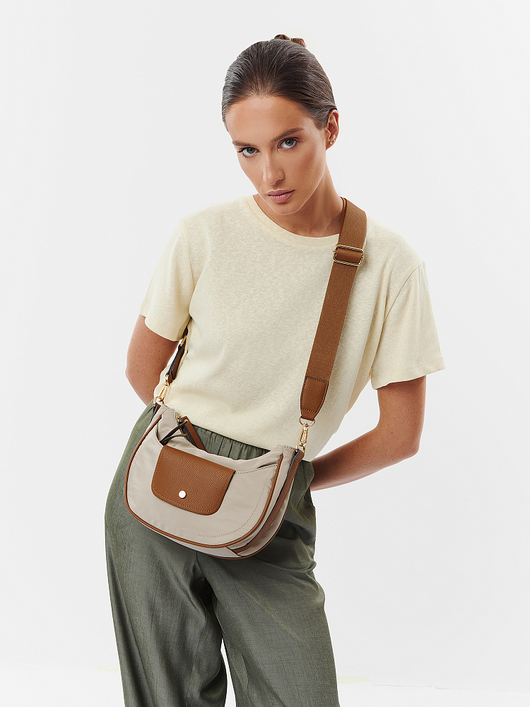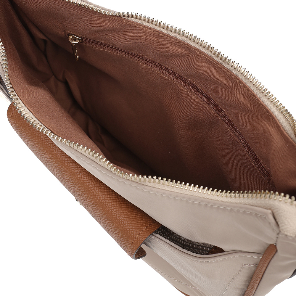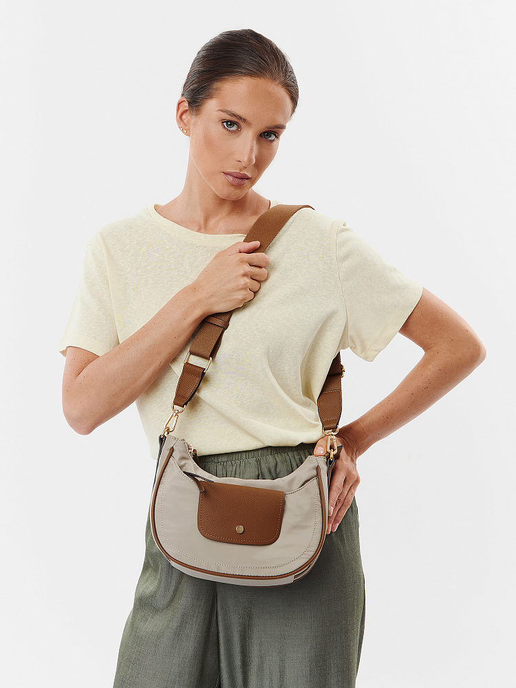 Изящная женская сумка кросс-боди в форме полумесяца из коллекции итальянского бренда FABRETTI в холодном серо-бежевом цвете. Стильная и продуманная модель, соответствующая мировым трендам сезона.Единственное отделение закрывается на молнию и дополнено внутренним карманом на молнии. На лицевой стороне небольшой карман на молнии, дополнительно закрывающийся клапаном с кнопкой. На тыльной стороне карман быстрого доступа на молнии. Съемный текстильный ремень регулируется по размеру.У модели строгий и лаконичный декор из коричневой экокожи с тиснением «сафьяно»: клапан на кармане, поводки на молниях, отделка ремня; сохранять форму сумке помогает жесткий кожаный кант по длине. Эксклюзивная плотная гладкая ткань с деликатным блеском имеет водоотталкивающие свойства. Цвет фурнитуры – золото. Длина ремня 120 см.