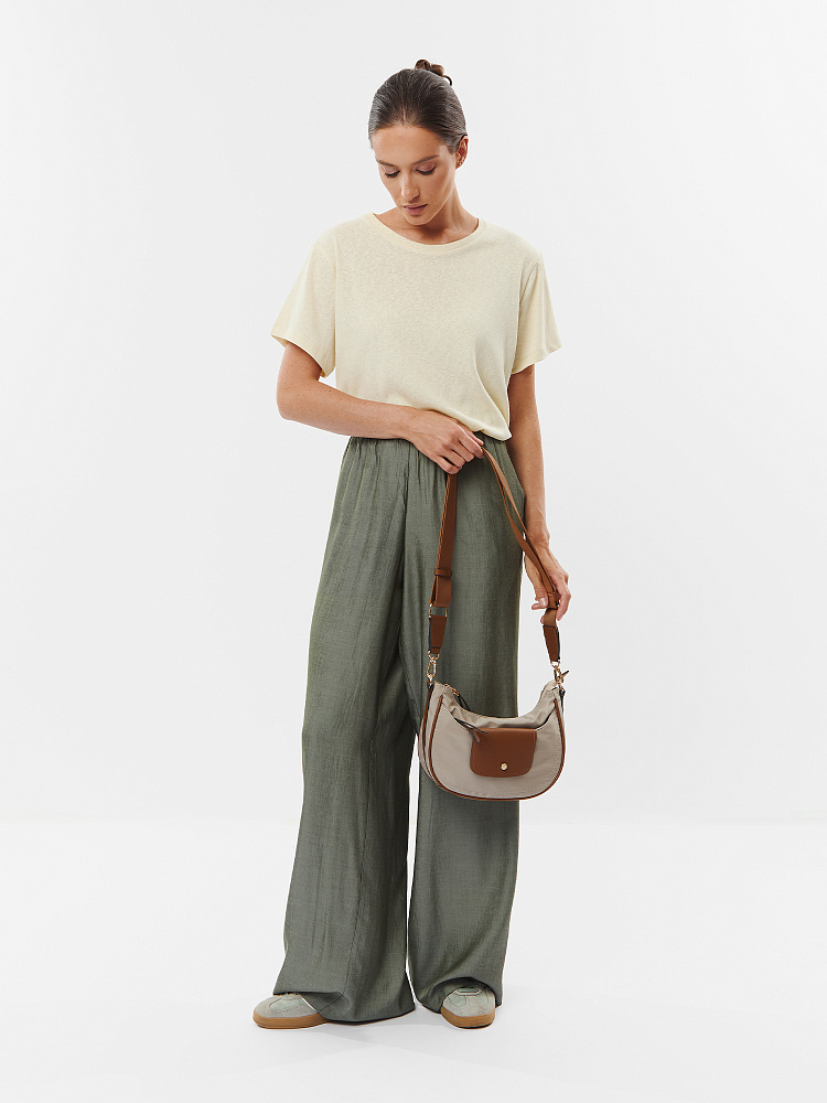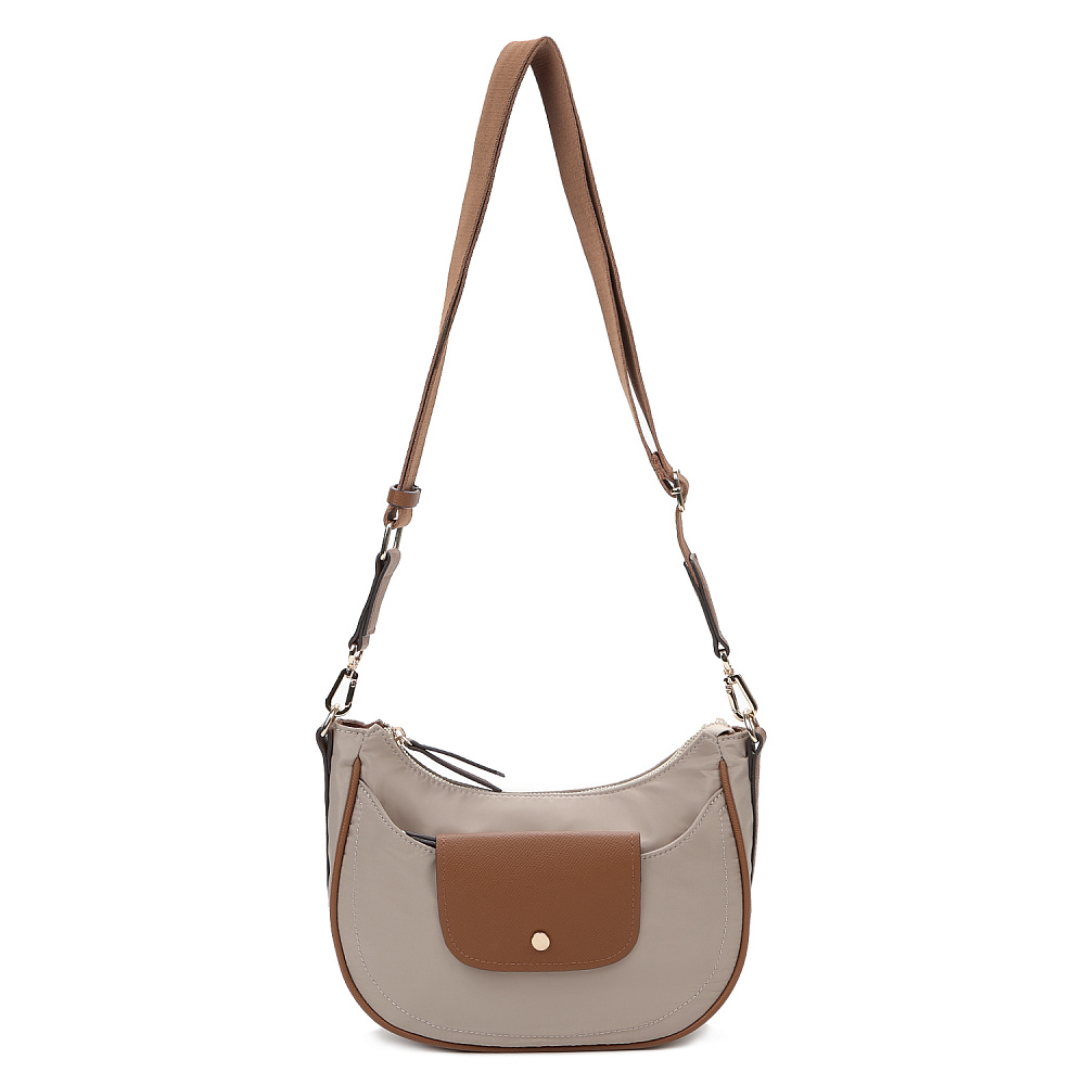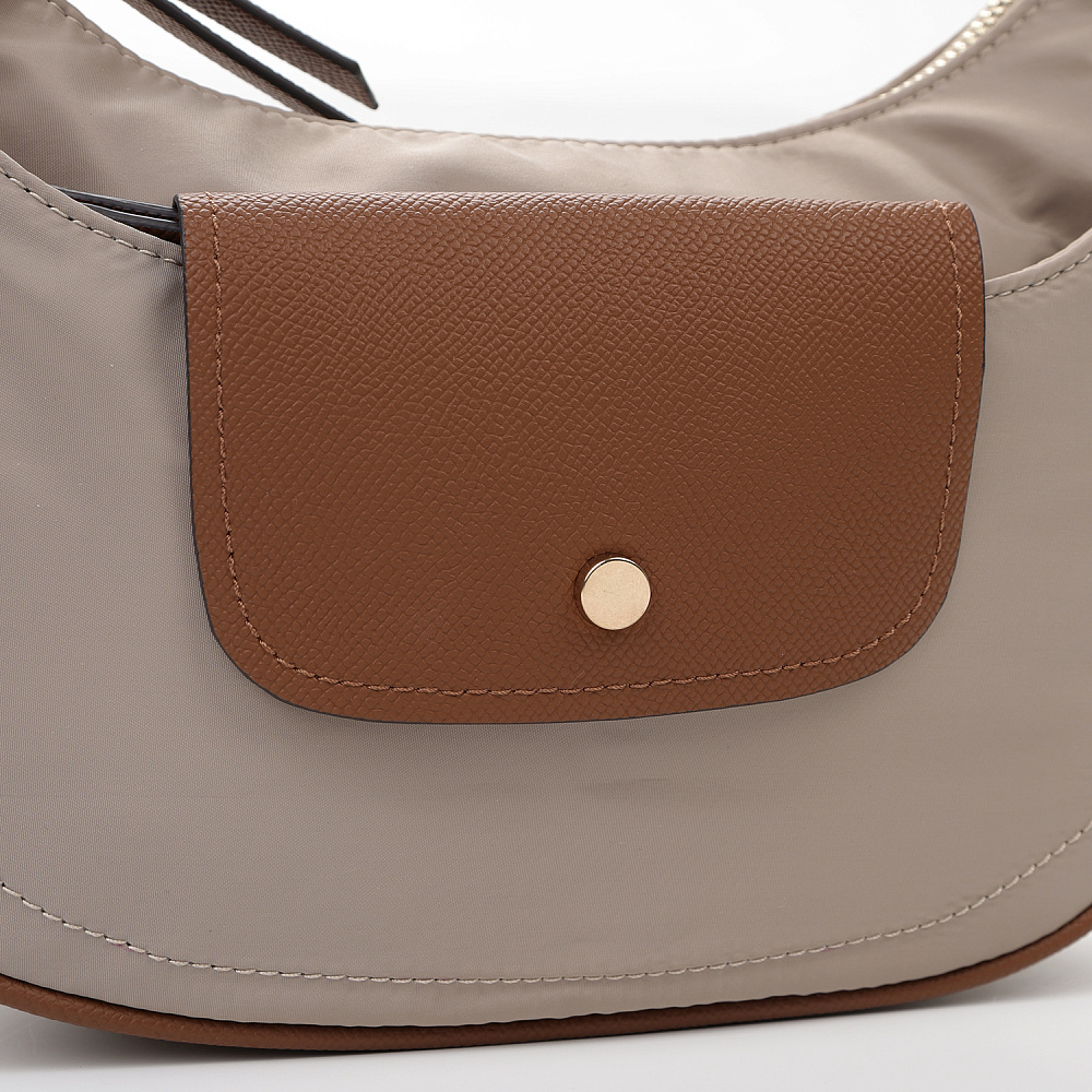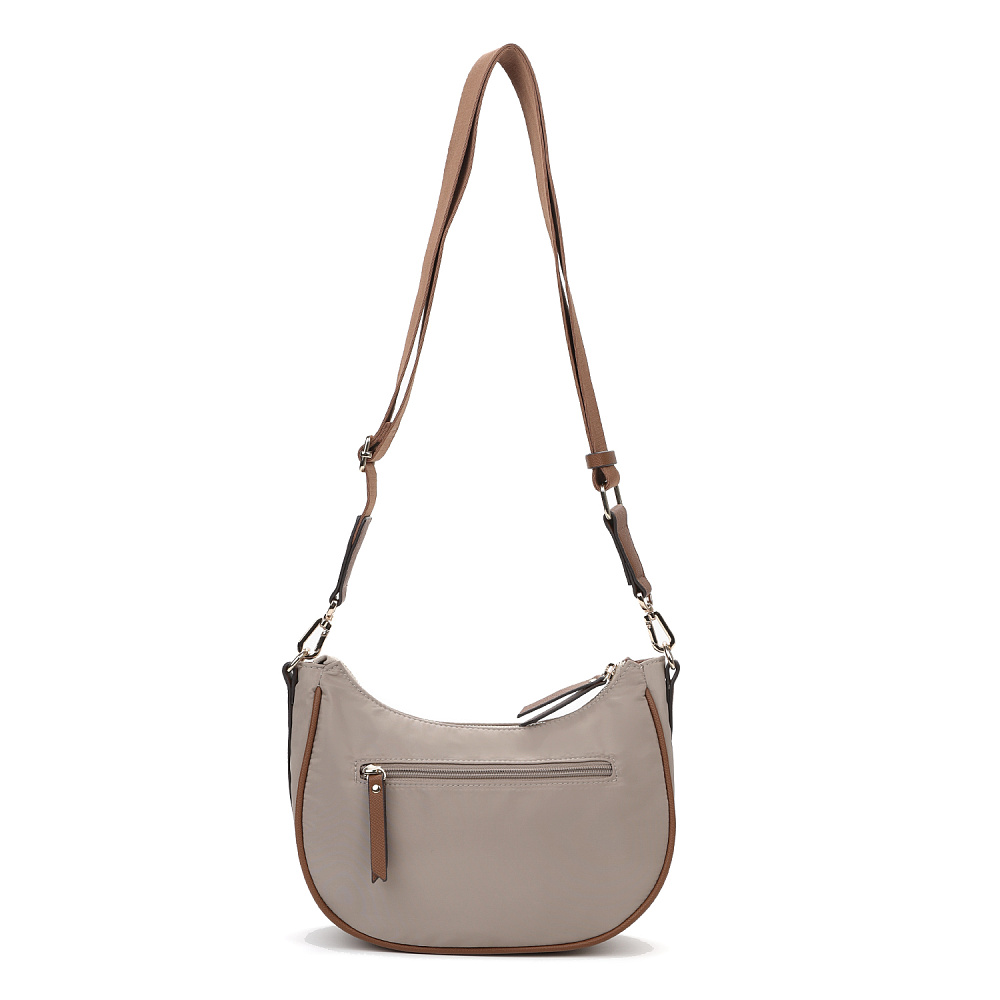 Изящная женская сумка кросс-боди в форме полумесяца из коллекции итальянского бренда FABRETTI в холодном серо-бежевом цвете. Стильная и продуманная модель, соответствующая мировым трендам сезона.Единственное отделение закрывается на молнию и дополнено внутренним карманом на молнии. На лицевой стороне небольшой карман на молнии, дополнительно закрывающийся клапаном с кнопкой. На тыльной стороне карман быстрого доступа на молнии. Съемный текстильный ремень регулируется по размеру.У модели строгий и лаконичный декор из коричневой экокожи с тиснением «сафьяно»: клапан на кармане, поводки на молниях, отделка ремня; сохранять форму сумке помогает жесткий кожаный кант по длине. Эксклюзивная плотная гладкая ткань с деликатным блеском имеет водоотталкивающие свойства. Цвет фурнитуры – золото. Длина ремня 120 см.