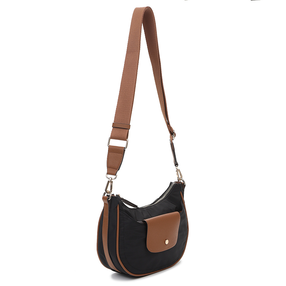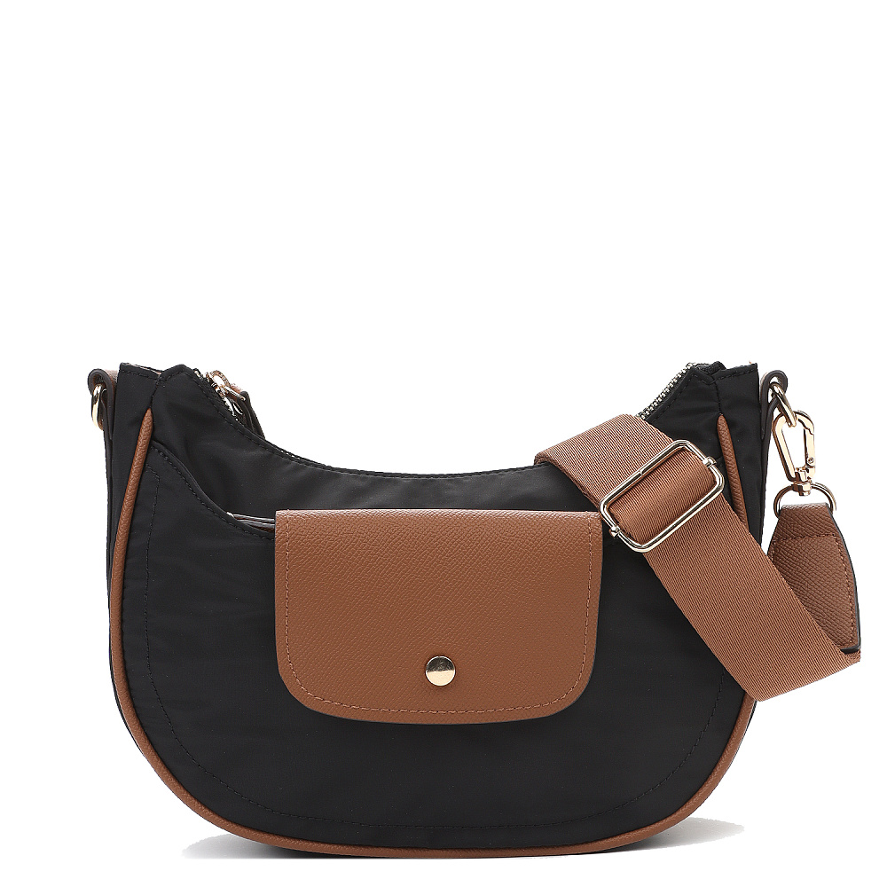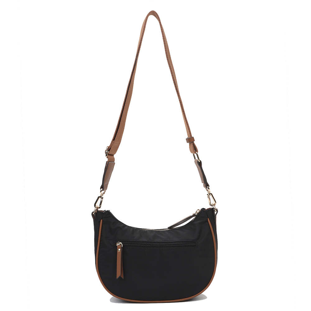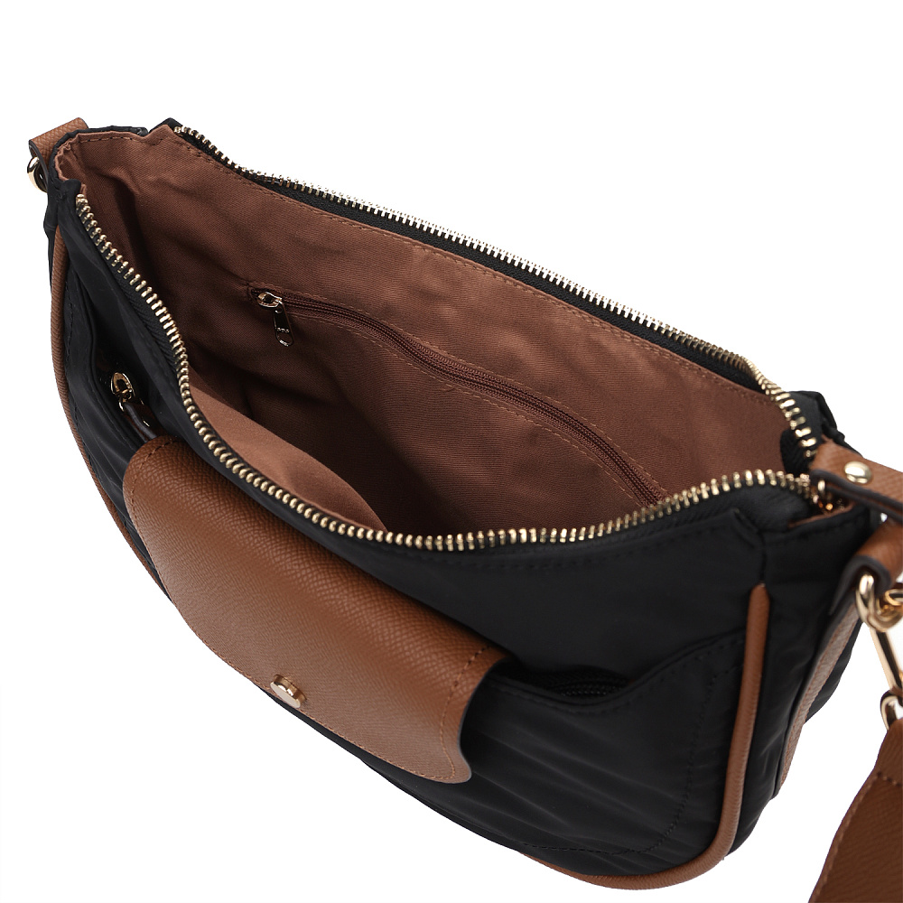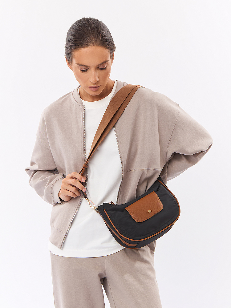 Изящная женская сумка кросс-боди в форме полумесяца из коллекции итальянского бренда FABRETTI насыщенного черного цвета. Стильная и продуманная модель, соответствующая мировым трендам сезона.Единственное отделение закрывается на молнию и дополнено внутренним карманом на молнии. На лицевой стороне небольшой карман на молнии, дополнительно закрывающийся клапаном с кнопкой. На тыльной стороне карман быстрого доступа на молнии. Съемный текстильный ремень регулируется по размеру.У модели строгий и лаконичный декор из коричневой экокожи с тиснением «сафьяно»: клапан на кармане, поводки на молниях, отделка ремня; сохранять форму сумке помогает жесткий кожаный кант по длине. Эксклюзивная плотная гладкая ткань с деликатным блеском имеет водоотталкивающие свойства. Цвет фурнитуры – золото. Длина ремня 120 см.
