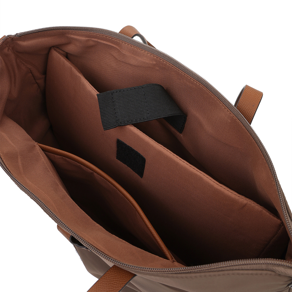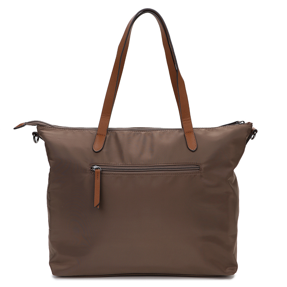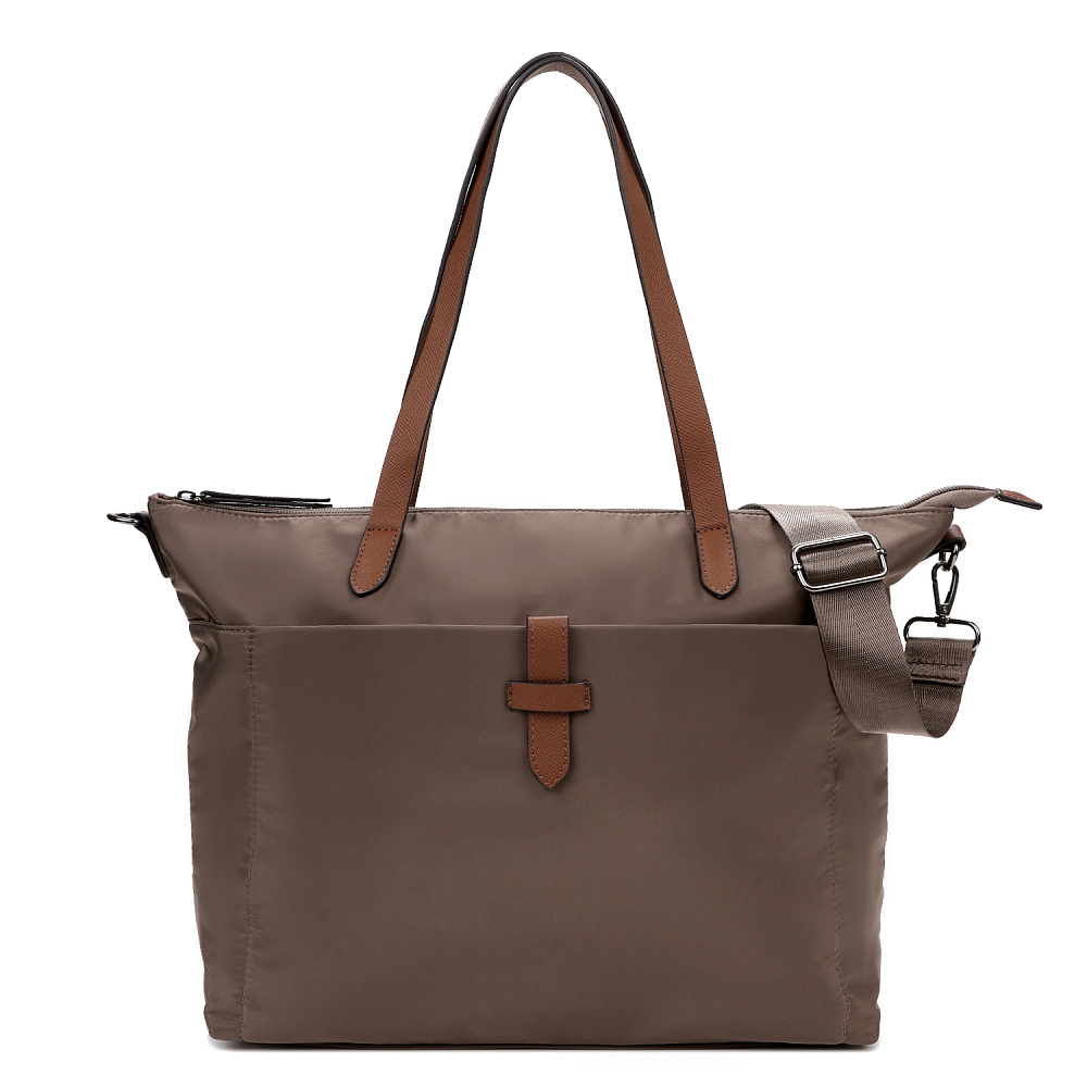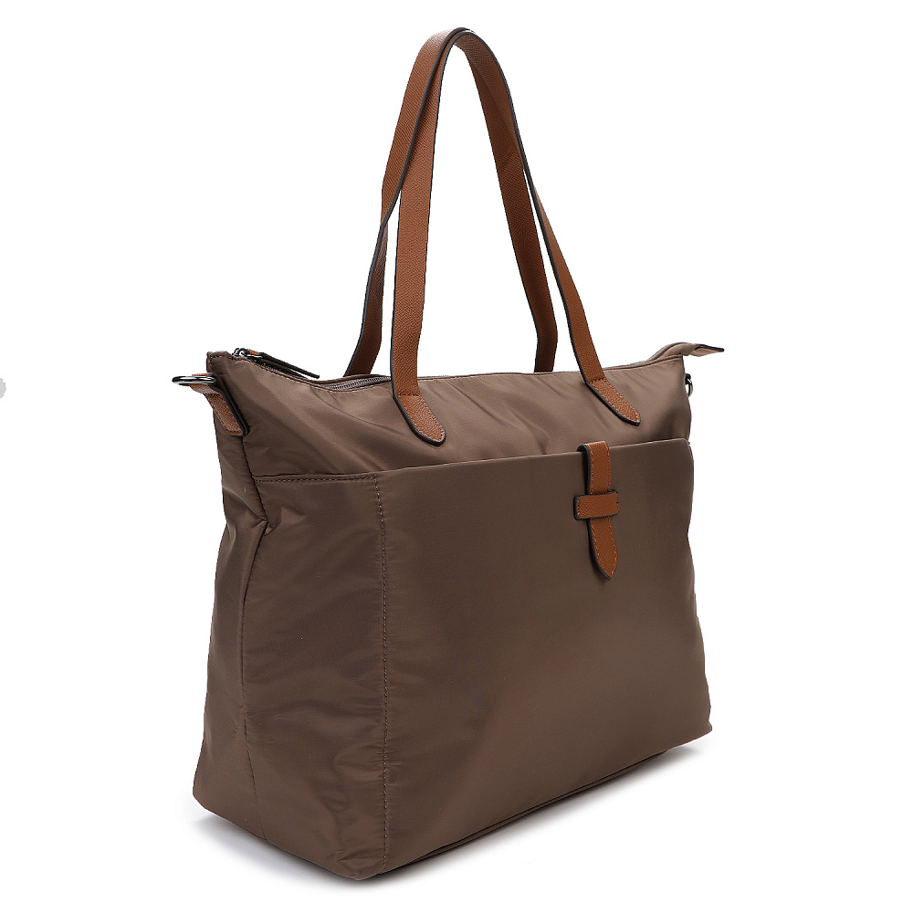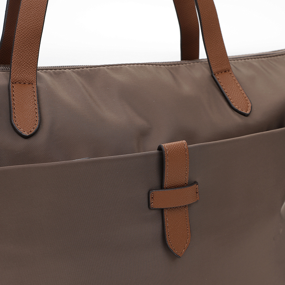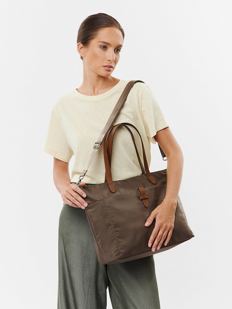 Вместительная женская сумка-тоут из коллекции итальянского бренда FABRETTI в холодном шоколадном оттенке. Основное отделение закрывается на молнию. У сумки одно отделение с большим открытым карманом и мягким карманом для планшета на липучке. На лицевой стороне вместительный карман на молнии, украшенный ремешком из экокожи. На тыльной стороне карман быстрого доступа на молнии. Сумка дополнена ручками из экокожи и съемным регулируемым текстильным ремнем на карабинах.Эксклюзивная плотная гладкая ткань с деликатным блеском имеет водоотталкивающие свойства.Лаконичный декор модели – ремешок на кармане, поводки на молниях и ручки - выполнен из коричневой экокожи с тиснением «сафьяно».Это универсальный аксессуар для города и путешествий: её лаконичный дизайн сочетается с любым городским образом, а функциональный размер удобен для небольших поездок.Сумка вмещает формат А4. Цвет фурнитуры – черненый никель. Длина ремня 140 см.