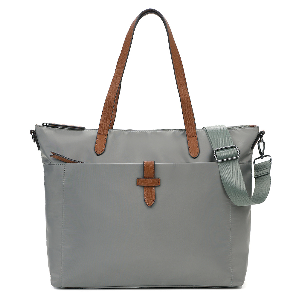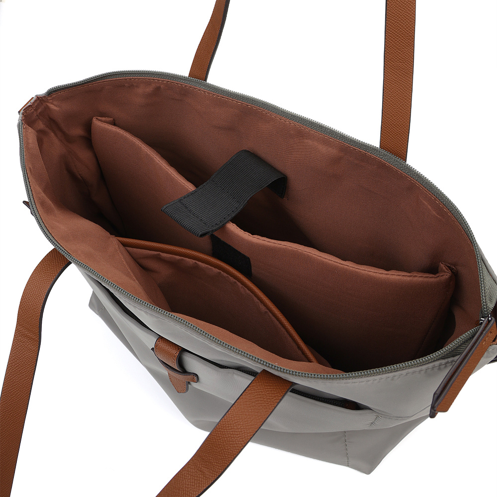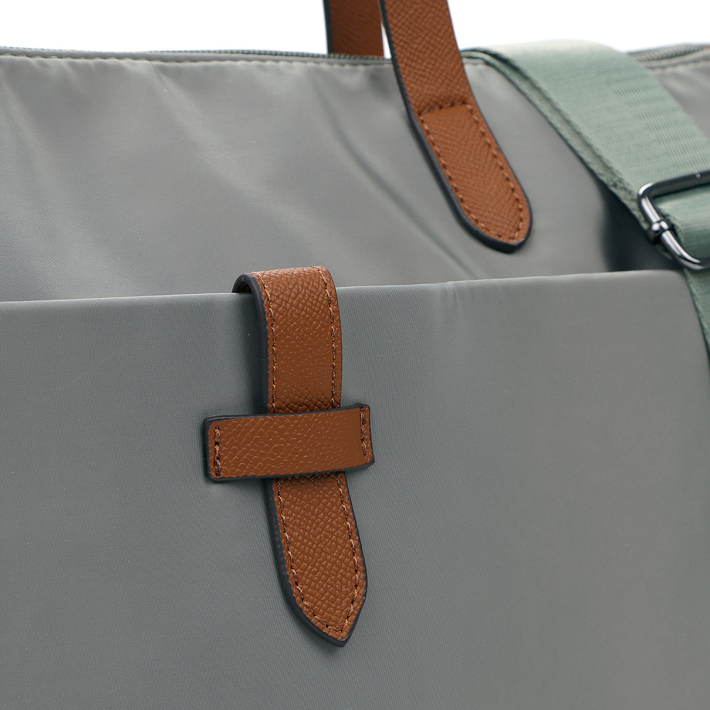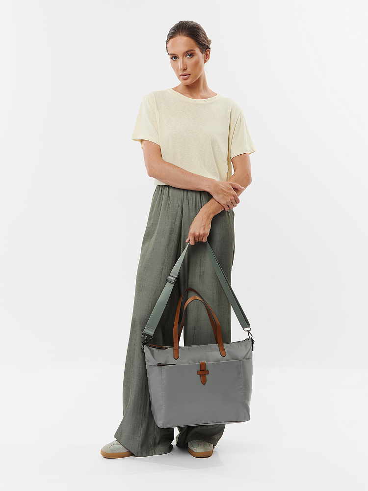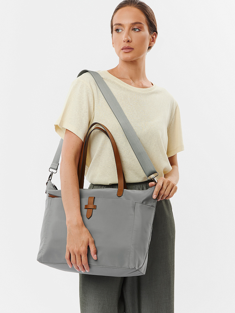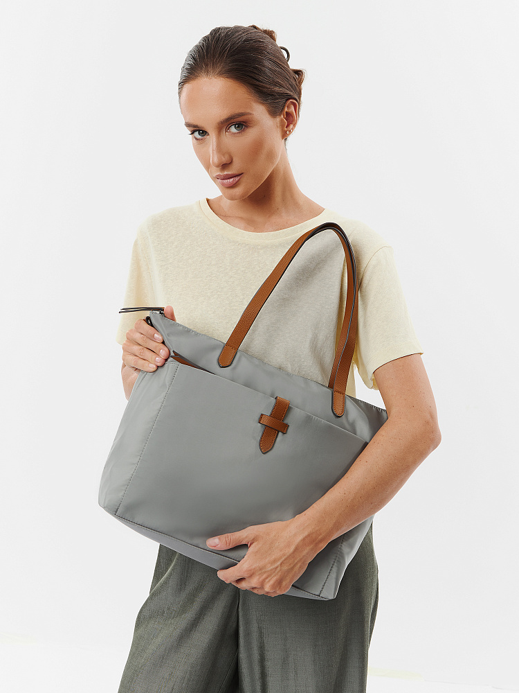 Вместительная женская сумка-тоут из коллекции итальянского бренда FABRETTI в холодном сером оттенке. Основное отделение закрывается на молнию. У сумки одно отделение с большим открытым карманом и мягким карманом для планшета на липучке. На лицевой стороне вместительный карман на молнии, украшенный ремешком из экокожи. На тыльной стороне карман быстрого доступа на молнии. Сумка дополнена ручками из экокожи и съемным регулируемым текстильным ремнем на карабинах.Эксклюзивная плотная гладкая ткань с деликатным блеском имеет водоотталкивающие свойства.Лаконичный декор модели – ремешок на кармане, поводки на молниях и ручки - выполнен из коричневой экокожи с тиснением «сафьяно».Это универсальный аксессуар для города и путешествий: её лаконичный дизайн сочетается с любым городским образом, а функциональный размер удобен для небольших поездок.Сумка вмещает формат А4. Цвет фурнитуры – черненый никель. Длина ремня 140 см.