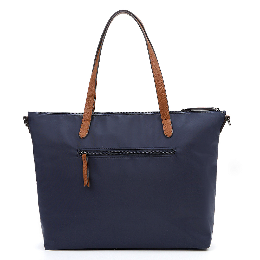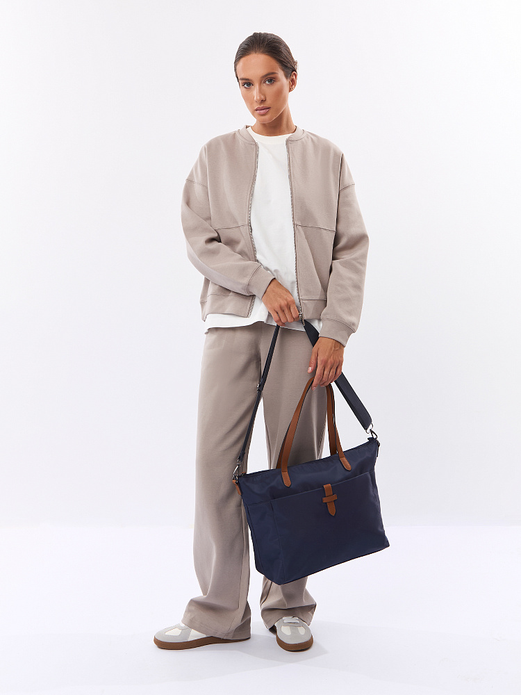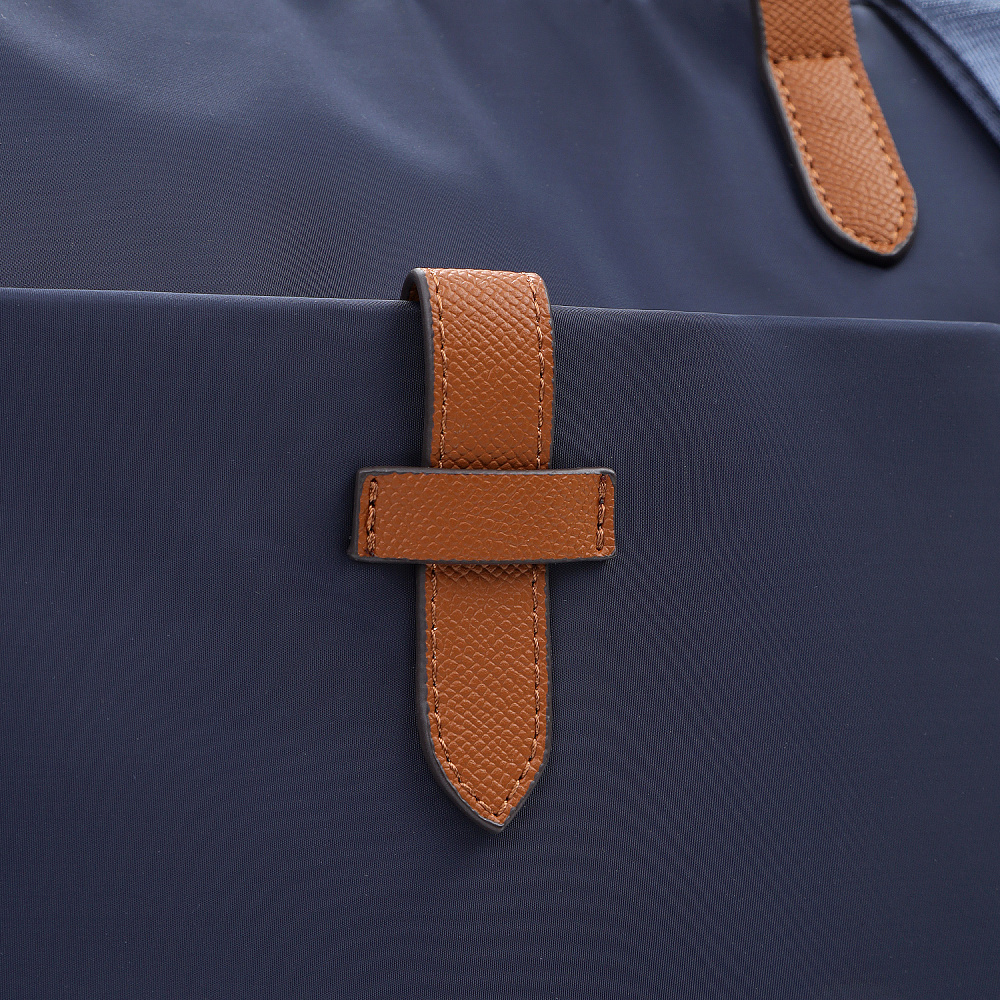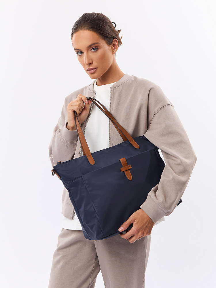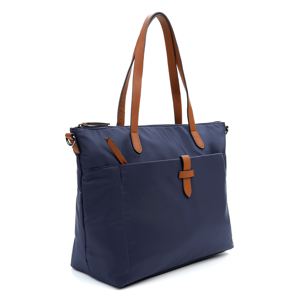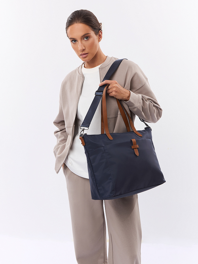 Вместительная женская сумка-тоут из коллекции итальянского бренда FABRETTI в благородном синем оттенке. Основное отделение закрывается на молнию. У сумки одно отделение с большим открытым карманом и мягким карманом для планшета на липучке. На лицевой стороне вместительный карман на молнии, украшенный ремешком из экокожи. На тыльной стороне карман быстрого доступа на молнии. Сумка дополнена ручками из экокожи и съемным регулируемым текстильным ремнем на карабинах.Эксклюзивная плотная гладкая ткань с деликатным блеском имеет водоотталкивающие свойства.Лаконичный декор модели – ремешок на кармане, поводки на молниях и ручки - выполнен из коричневой экокожи с тиснением «сафьяно».Это универсальный аксессуар для города и путешествий: её лаконичный дизайн сочетается с любым городским образом, а функциональный размер удобен для небольших поездок.Сумка вмещает формат А4. Цвет фурнитуры – черненый никель. Длина ремня 140 см.