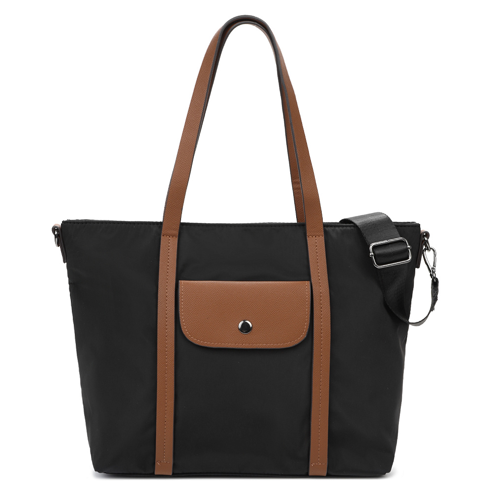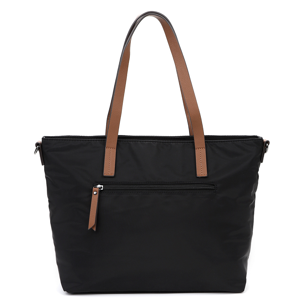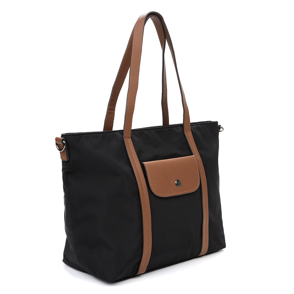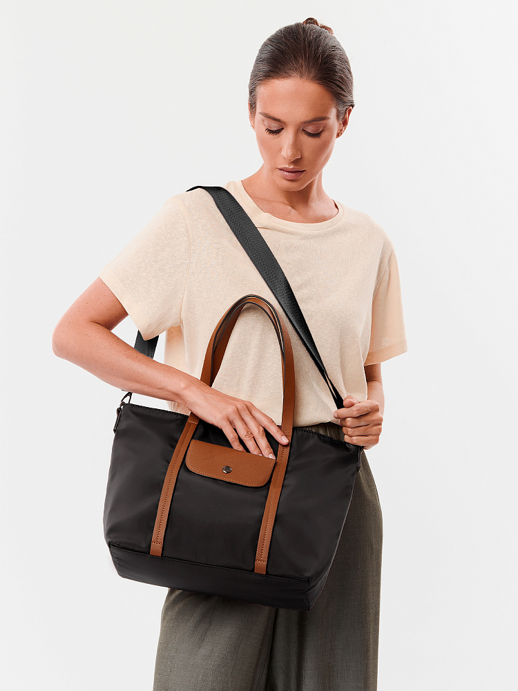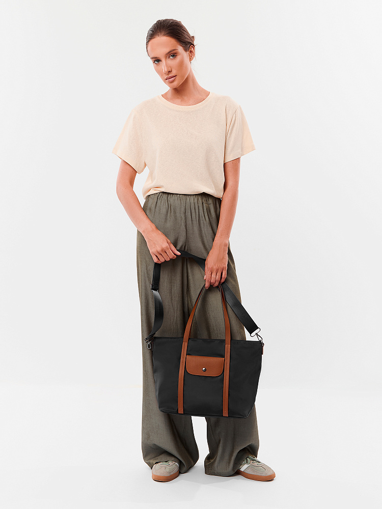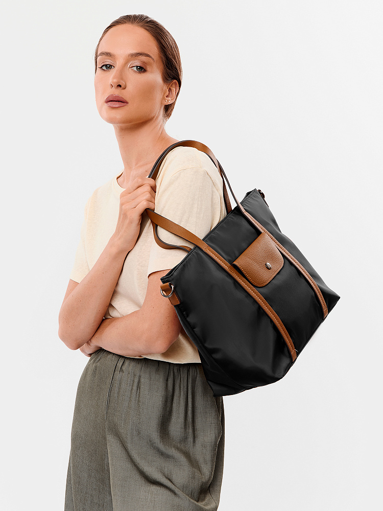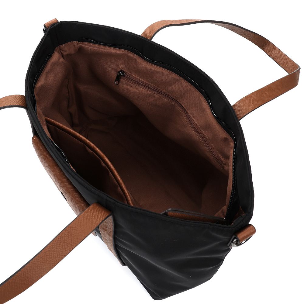 Лаконичная и стильная женская сумка-тоут из коллекции итальянского бренда FABRETTI, выполненная в черном цвете. Эксклюзивная плотная гладкая ткань с деликатным блеском имеет водоотталкивающие свойства.Основное отделение закрывается на молнию. У сумки одно отделение с двумя внутренними карманами - открытым и на молнии. На лицевой части расположен небольшой вертикальный карман с клапаном на магните. На тыльной стороне карман быстрого доступа на молнии. Сумка дополнена ручками из экокожи и съемным регулируемым текстильным ремнем на карабинах.Лаконичный декор модели – клапан кармана, поводки на молниях и ручки - выполнен из коричневой экокожи с тиснением «сафьяно».Сумка вмещает формат А4. Цвет фурнитуры – черненый никель. Длина ремня 140 см.