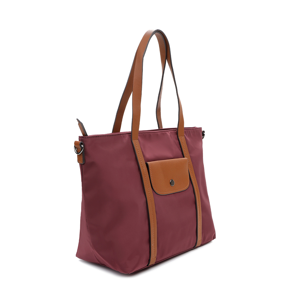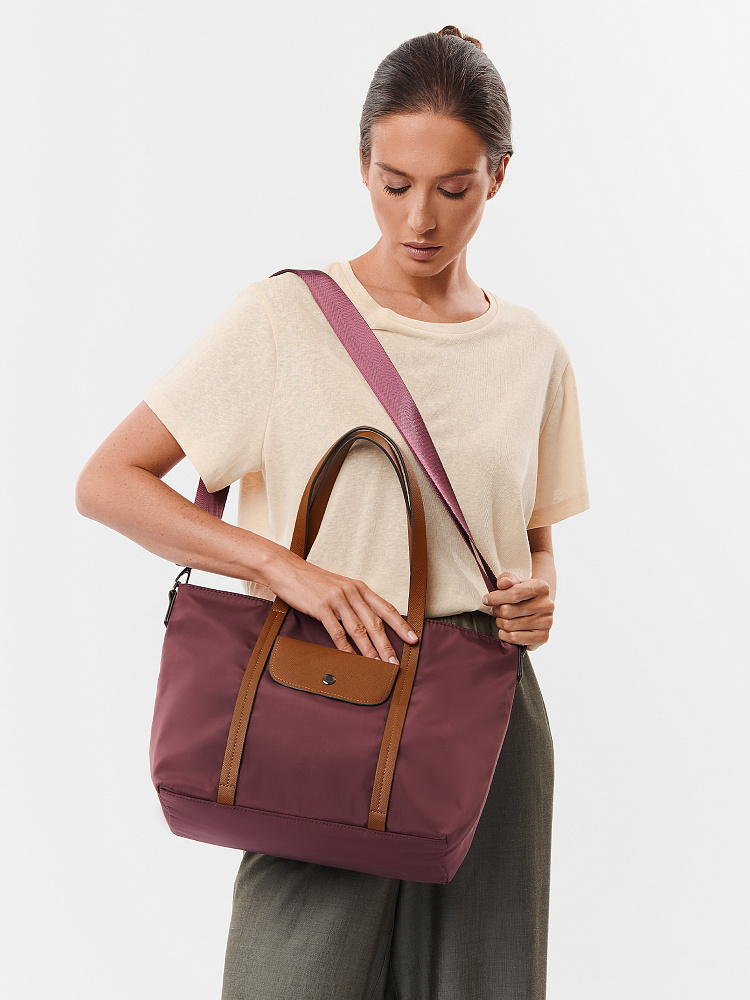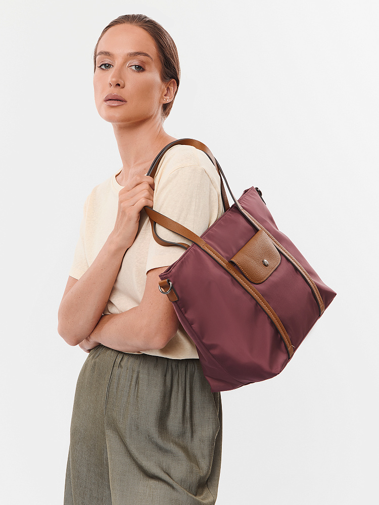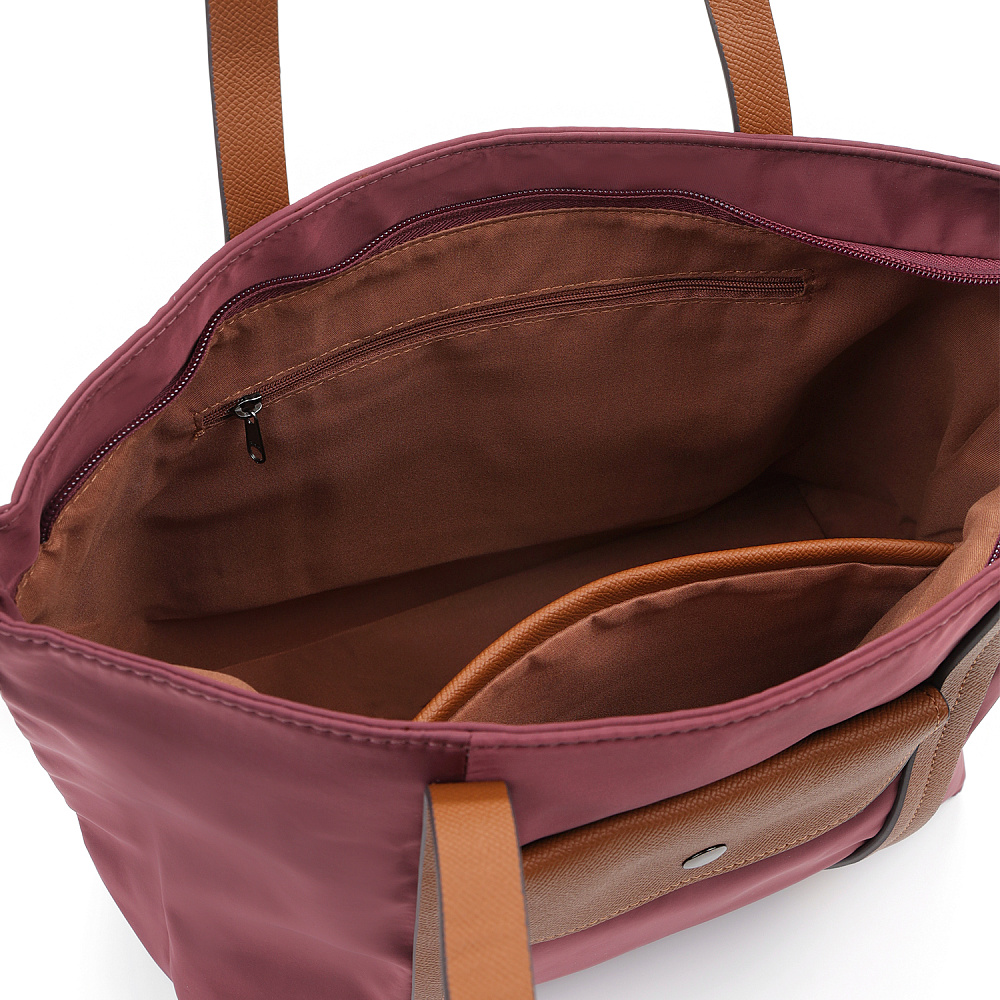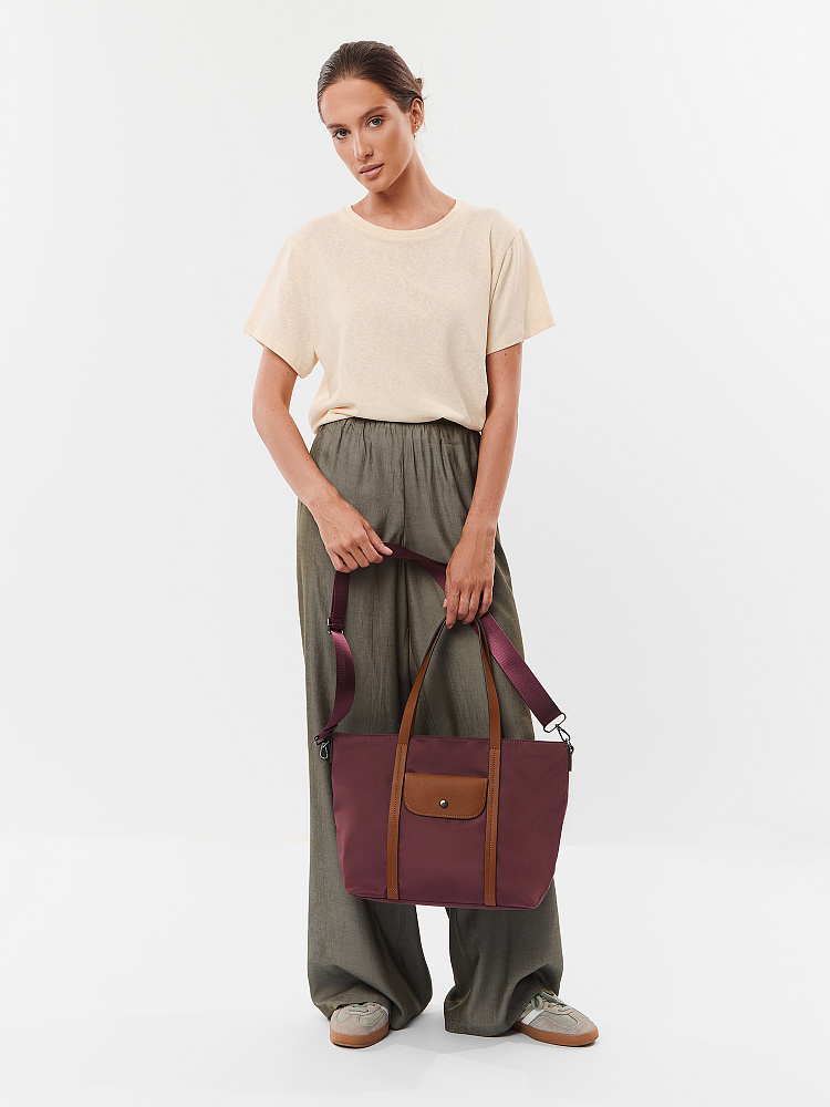 Лаконичная и стильная женская сумка-тоут из коллекции итальянского бренда FABRETTI, выполненная в насыщенном бордовом оттенке с отливом. Эксклюзивная плотная гладкая ткань с деликатным блеском имеет водоотталкивающие свойства.Основное отделение закрывается на молнию. У сумки одно отделение с двумя внутренними карманами - открытым и на молнии. На лицевой части расположен небольшой вертикальный карман с клапаном на магните. На тыльной стороне карман быстрого доступа на молнии. Сумка дополнена ручками из экокожи и съемным регулируемым текстильным ремнем на карабинах.Лаконичный декор модели – клапан кармана, поводки на молниях и ручки - выполнен из коричневой экокожи с тиснением «сафьяно».Сумка вмещает формат А4. Цвет фурнитуры – черненый никель. Длина ремня 140 см.