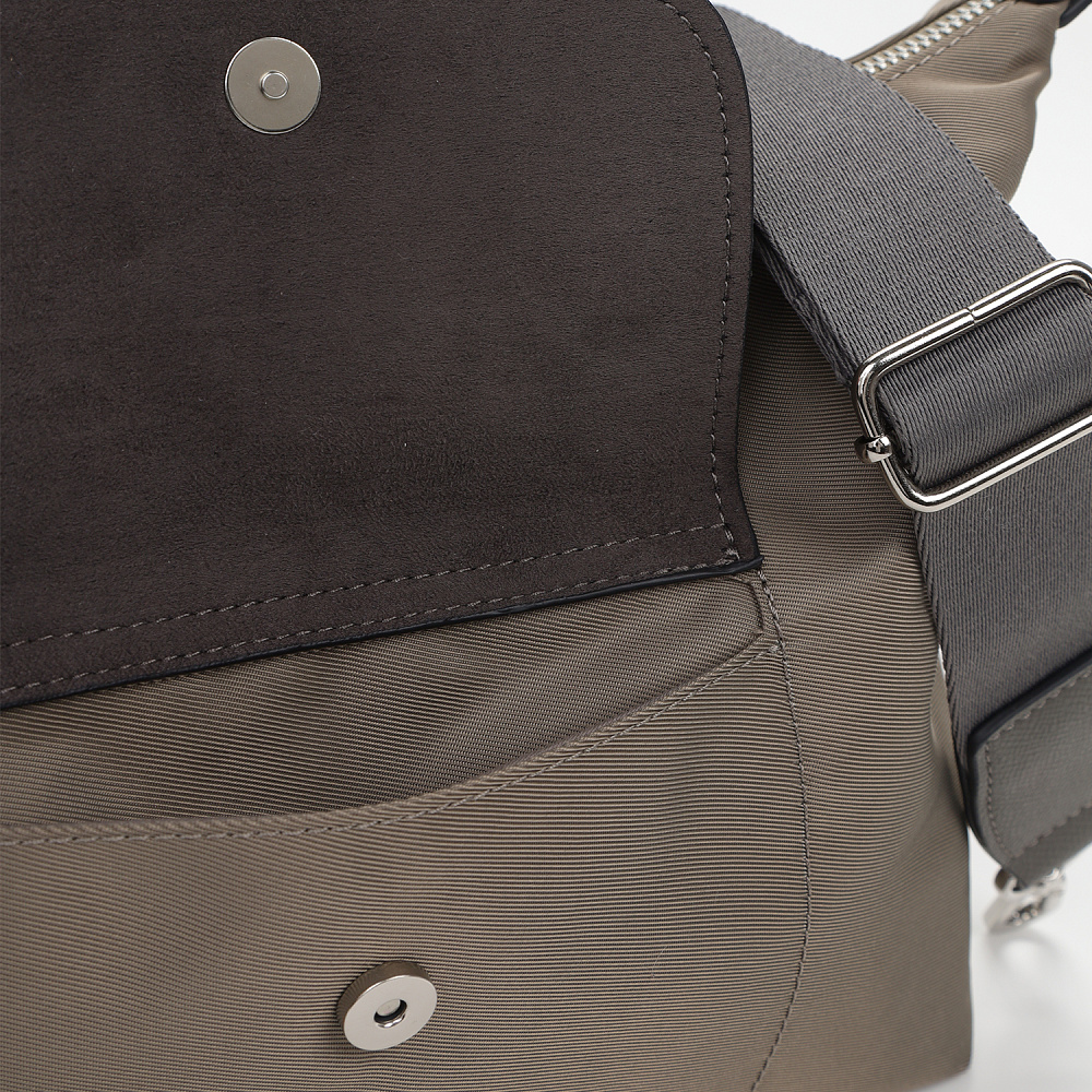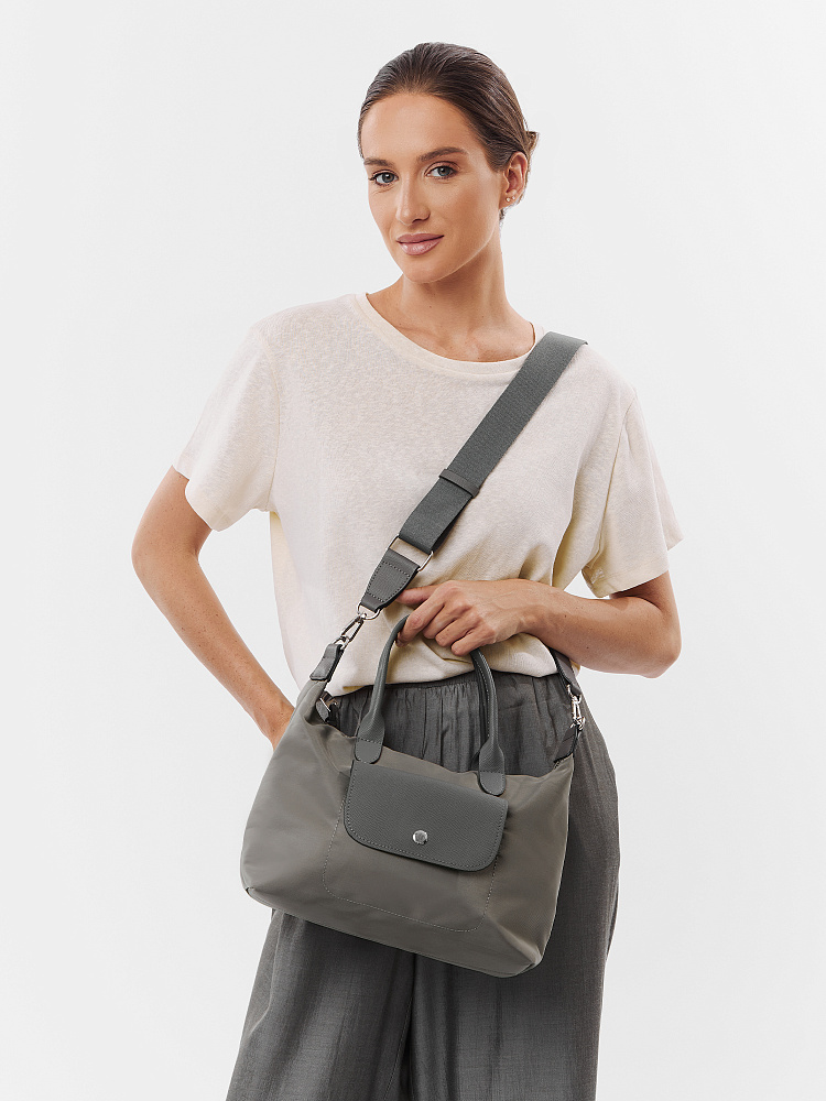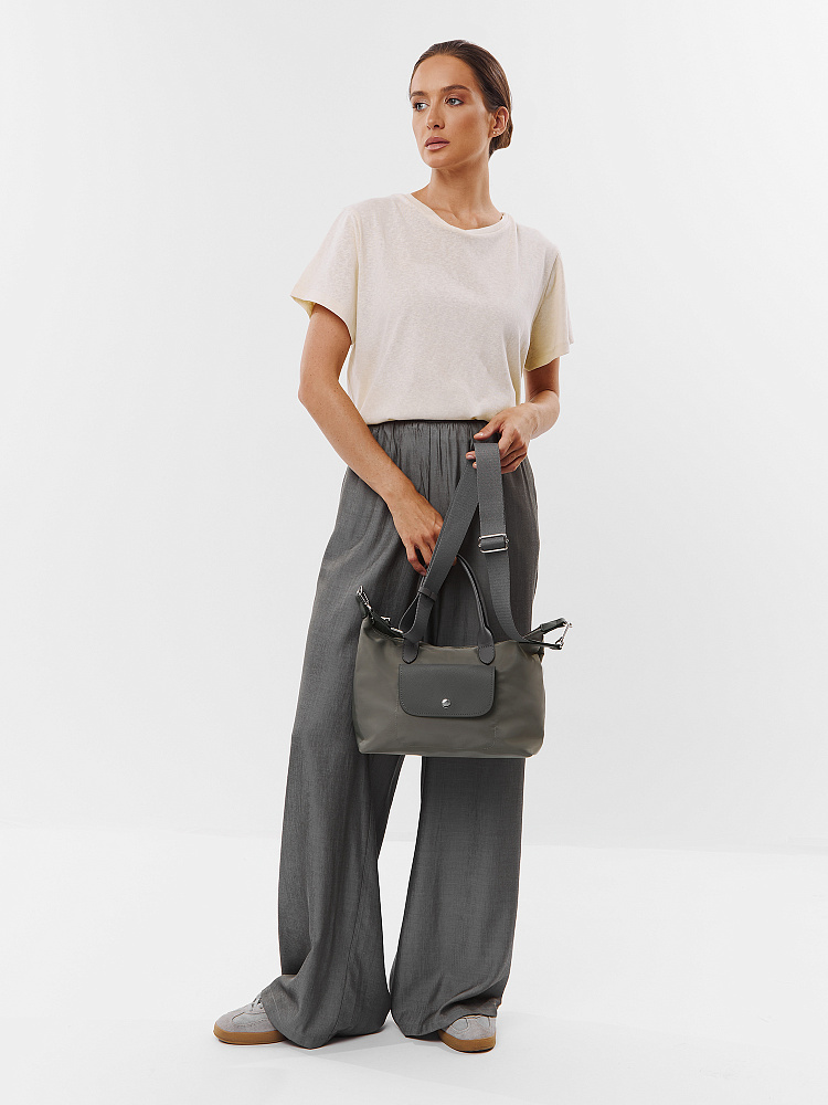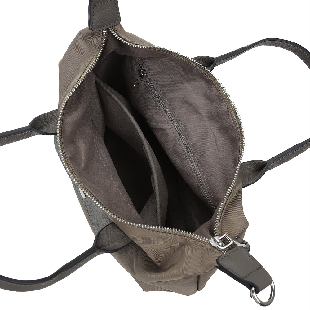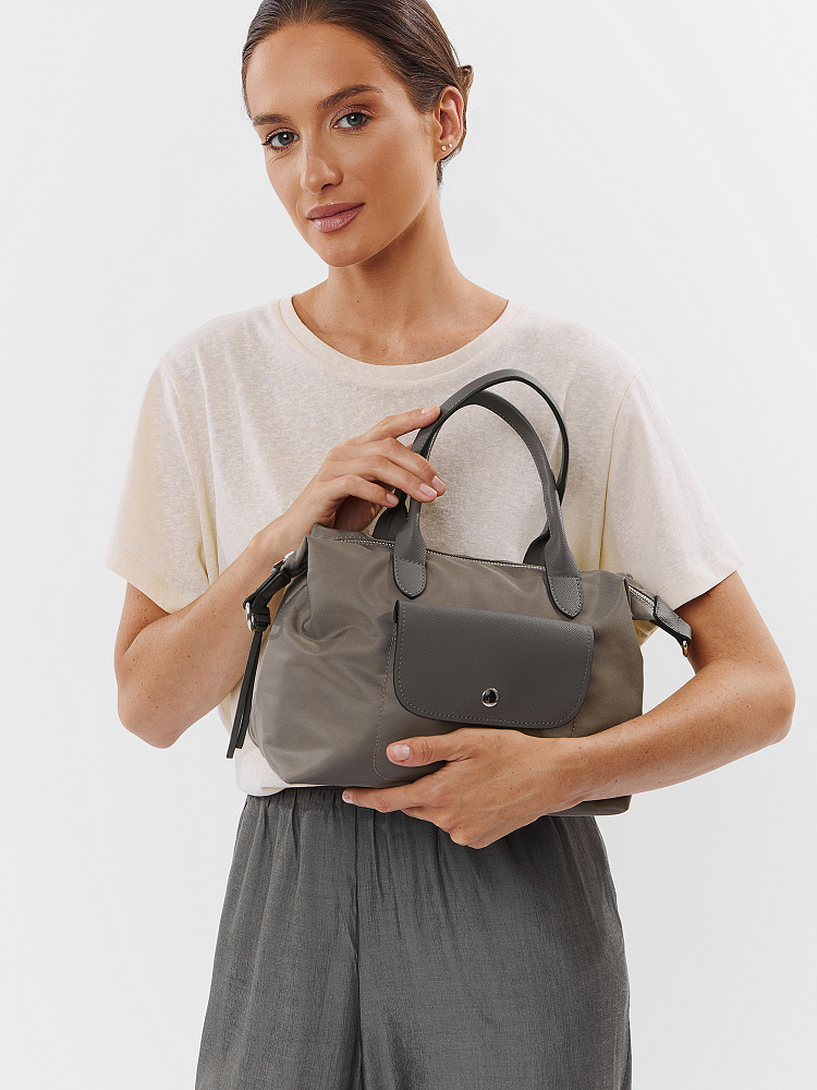 Миниатюрная женская сумка-тоут итальянского бренда FABRETTI в сложном холодном сером оттенке. Элегантная модель с трендовым дизайном, которая идеально дополнит любой городской образ.У сумки одно отделение, закрывающееся на молнию. Внутри два кармана – открытый и на молнии. На лицевой стороне открытый карман с клапаном на кнопке, на тыльной – карман быстрого доступа на молнии. Сумка дополнена двумя видами съемных ручек – короткими ручками из экокожи и регулируемым текстильным плечевым ремнем.Декор сумки подчеркнуто лаконичен – ручки, клапан на кармане и поводки на молниях из экокожи с тиснением «сафьяно» в тон основному цвету. Эксклюзивная плотная ткань с характерным рисунком переплетения нитей имеет водоотталкивающие свойства.Цвет фурнитуры – серебро. Длина ремня 120 см.