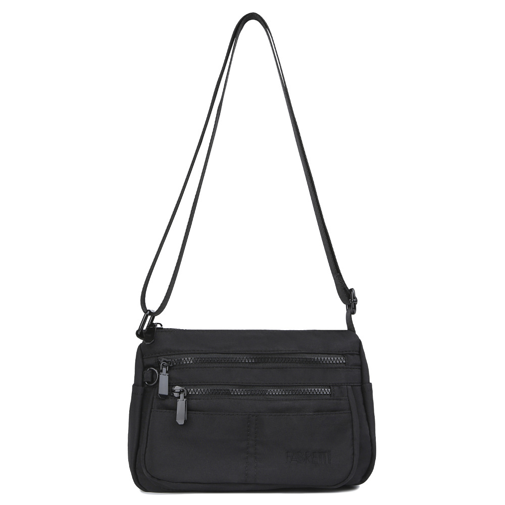 Текстильная сумка FABRETTI в черном оттенке выполнена из высокотехнологичного влагостойкого полиэстера. Модель имеет 2 отделения. В одном из них расположены 2 открытых кармана и один на молнии. На лицевой стороне находится один карман быстрого доступа и ещё один - на тыльной стороне. На сумке расположен карабин. Текстильный плечевой ремень регулируется по длине.