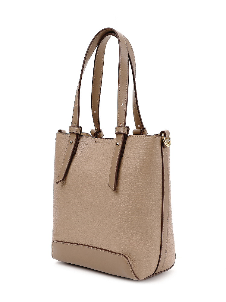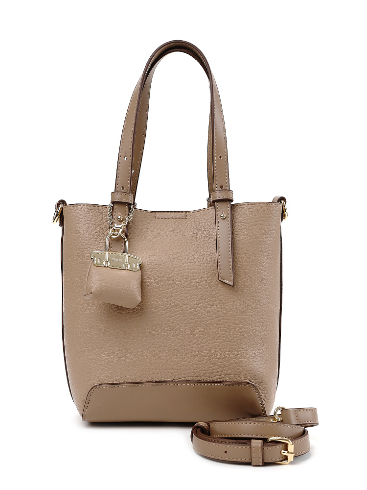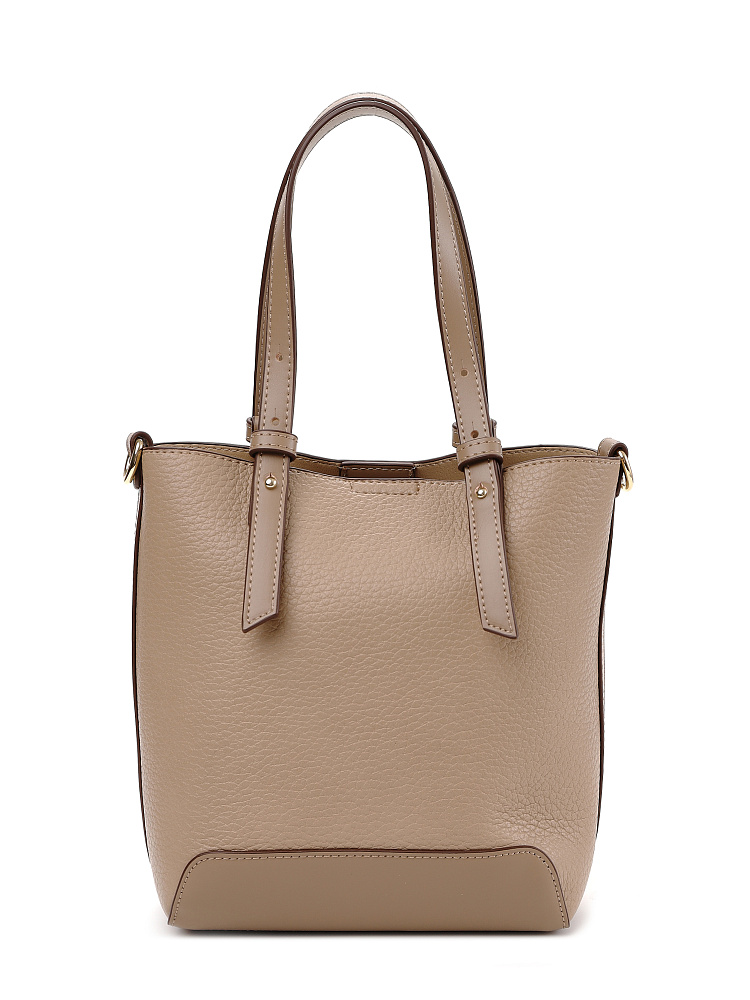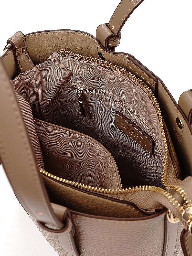 Необычная женская сумка кросс-боди итальянского бренда FABRETTI интересно комбинирует материалы – основа сумки выполнена из нежной зернистой экокожи, отделка - из более плотной и прочной гладкой. Сумка выполнена в теплом кофейно-бежевом оттенке, который отлично сочетается с летним гардеробом в натуральных тонах.У модели вертикальный формат (сумка-ведро), основное отделение с текстильной подкладкой закрывается на молнию и дополнительно крепится к жесткому каркасу магнитными кнопками. Внутри открытый карман и на молнии.Короткие ручки из жесткой экокожи регулируются по высоте. Съемный ремень на карабинах регулируется по длине пряжкой. Модель дополнена небольшим съемным брелоком в виде сумочки.Длина ремня ок. 135 см. Цвет фурнитуры – золото.