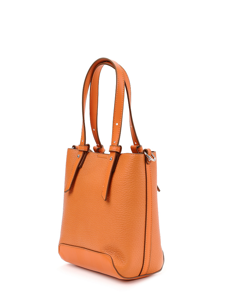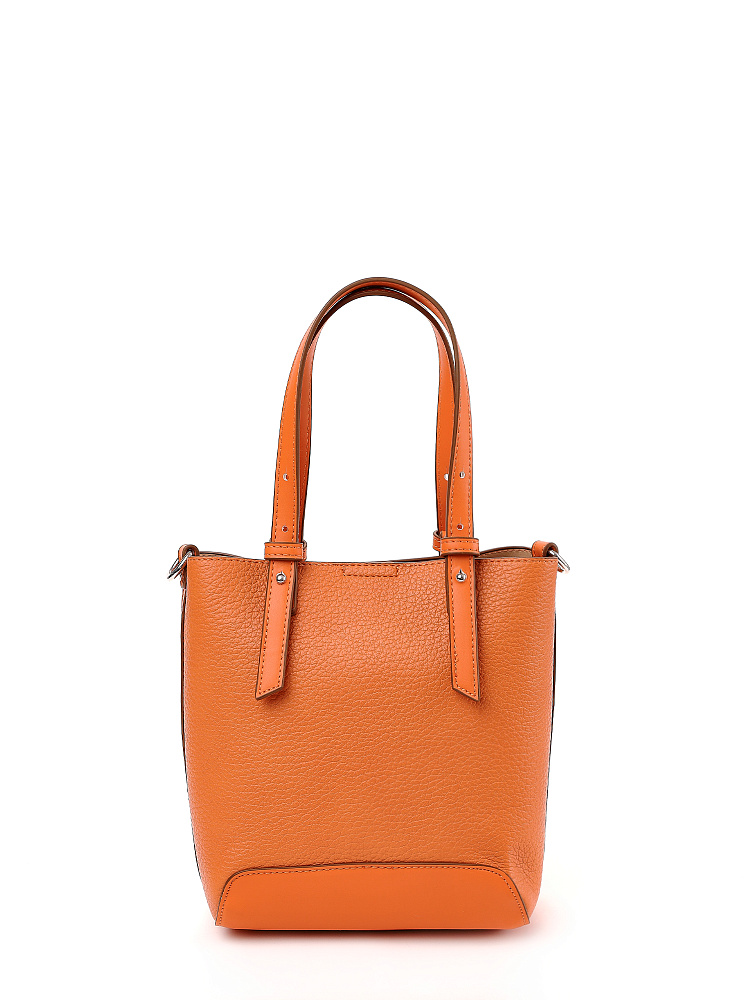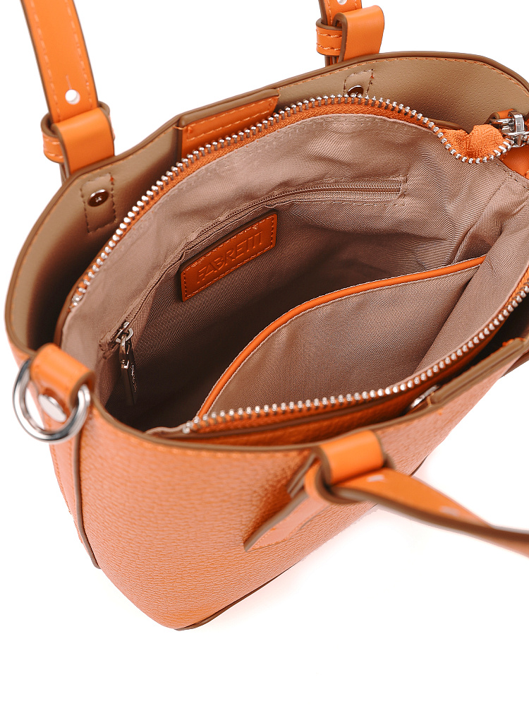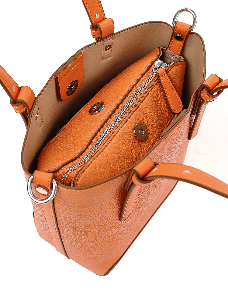 Необычная женская сумка кросс-боди итальянского бренда FABRETTI интересно комбинирует материалы – основа сумки выполнена из нежной зернистой экокожи, отделка - из более плотной и прочной гладкой. Сумка выполнена в теплом светлом оранжевом оттенке, который отлично сочетается с легким летним гардеробом.У модели вертикальный формат (сумка-ведро), основное отделение с текстильной подкладкой закрывается на молнию и дополнительно крепится к жесткому каркасу магнитными кнопками. Внутри открытый карман и на молнии.Короткие ручки из жесткой экокожи регулируются по высоте. Съемный ремень на карабинах регулируется по длине пряжкой. Модель дополнена небольшим съемным брелоком в виде сумочки.Длина ремня ок. 135 см. Цвет фурнитуры – серебро.