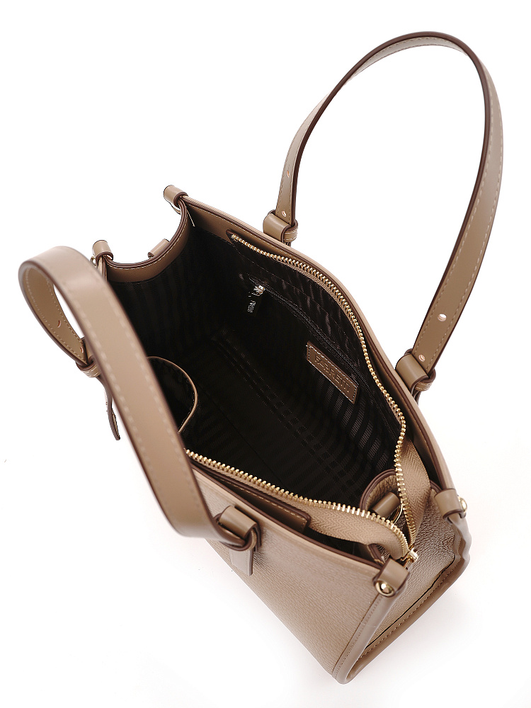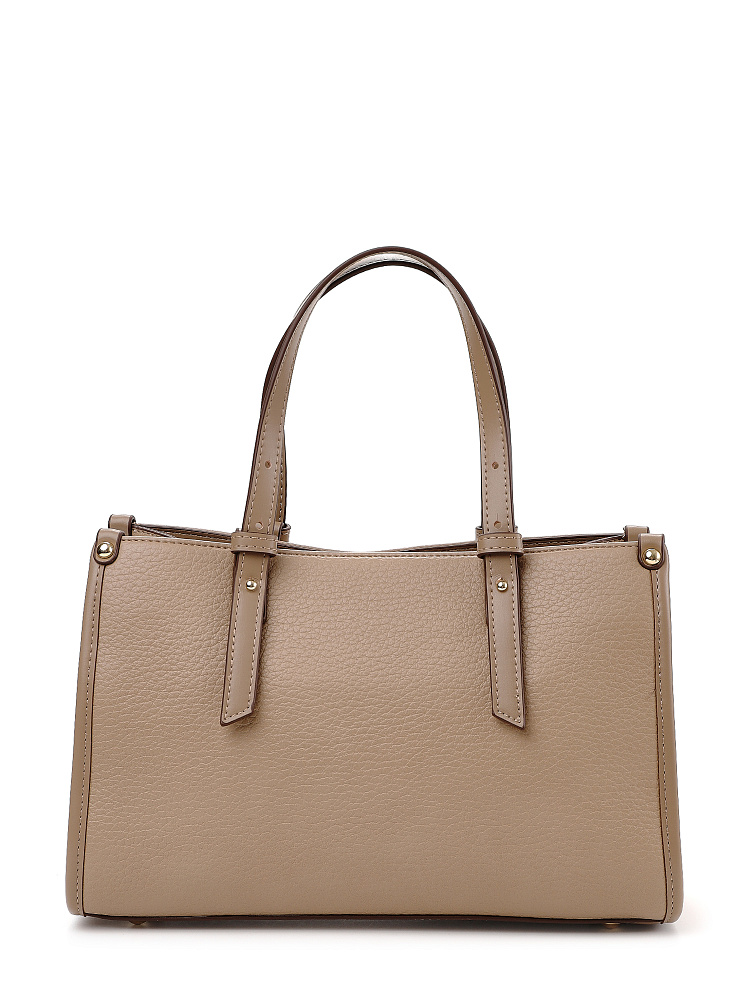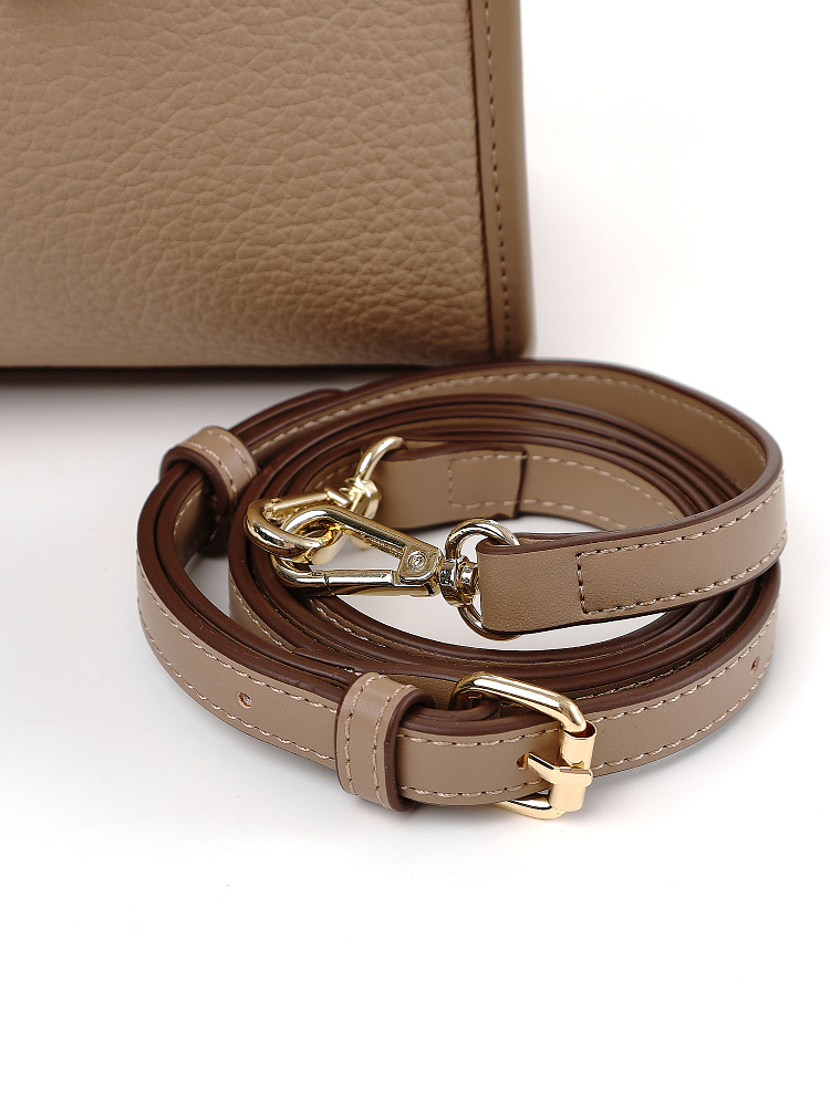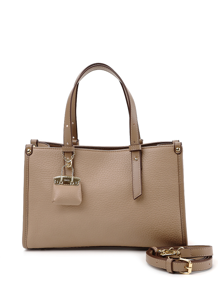 Классическая женская сумка кросс-боди итальянского бренда FABRETTI с интересной комбинацией фактур: основа сумки выполнена из нежной зернистой экокожи, отделка - из более плотной и прочной гладкой. Сумка выполнена в нежном кофейно-бежевом тоне, который прекрасно сочетается и со светлыми вещами, и - на контрасте - с темными холодными оттенками.У модели четкая прямоугольная форма, по бокам декоративные заклепки. Дно усилено гладкой жесткой экокожей и дополнено металлическими ножками.У сумки одно отделение на молнии. Внутри два открытых кармана и один на молнии.Короткие ручки из жесткой экокожи регулируются по высоте. Съемный ремень на карабинах регулируется по длине пряжкой. Модель дополнена небольшим съемным брелоком в виде сумочки.Длина ремня ок. 140 см. Цвет фурнитуры – золото.