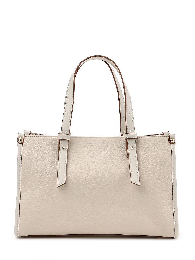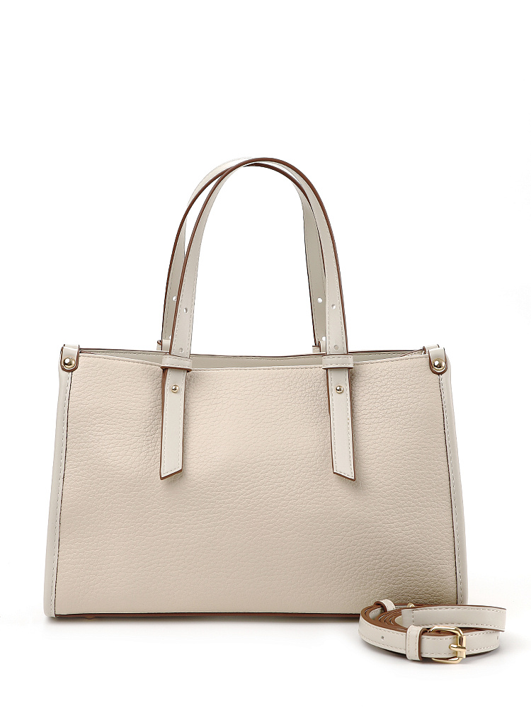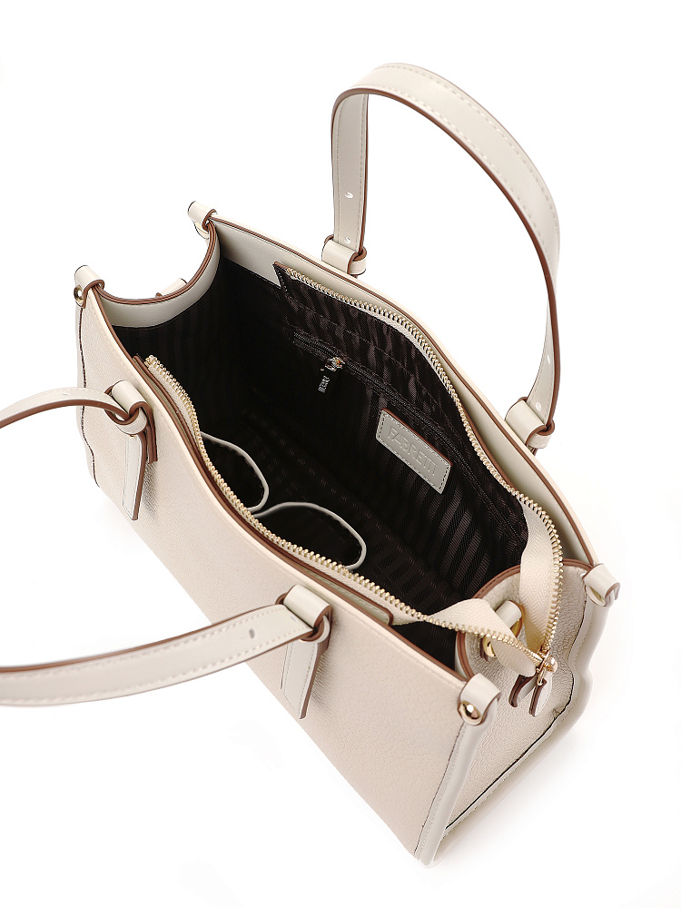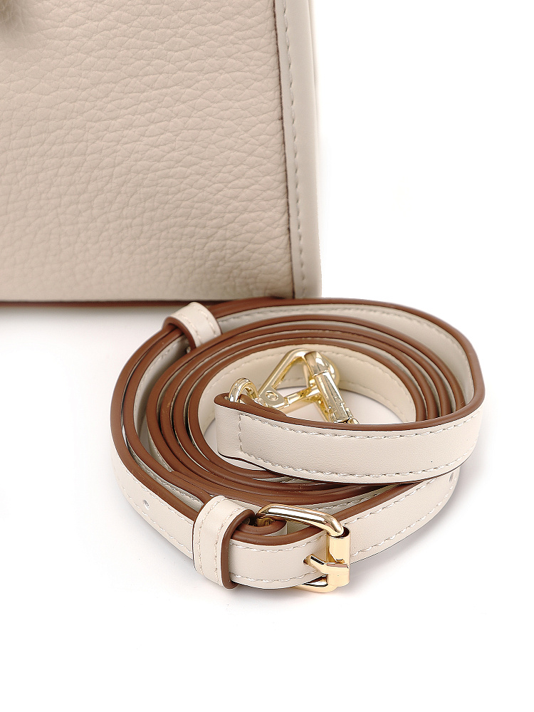 Классическая женская сумка кросс-боди итальянского бренда FABRETTI с интересной комбинацией фактур: основа сумки выполнена из нежной зернистой экокожи, отделка - из более плотной и прочной гладкой. Сумка выполнена в нежном светло-бежевом тоне, который прекрасно сочетается и со светлыми вещами, и - на контрасте - с темными холодными оттенками.У модели четкая прямоугольная форма, по бокам декоративные заклепки. Дно усилено гладкой жесткой экокожей и дополнено металлическими ножками.У сумки одно отделение на молнии. Внутри два открытых кармана и один на молнии.Короткие ручки из жесткой экокожи регулируются по высоте. Съемный ремень на карабинах регулируется по длине пряжкой. Модель дополнена небольшим съемным брелоком в виде сумочки.Длина ремня ок. 140 см. Цвет фурнитуры – золото.