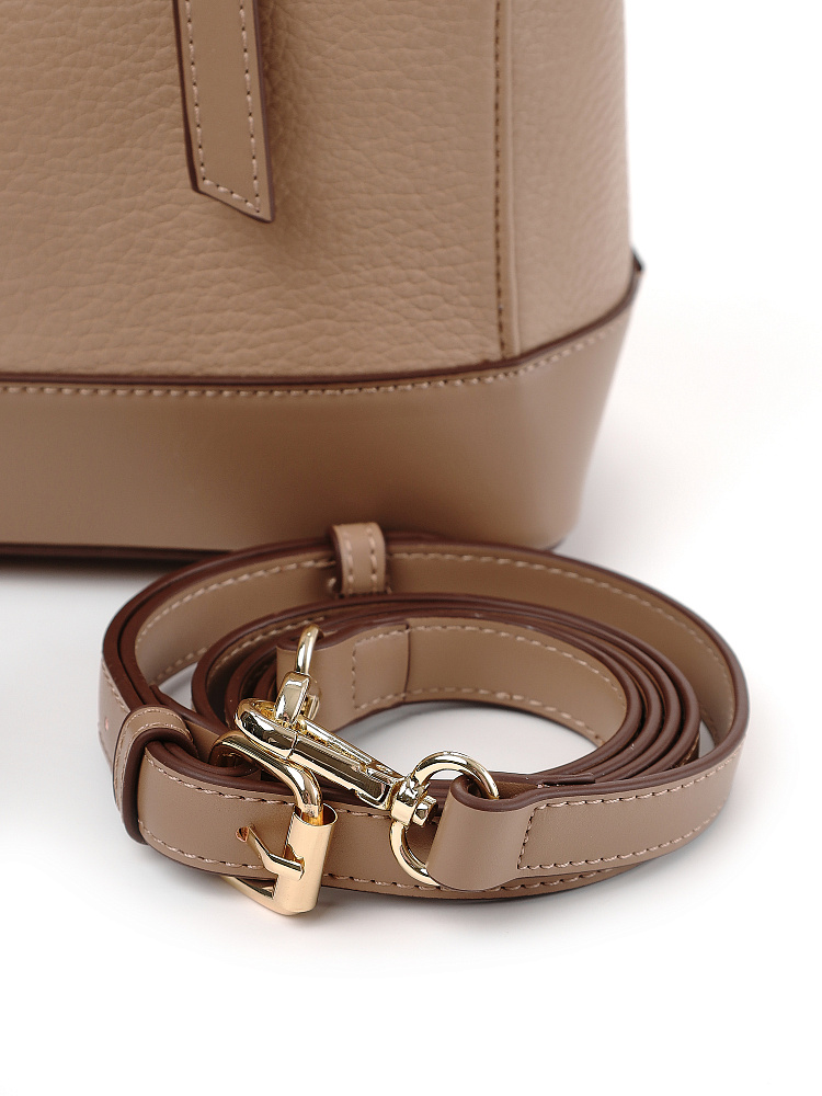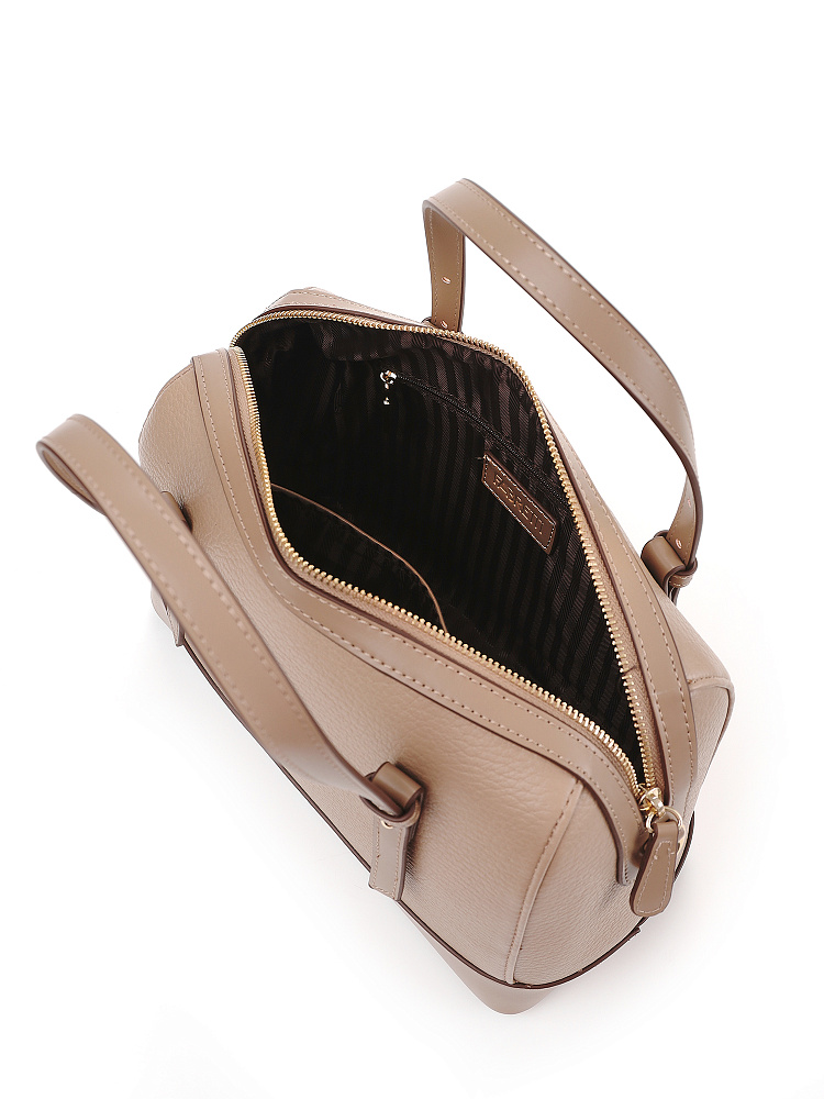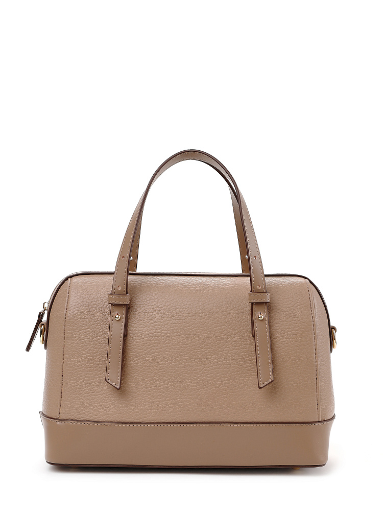 Стильная и лаконичная женская городская сумка боулер из коллекции итальянского бренда FABRETTI выполнена из плотной экокожи двух фактур – крупнозернистой и гладкой теплого кофейно-бежевого тона. Жесткий каркас прекрасно держит форму, защищая ваши вещи. Углы сумки плавные, что сглаживает изначальную строгость силуэта.Дно усилено гладкой жесткой экокожей и дополнено металлическими ножками.У сумки одно отделение на молнии. Внутри один открытый карман и один на молнии.Короткие ручки из жесткой экокожи регулируются по высоте. Съемный ремень на карабинах регулируется по длине пряжкой. Модель дополнена небольшим съемным брелоком в виде сумочки.Длина ремня ок. 135 см. Цвет фурнитуры – золото.