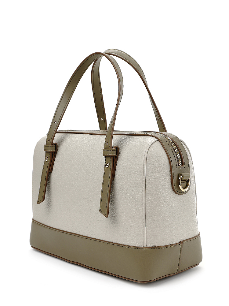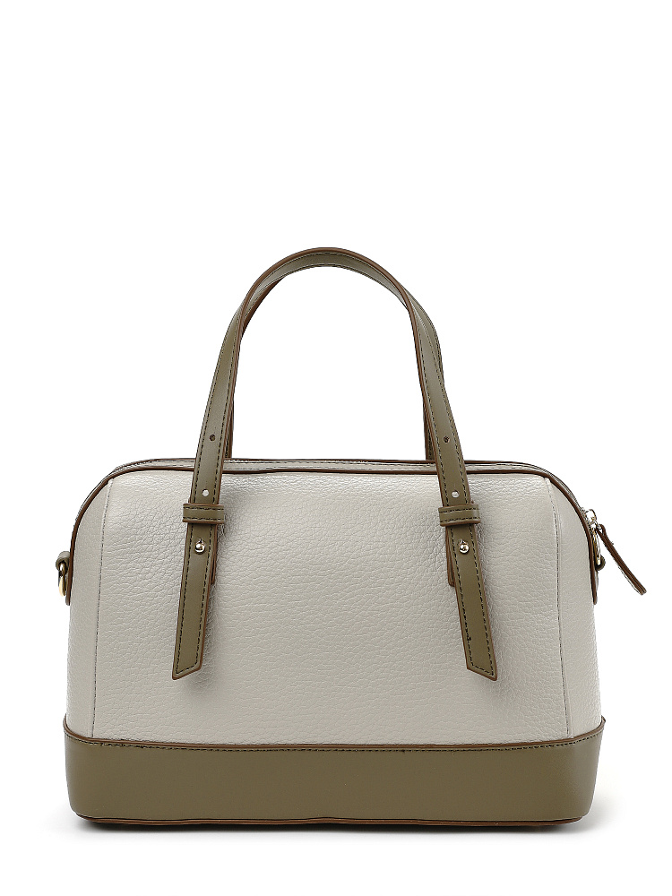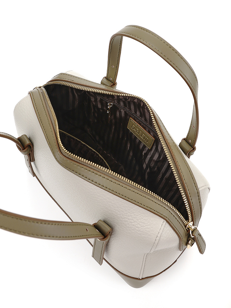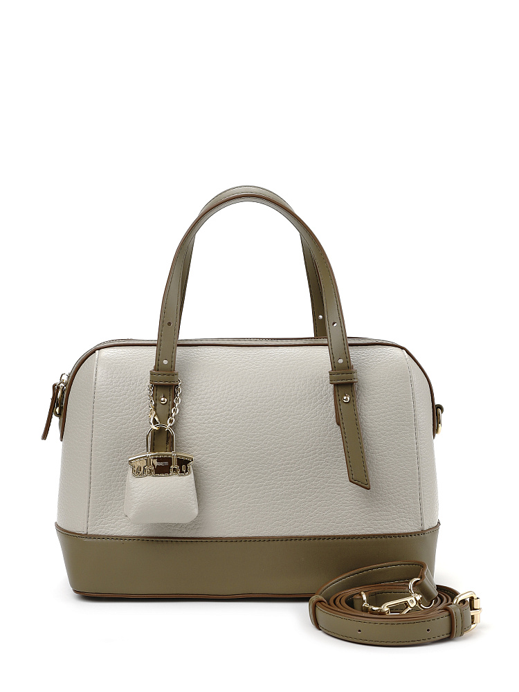 Стильная и лаконичная женская городская сумка боулер из коллекции итальянского бренда FABRETTI выполнена из плотной экокожи двух фактур – светло-бежевой крупнозернистой и серо-зеленой гладкой. Жесткий каркас прекрасно держит форму, защищая ваши вещи. Углы сумки плавные, что сглаживает изначальную строгость силуэта.Дно усилено гладкой жесткой экокожей и дополнено металлическими ножками.У сумки одно отделение на молнии. Внутри один открытый карман и один на молнии.Короткие ручки из жесткой экокожи регулируются по высоте. Съемный ремень на карабинах регулируется по длине пряжкой. Модель дополнена небольшим съемным брелоком в виде сумочки.Длина ремня ок. 135 см. Цвет фурнитуры – золото
