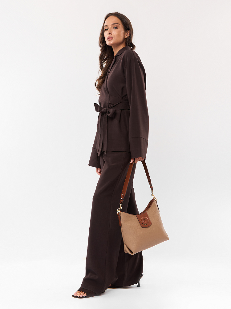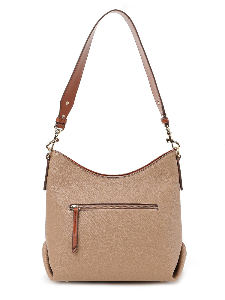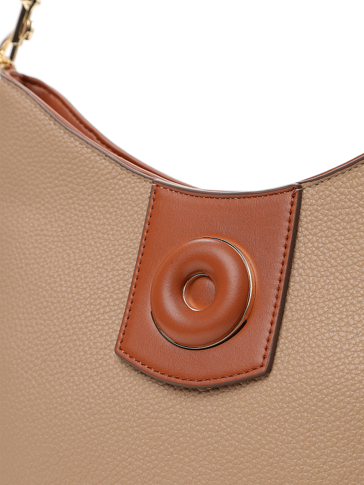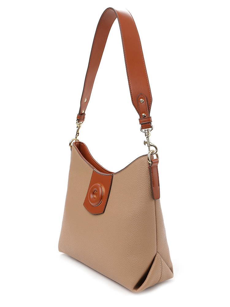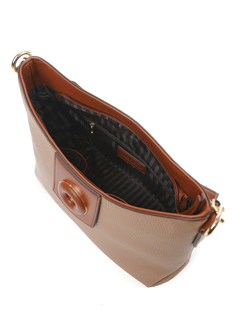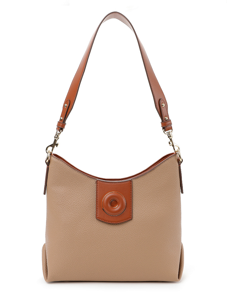 Удобная городская женская сумка хобо итальянского бренда FABRETTI выполнена из высококачественной экокожи с зернистой фактурой. Кофейно-бежевая рельефная кожа дополнена отделкой из гладкой экокожи коричневого цвета. Это классическое сочетание отлично гармонирует с повседневной одеждой на теплый сезон. Сумка вмещает все необходимое, но не выглядит объемной, плотная экокожа хорошо держит форму. Широкий плечевой ремень крепится на карабины.У модели одно отделение на молнии, внутри два открытых кармана и один на молнии, на тыльной стороне карман быстрого доступа, лицевая украшена декоративным клапаном на магнитной кнопке. Цвет фурнитуры – золото.