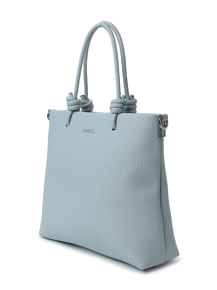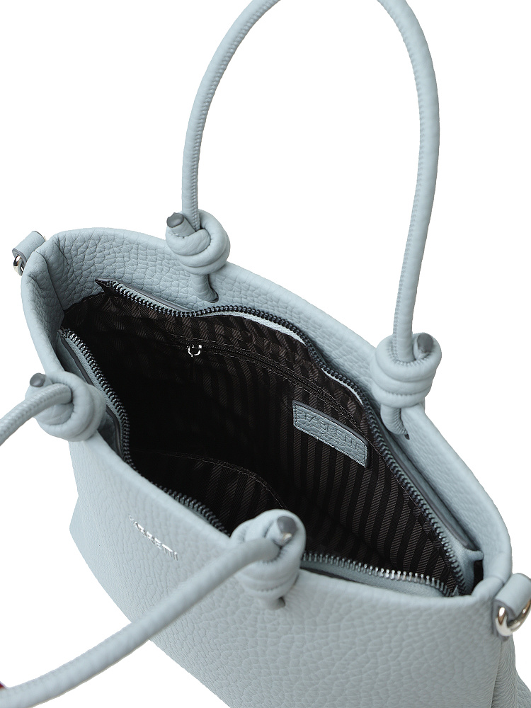 Стильная женская сумка тоут итальянского бренда FABRETTI из нежной экокожи с зернистой фактурой пастельного бледно-голубого оттенка.У модели максимально плавный силуэт без острых углов. Основной элемент декора – объемные узлы на коротких ручках-шнурах.Основное отделение закрывается на металлическую молнию. Внутри один открытый карман и на молнии. На тыльной стороне карман быстрого доступа на молнии. Сумка дополнена широким съемным плечевым ремнем, длина ок. 95см.Эта модель выглядит лаконично и современно, ее мягкий силуэт отлично сочетается с повседневной городской casual-одеждой, пальто, блузами, платьями, вертикальный формат визуально вытягивает силуэт. Цвет фурнитуры – серебро.