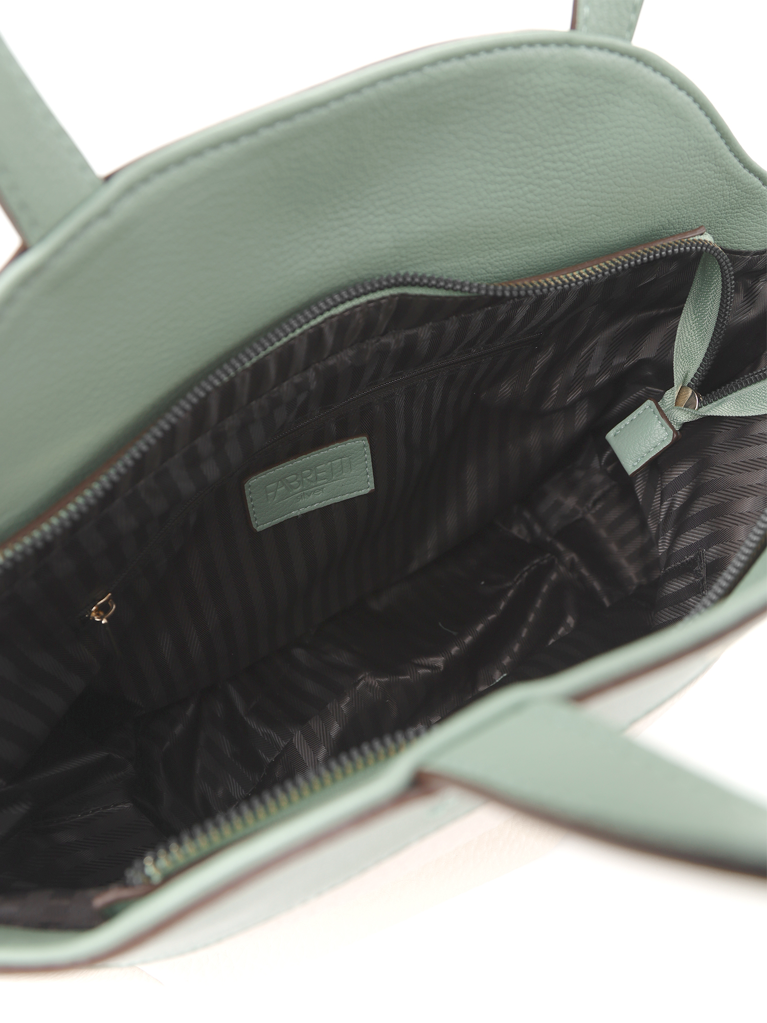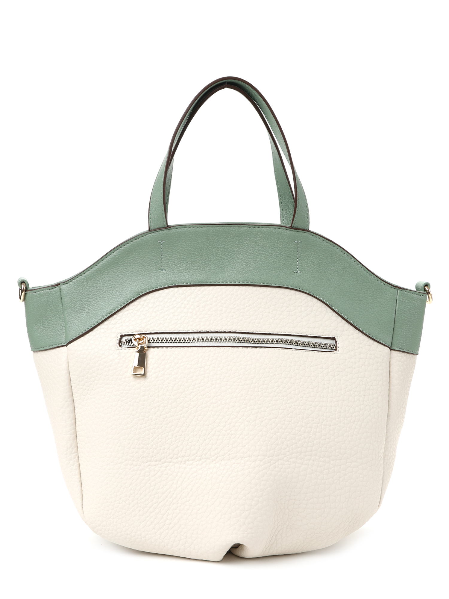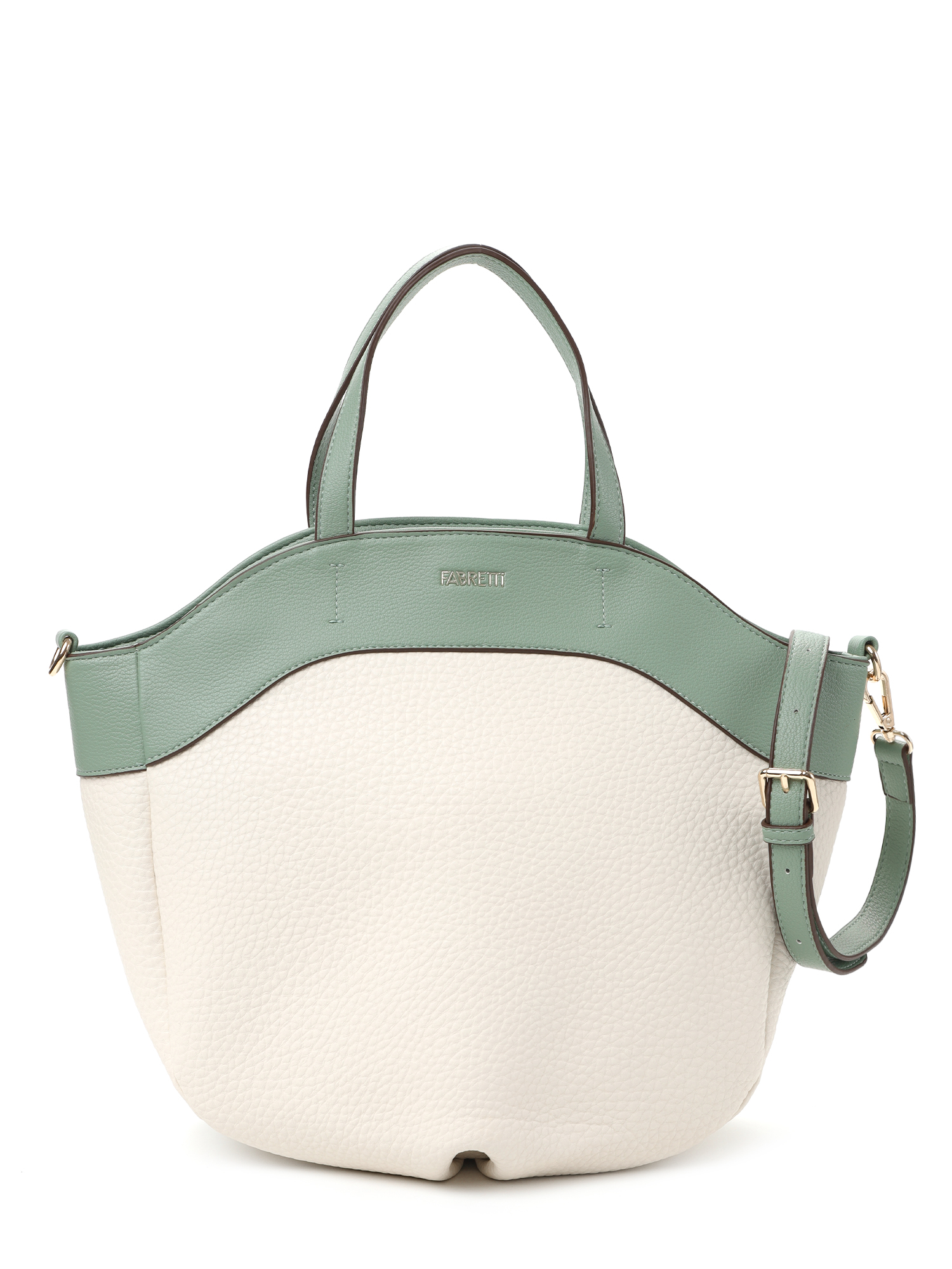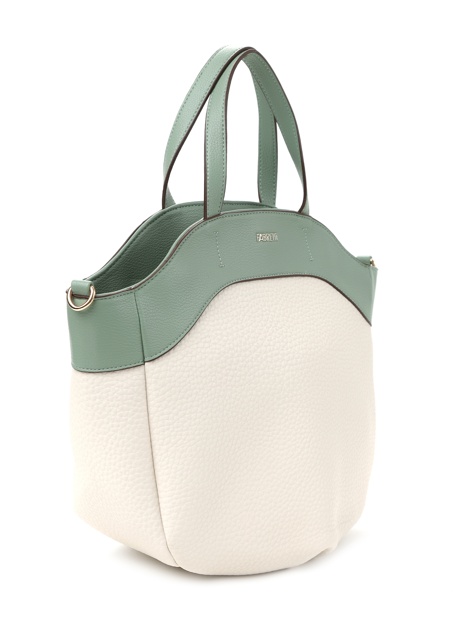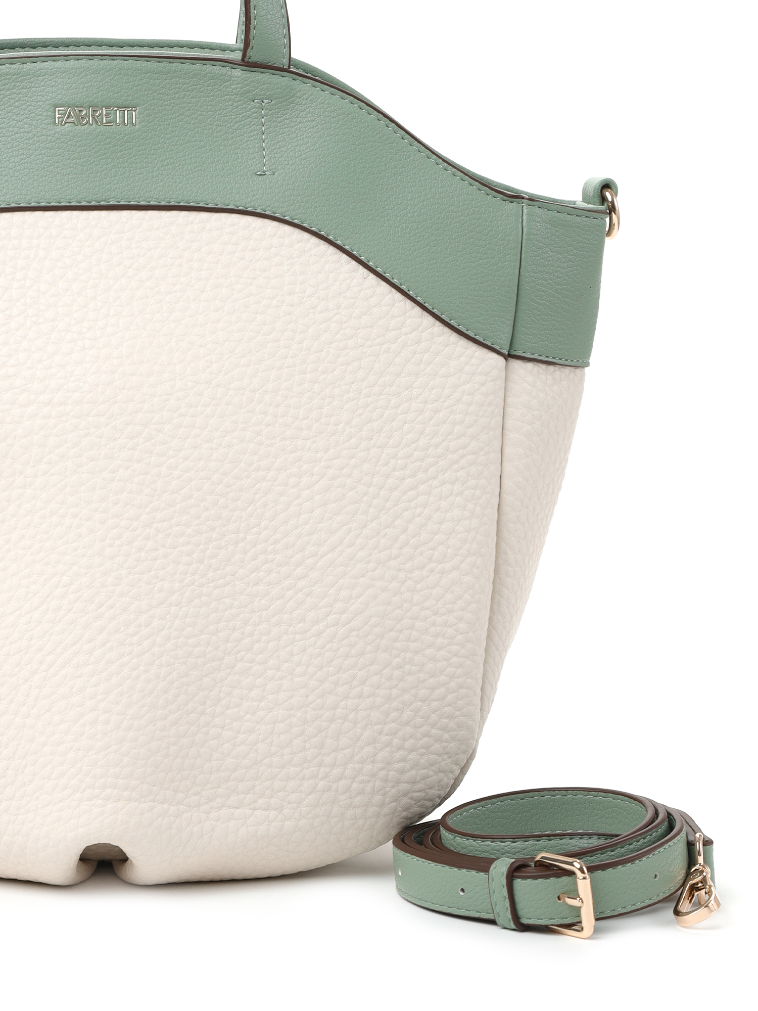 Необычная женская сумка тоут итальянского бренда FABRETTI выполнена из высококачественной экокожи с крупнозернистой фактурой. Модель решена в интересной цветовой схеме: светло-бежевая экокожа с рельефом дополнена светлой, мятно-зеленой отделкой из мелкозернистой экокожи.Основное отделение застегивается на молнию, внутри большой открытый карман и карман на молнии. На тыльной стороне сумки карман быстрого доступа на молнии.У модели необычная форма трапеции со складками по дну, увеличивающими объем, короткие ручки для ношения в руке или на плече и съемный ремень на карабинах, регулируемый пряжкой, длина ок. 120 см. Цвет фурнитуры - золото