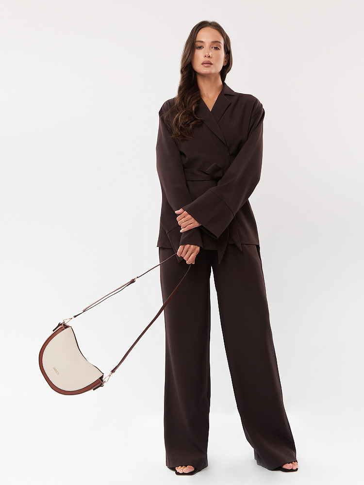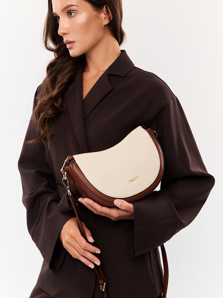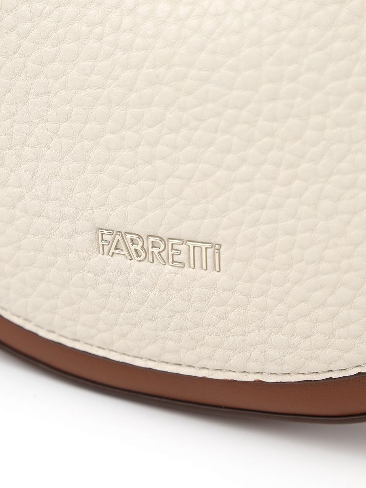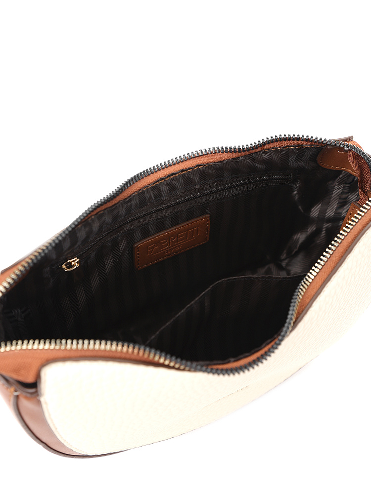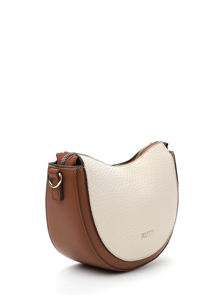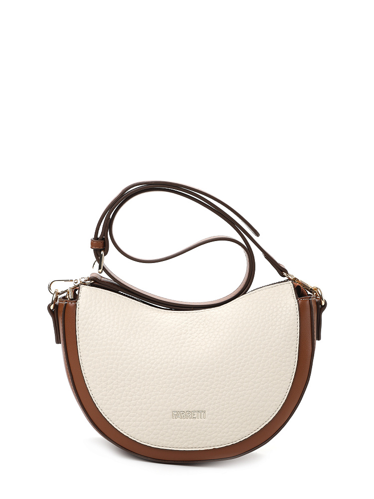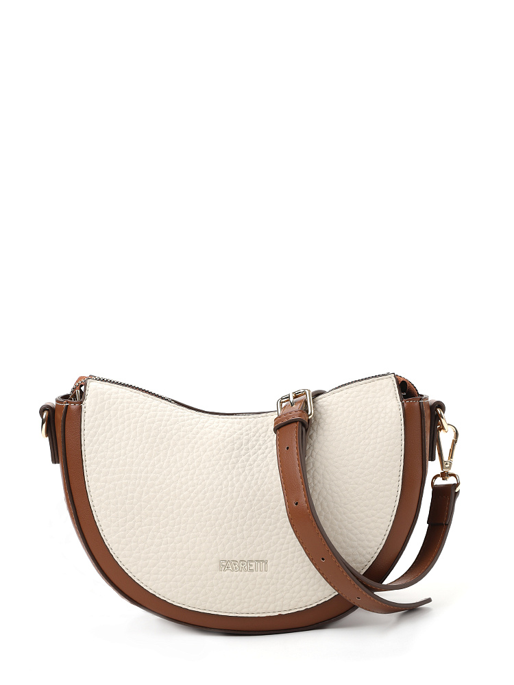 Удобная полукруглая женская сумка кросс-боди итальянского бренда FABRETTI выполнена из высококачественной экокожи с крупнозернистой фактурой. Светло-бежевая рельефная кожа дополнена отделкой из гладкой экокожи коричневого цвета. Это сочетание отлично гармонирует с повседневной одеждой на теплый сезон.У модели одно отделение на молнии, внутри открытый карман и на молнии, на тыльной стороне карман быстрого доступа, лицевая украшена фирменным металлическим логотипом.Сумка дополнена съемным ремнем на карабинах, регулируемым при помощи пряжки. Длина ок. 115 см. Цвет фурнитуры – золото.