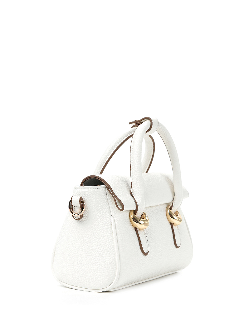 Миниатюрная женская сумка сэтчел итальянского бренда FABRETTI из нежной экокожи с мелкозернистой фактурой в чистом белом цвете со светло-коричневой отделкой швов. Классическая маленькая прямоугольная сумочка с клапаном на магнитной кнопке – идеальный городской аксессуар, вместительный, но компактный и хорошо сохраняющий геометрию формы.Внутри два кармана – на молнии и открытый. Короткие ручки скрепляются ремешком на кнопке.Сумка дополнена съемным регулируемым ремнем на карабинах, с пряжкой. Длина ок. 125 см. Цвет фурнитуры – золото.Эта модель может быть как главным аксессуаром как для будничного офисного образа с брючным костюмом или платьем-футляром, так и для выходного дня, с джинсами, футболкой и кедами. Съемный тонкий ремешок позволяет мгновенно трансформировать сумку из элегантного сэтчела на плече в строгий клатч для вечера или деловой встречи.