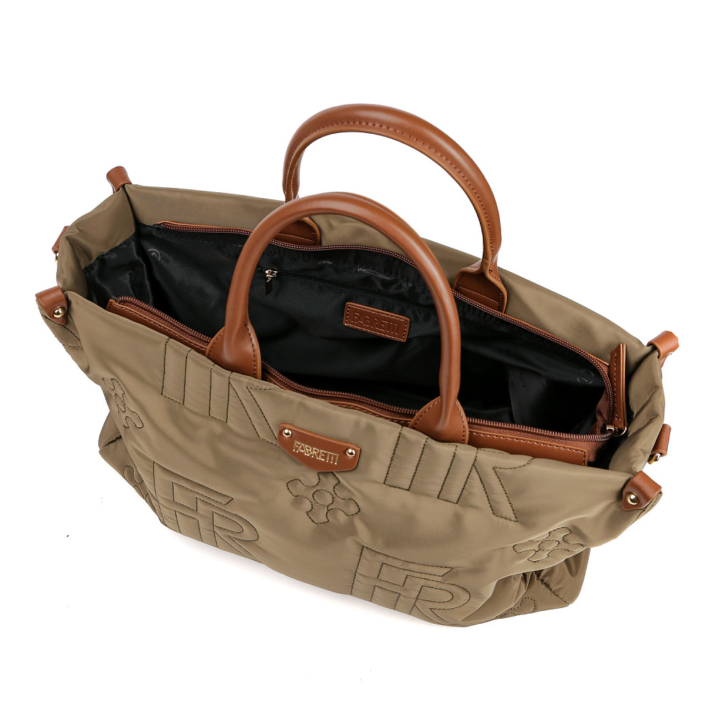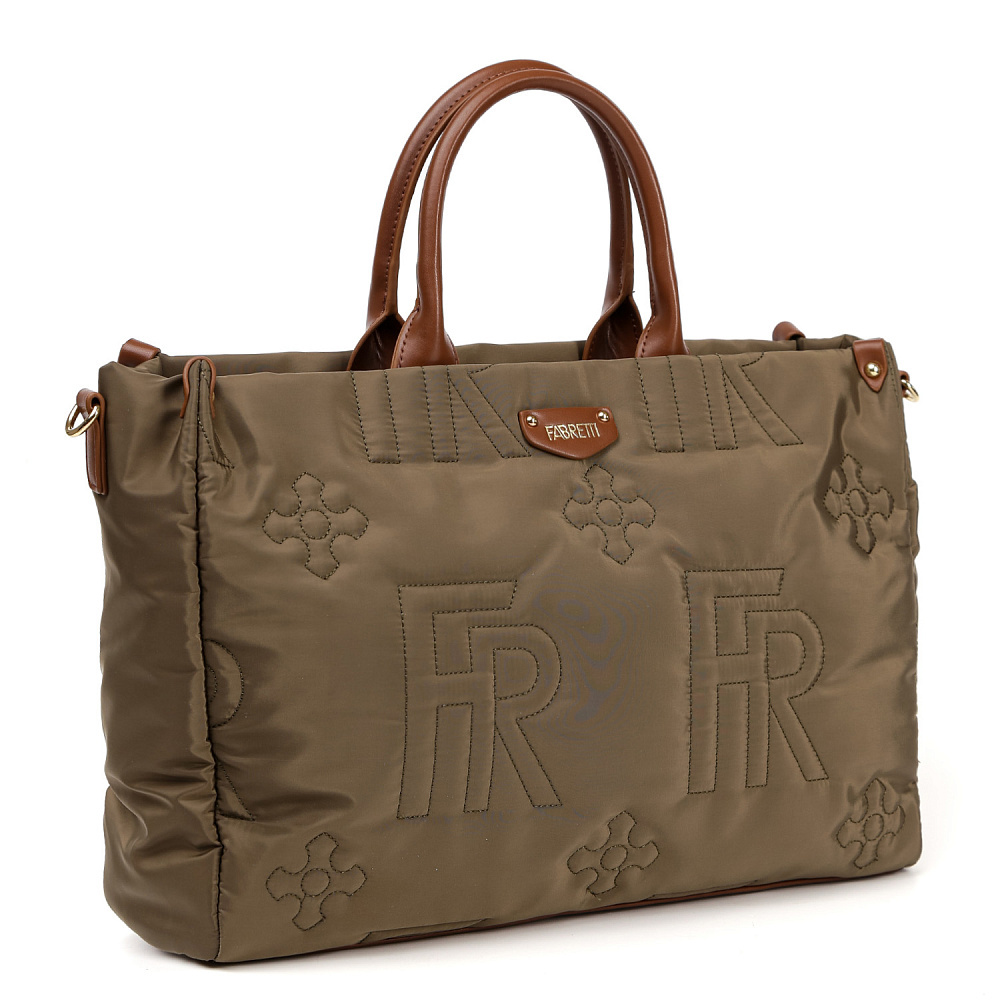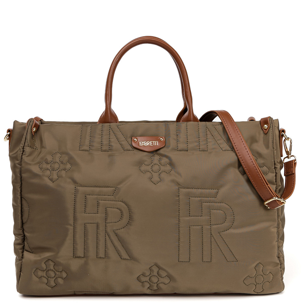 Стильная стёганая сумка FABRETTI в зеленом оттенке выполнена из высокотехнологичного полиэстера, устойчивого к воздействию влаги и перепаду температур. В качестве декора выбрана стёжка с монограммами бренда. Ручки, плечевой ремень, дно и детали отделки – из экокожи. Основное отделение на молнии. Внутри 3 кармана для мелочей: 2 открытых и на молнии. На тыльной стороне предусмотрен карман быстрого доступа на молнии. Две ручки позволяют носить аксессуар в руке. В комплекте - съемный плечевой ремень, регулируемый по длине, ширина - 2 см. Вмещает формат А4. Цвет фурнитуры - золото.