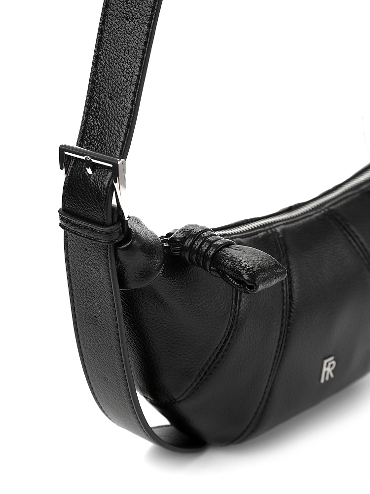Маленькая трендовая женская сумка круассан итальянского бренда FABRETTI из нежной экокожи с зернистой фактурой. Она выполнена в классическом черном цвете.Сумка в форме полумесяца или круассана с характерными вертикальными швами – популярная городская модель со сложным дизайном. Это акцентный аксессуар, притягивающий внимание.У сумки одно отделение на молнии, внутри два кармана – открытый и на молнии; широкий плечевой ремень, длина регулируется пряжкой. Возможно ношение модели в стиле «слинг» - через плечо.Поводки молний украшены объемными кожаными подвесками. Цвет фурнитуры – серебро.