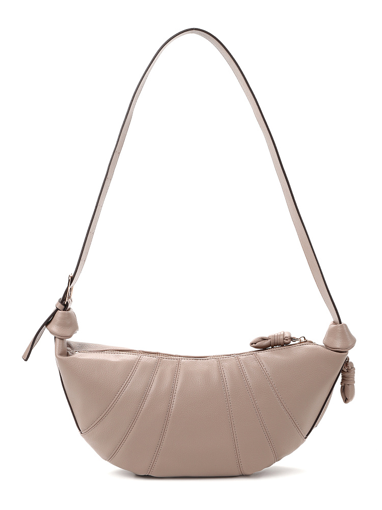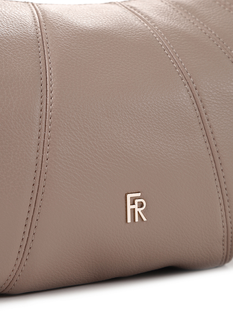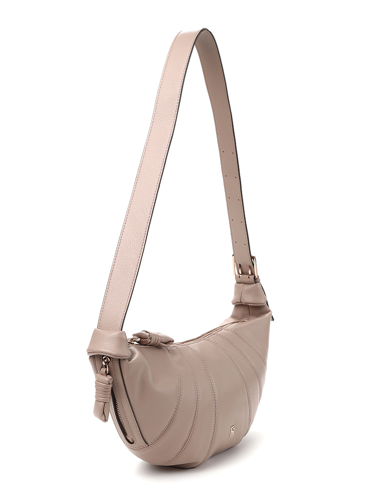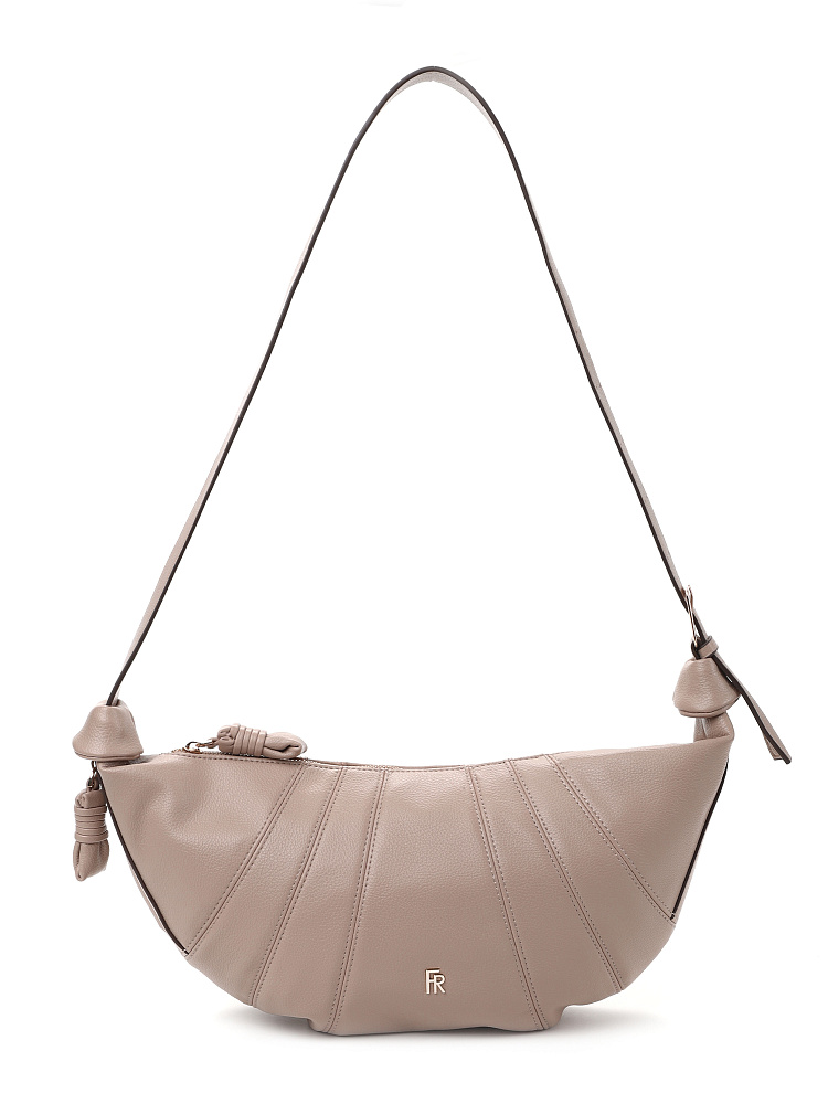 Трендовая женская сумка круассан итальянского бренда FABRETTI из нежной экокожи с зернистой фактурой. Она выполнена в нежном розовато-бежевом «нюдовом» цвете со светло-коричневым кантом на ремне.Сумка в форме полумесяца или круассана с характерными вертикальными швами – популярная городская модель со сложным дизайном. Это акцентный аксессуар, притягивающий внимание.У сумки одно отделение на молнии, внутри два кармана – открытый и на молнии, на боку сумки также карман быстрого доступа на молнии. У модели широкий плечевой ремень, длина регулируется пряжкой. Возможно ношение модели в стиле «слинг» - через плечо.Поводки молний украшены объемными кожаными подвесками. Цвет фурнитуры – золото.