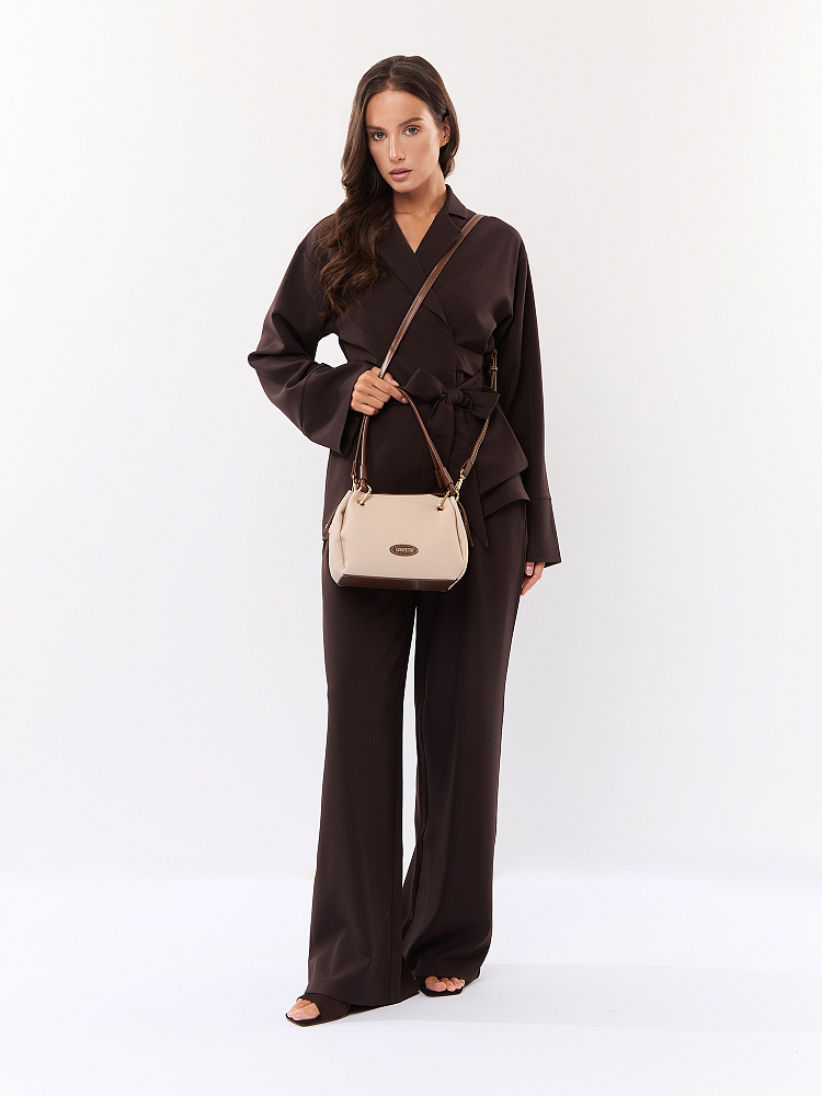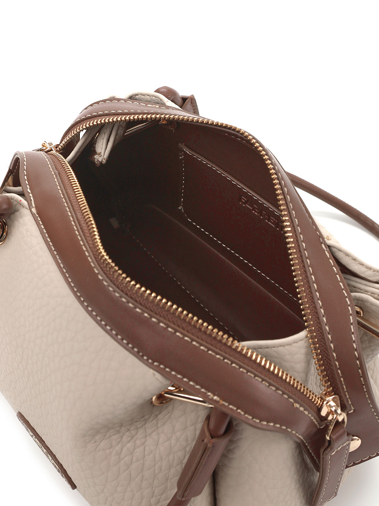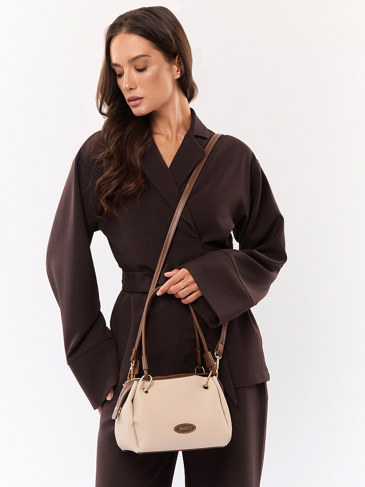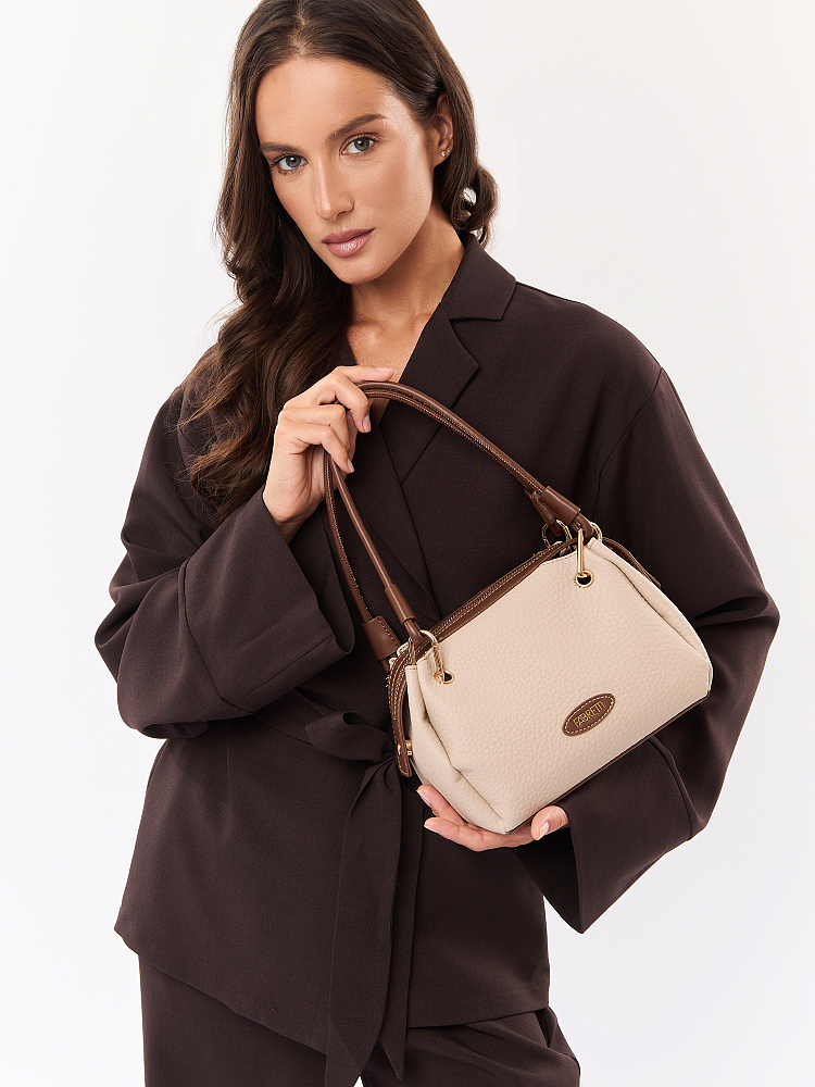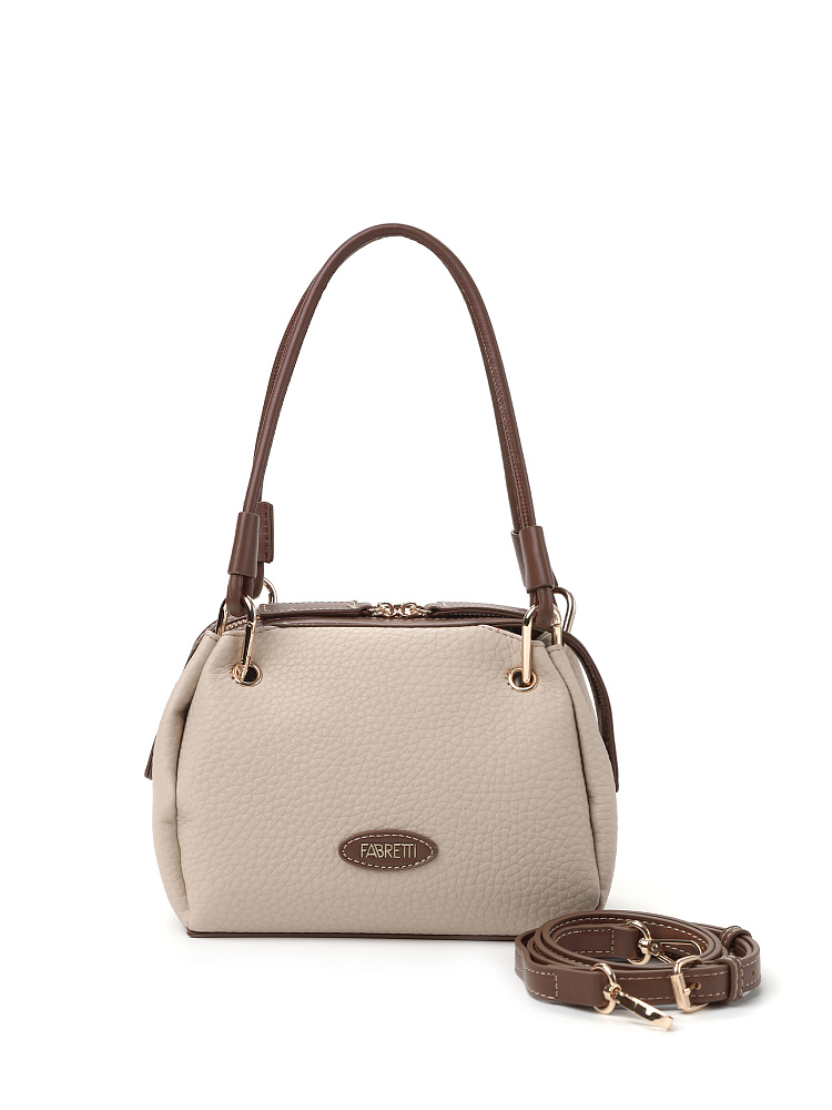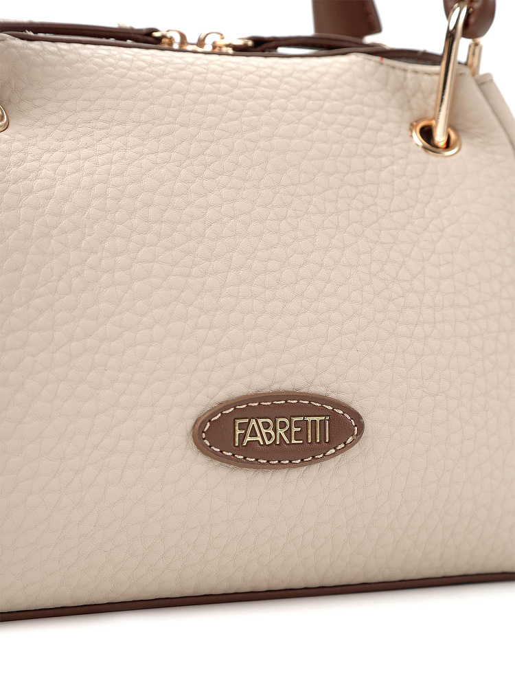 Необычная женская сумка итальянского бренда FABRETTI выполнена из высококачественной экокожи с крупнозернистой фактурой. Модель решена в классической цветовой схеме: бежевая экокожа с рельефом дополнена коричневой отделкой из гладкой экокожи.Модель смотрится очень оригинально и, несмотря на свой размер, достаточно вместительна. Интересно решены короткие ручки из шнура: они крепятся на карабины по углам сумки. Модель застегивается на молнию с двумя бегунками, края молнии фиксируются магнитами. Внутри небольшой открытый карман.Модель дополнена съемным плечевым ремнем на карабинах, длина регулируется пряжкой. Длина ремня ок. 125 см. Цвет фурнитуры – золото.