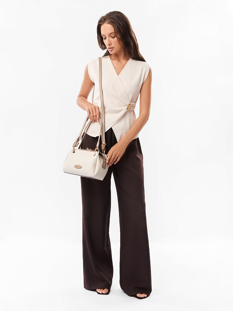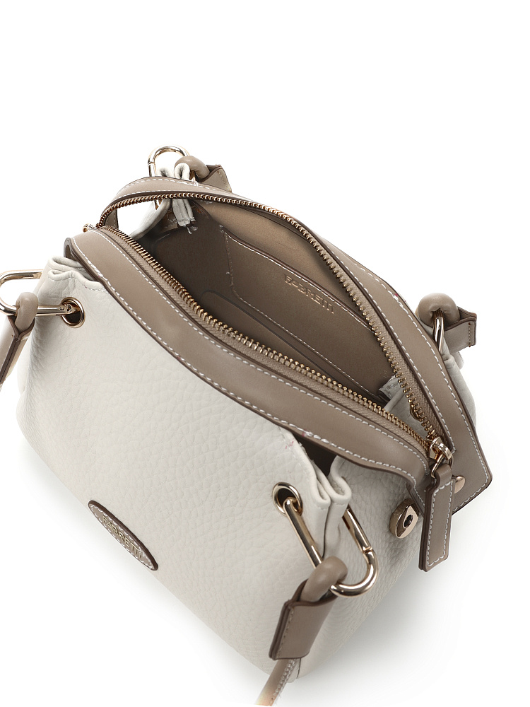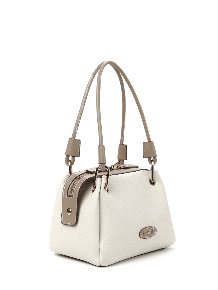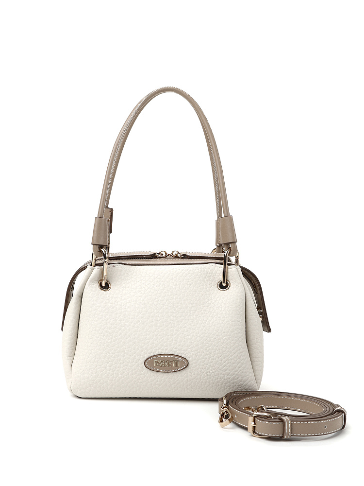 Необычная женская сумка итальянского бренда FABRETTI выполнена из высококачественной экокожи с крупнозернистой фактурой. Модель решена в классической цветовой схеме: светлая бежевая экокожа с рельефом дополнена более темной бежевой отделкой из гладкой экокожи.Модель смотрится очень оригинально и, несмотря на свой размер, достаточно вместительна. Интересно решены короткие ручки из шнура: они крепятся на карабины по углам сумки. Модель застегивается на молнию с двумя бегунками, края молнии фиксируются магнитами. Внутри небольшой открытый карман.Модель дополнена съемным плечевым ремнем на карабинах, длина регулируется пряжкой. Длина ремня ок. 125 см. Цвет фурнитуры – золото.