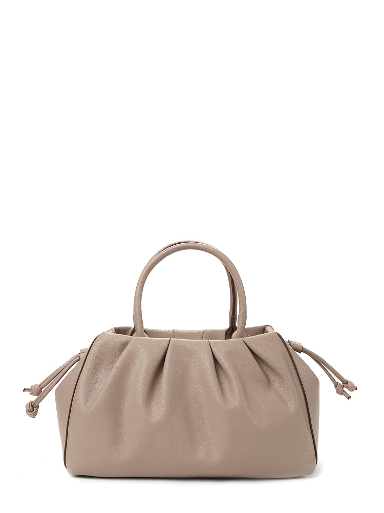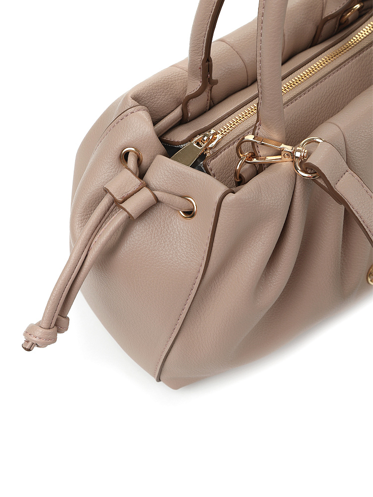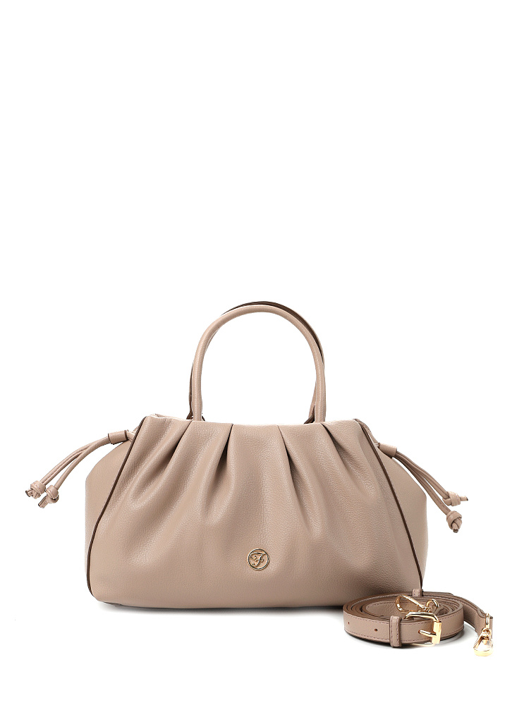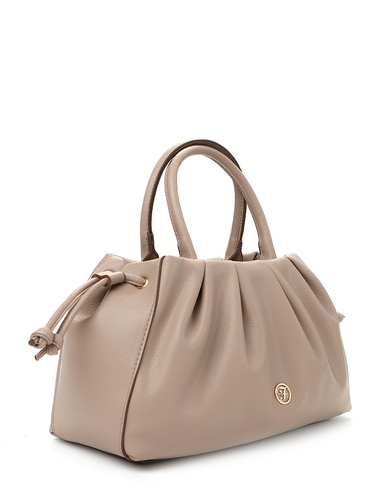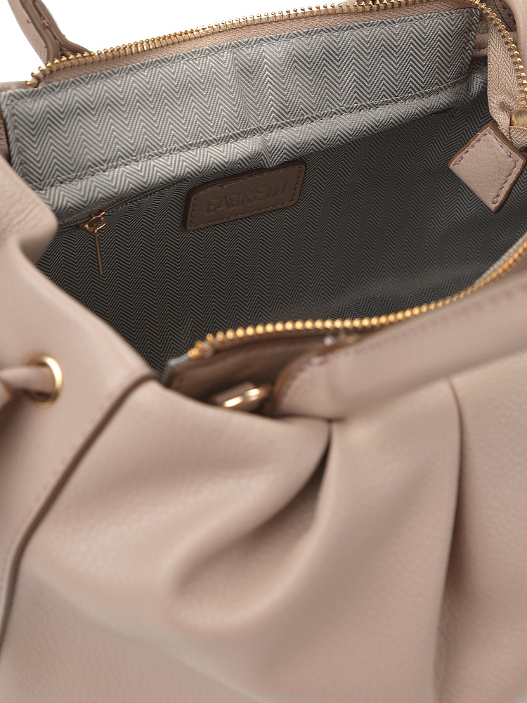 Миниатюрная женская сумка кросс-боди итальянского бренда FABRETTI из нежной мягкой экокожи с мелкозернистой фактурой в теплом розово-бежевом «нюдовом» оттенке со светло-коричневой отделкой швов.Объемная модель с мягкими, плавными формами прекрасно сочетается с однотонным летним гардеробом и спокойным casual стилем.У сумки одно отделение на металлической молнии, внутри два кармана – открытый и на молнии. Верх модели оформлен крупными объемными складками, кожаный шнурок позволяет дополнительно утянуть его на манер сумки-кисета. На лицевой стороне изящная металлическая монограмма.Сумка дополнена съемным регулируемым ремнем на карабинах, с пряжкой. Длина ок. 125 см. Цвет фурнитуры – золото.