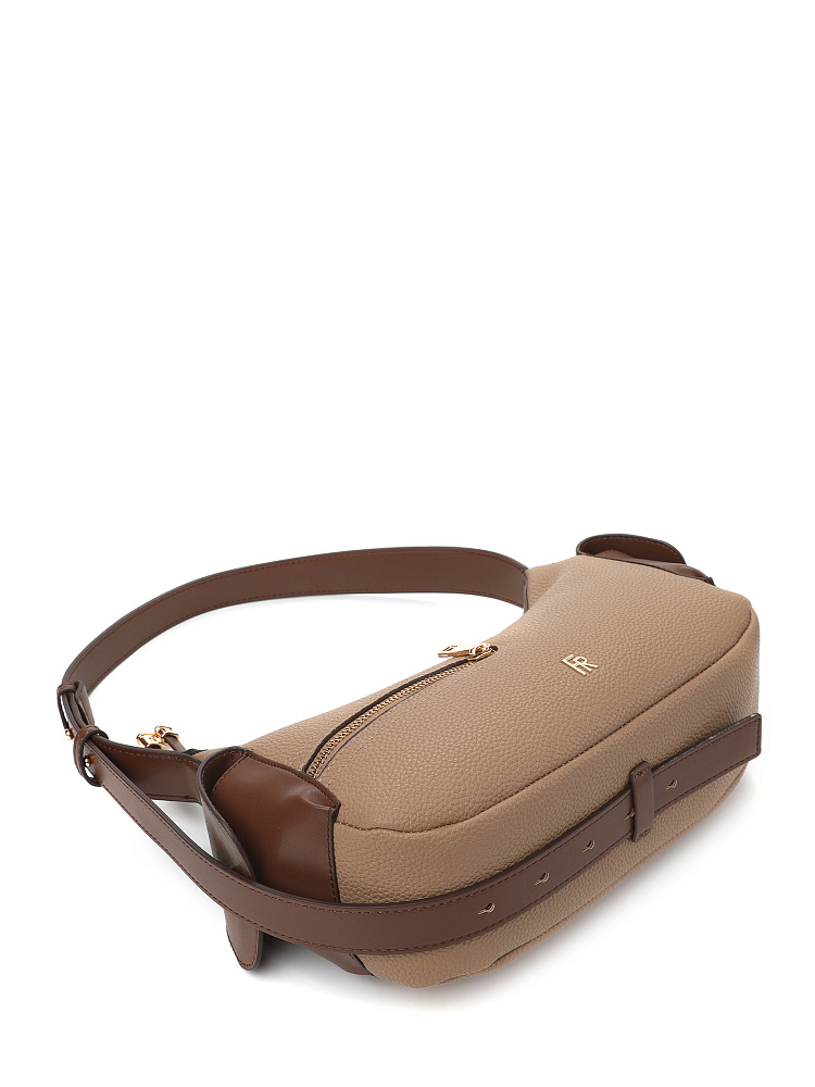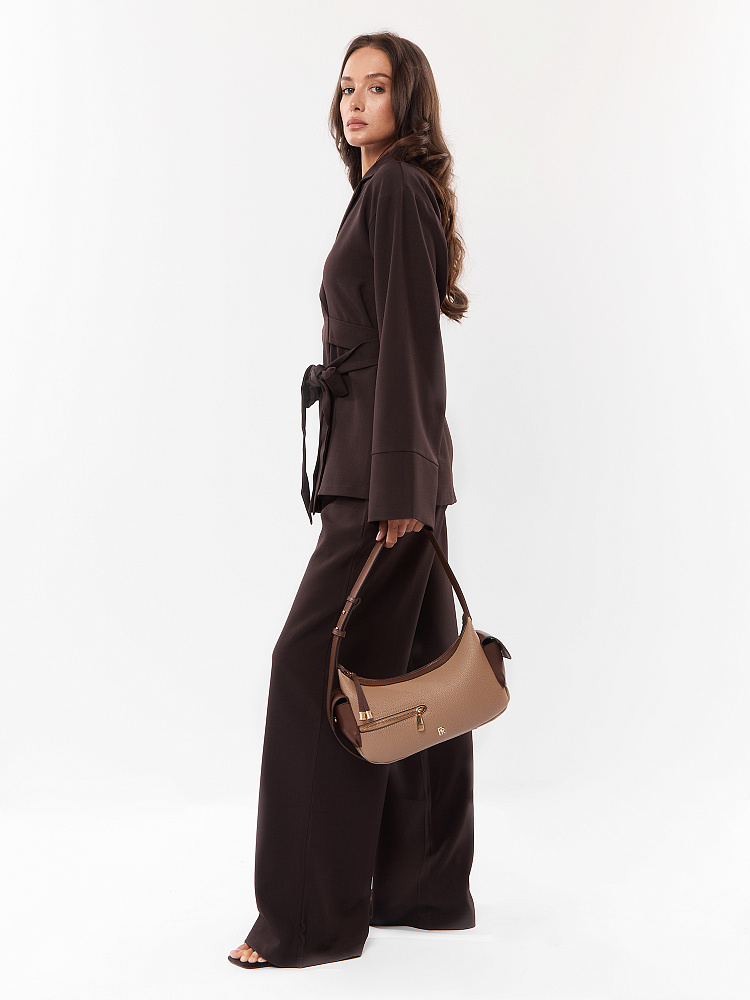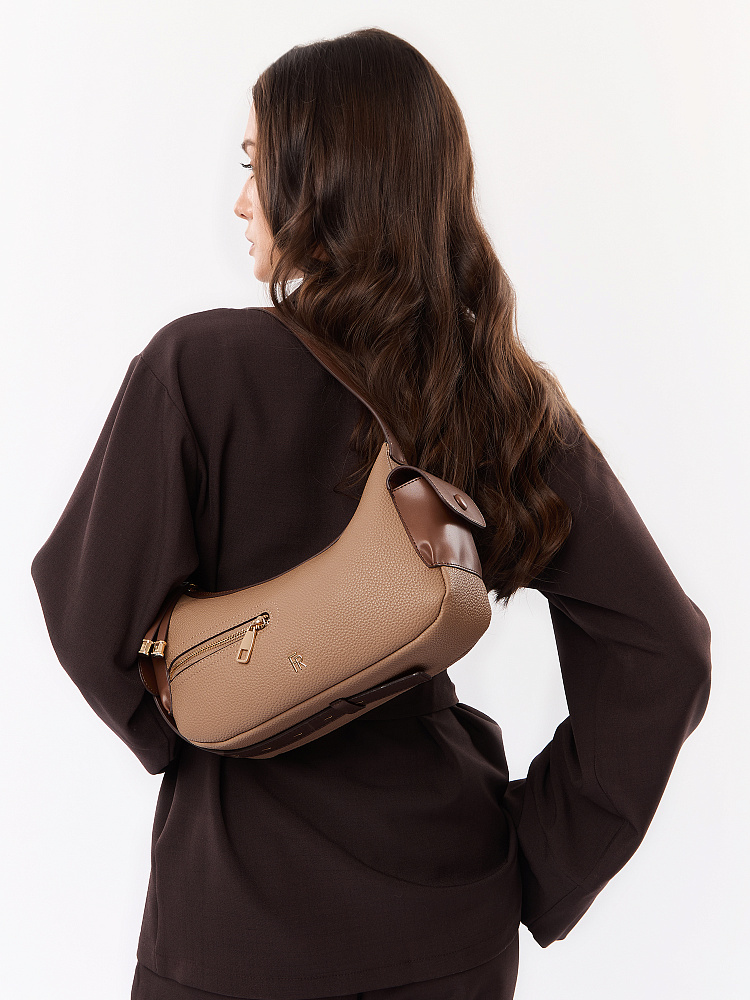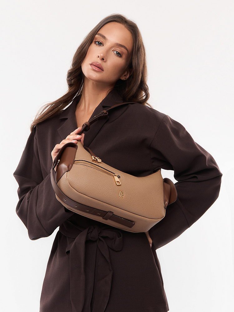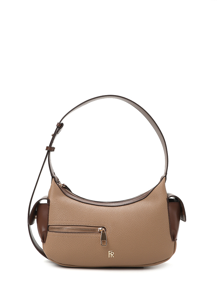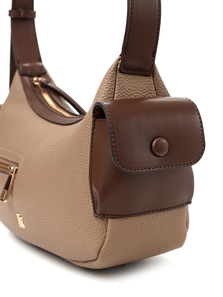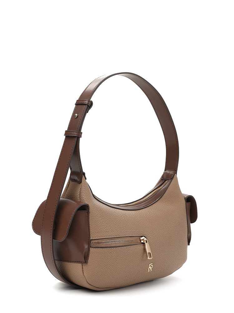 Современная женская сумка хобо итальянского бренда FABRETTI выполнена из высококачественной экокожи с крупнозернистой фактурой. Кофейно-бежевая рельефная кожа дополнена темно-коричневой отделкой из гладкой экокожи. Это сочетание отлично гармонирует с повседневной одеждой на теплый сезон.У модели одно отделение на молнии, внутри открытый карман и на молнии, на лицевой стороне карман быстрого доступа, по бокам накладные карманы с клапанами на магнитах.Ручка сумки регулируется по длине, на дне предусмотрена шлевка для края ремня. Цвет фурнитуры – золото.