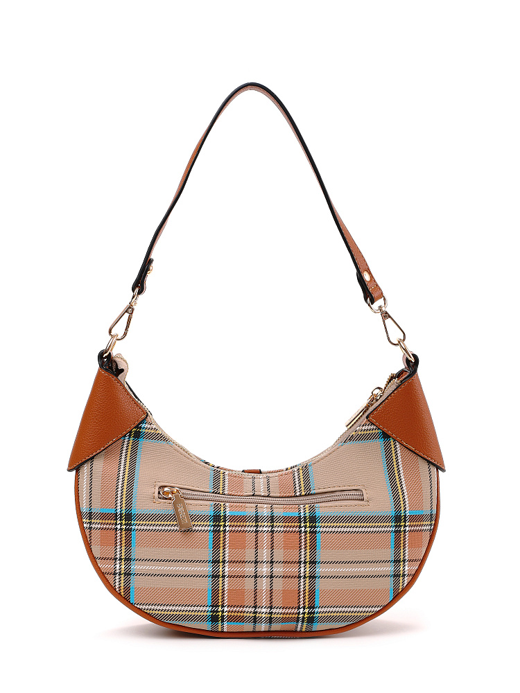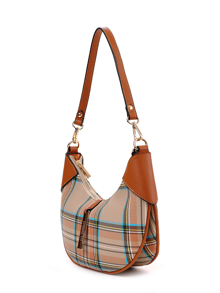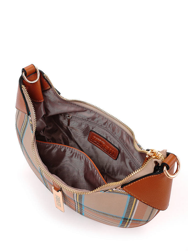 Небольшая женская сумка кросс-боди итальянского бренда FABRETTI из плотной экокожи с принтом под классическую бежевую шотландку. Отделка сумки из однотонной крупнозернистой экокожи.У модели интересная форма полумесяца с широким основанием. Основное отделение закрывается на металлическую молнию. Внутри один открытый карман и один на молнии, на тыльной стороне карман быстрого доступа. На лицевой декор в виде хлястика с прямоугольным металлическим брелоком с гравировкой.Сумка оснащена двумя съемными ручками на карабинах – короткой и с регулируемым плечевым ремешком.Длина ремня ок 12- см. Цвет фурнитуры – золото.
