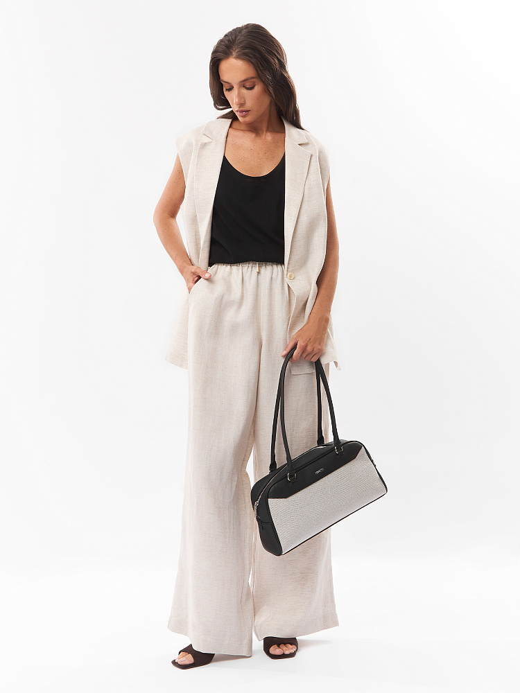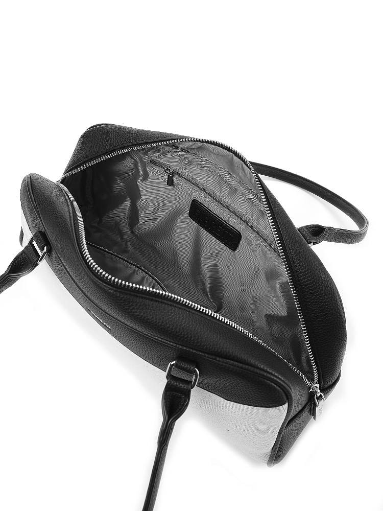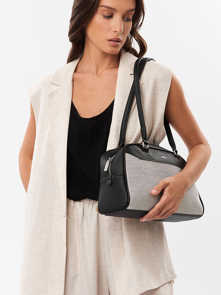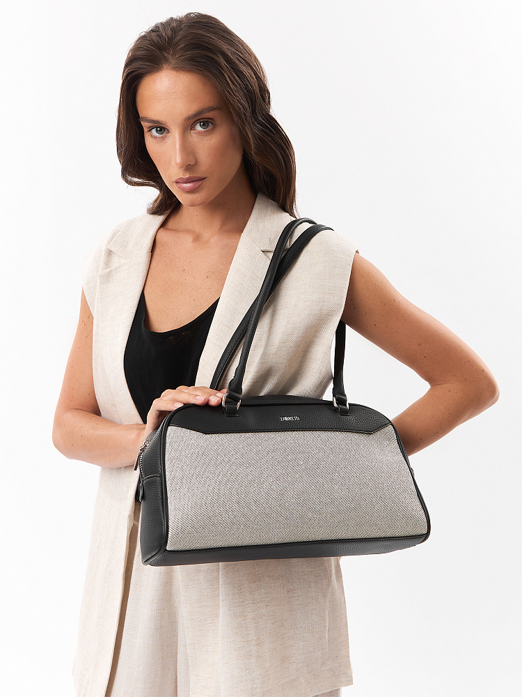 Стильная монохромная сумка боулер от итальянского бренда FABRETTI сочетает высококачественную зернистую экокожу черного цвета и жаккард с узором в тонкую диагональную полоску. Изящная вытянутая и закругленная сверху форма, монохромная отделка и лаконичная серебристая фурнитура делают эту модель невероятно стильной, но сдержанной. Она прекрасно дополнит собой повседневный городской гардероб.Модель закрывается на молнию, внутри одно отделение с одним открытым карманом и на молнии. Длинные ручки удобны для ношения сумки как на плече, так и на сгибе локтя.Цвет фурнитуры – серебро.