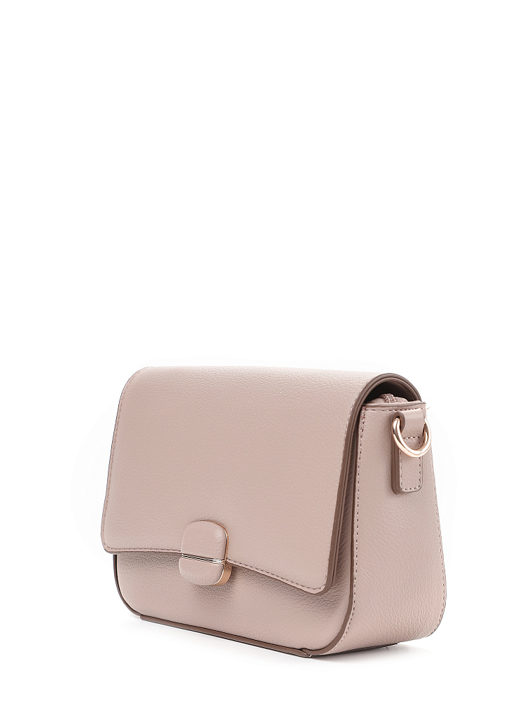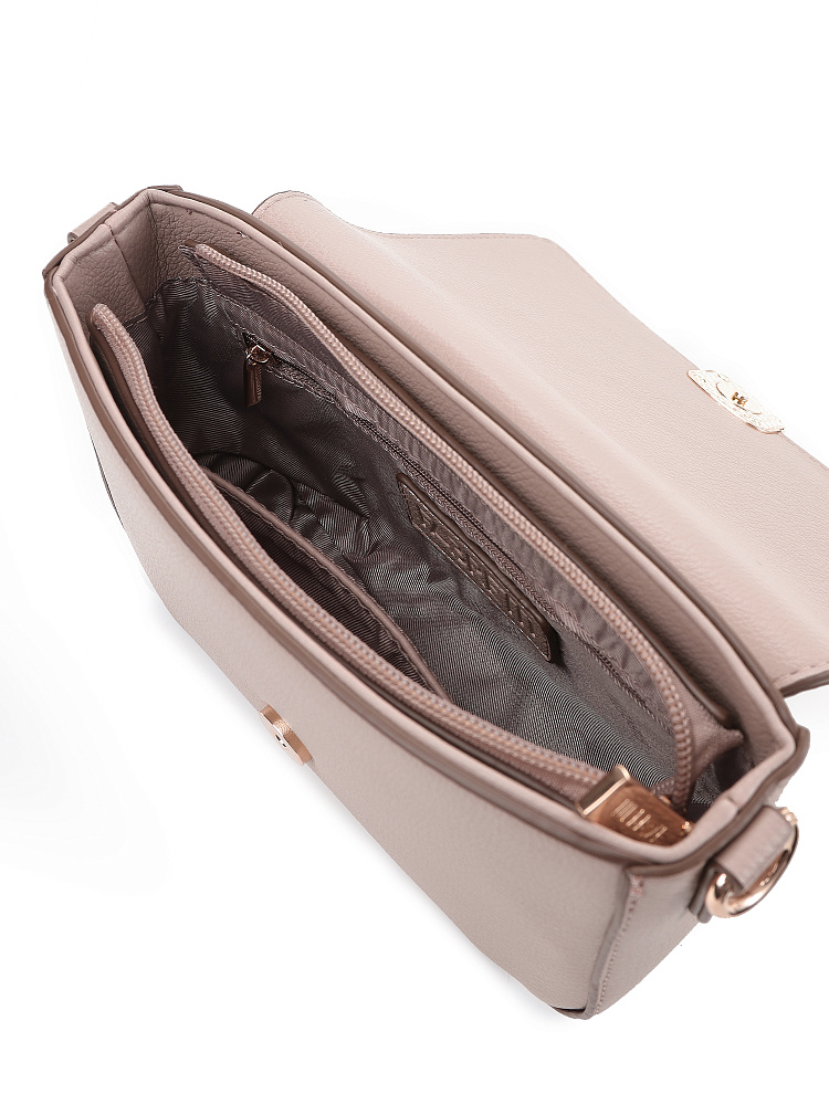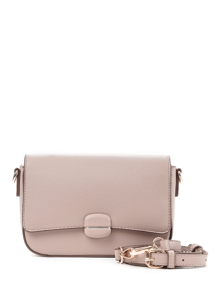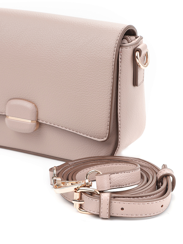 Изящная женская сумка кросс-боди с клапаном итальянского бренда FABRETTI из высококачественной зернистой экокожи теплого розового-бежевого оттенка.У сумки прямоугольная форма с плавными изгибами, клапан украшен обтянутой кожей пряжкой с магнитным замком.Классическая форма делает эту модель универсальным повседневным аксессуаром, но благодаря дизайнерской отделке сумка выглядит небанально и респектабельно.Основное отделение закрывается на молнию, внутри открытый карман и на молнии.Модель дополнена регулируемым узким ремнем с пряжкой.Длина ремня ок. 125 см. Цвет фурнитуры – золото.