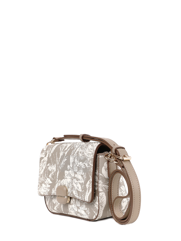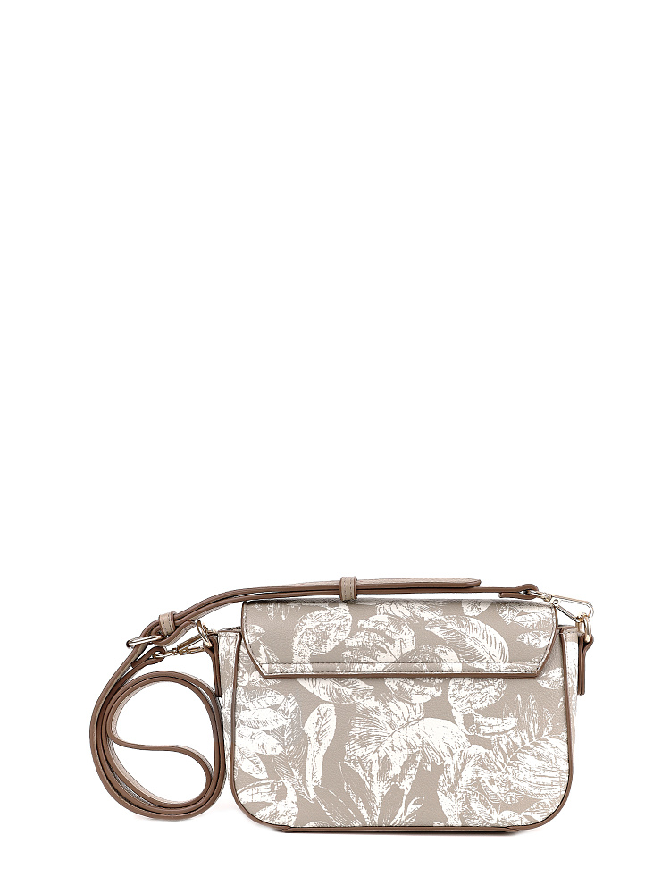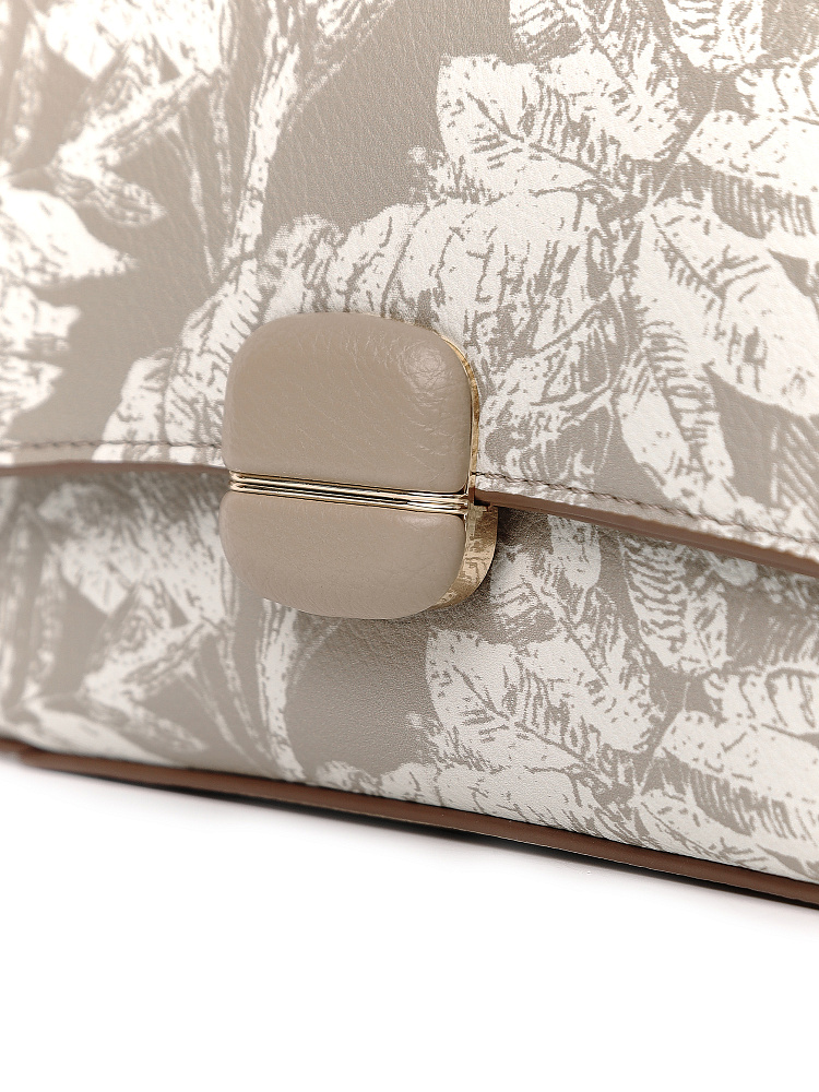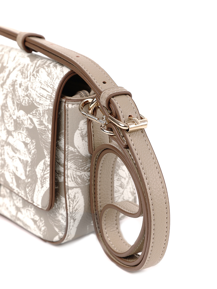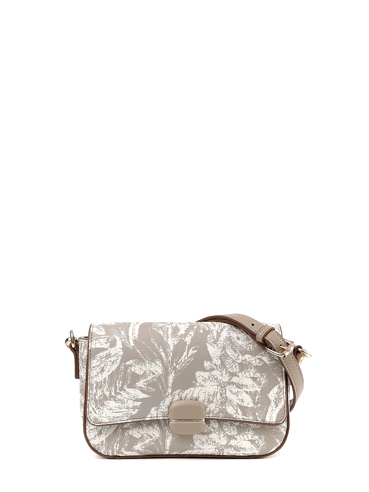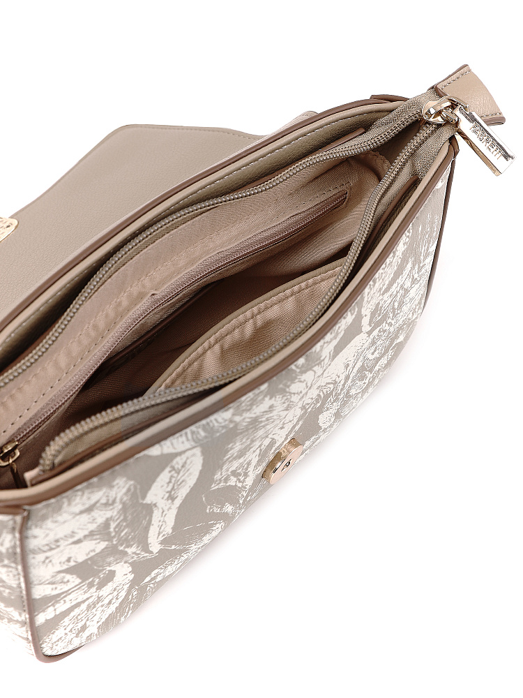 Изящная женская сумка кросс-боди с клапаном итальянского бренда FABRETTI из зернистой бежевой экокожи, украшенной необычным растительным принтом.У сумки прямоугольная форма с плавными изгибами, клапан украшен обтянутой кожей пряжкой с магнитным замком.Классическая форма делает эту модель универсальным повседневным аксессуаром, светлая кожа и рисунок в виде листьев отлично подходят для летнего настроения.Основное отделение закрывается на молнию, внутри открытый карман и на молнии.Модель дополнена регулируемым узким ремнем с пряжкой.Длина ремня ок. 125 см. Цвет фурнитуры – золото.