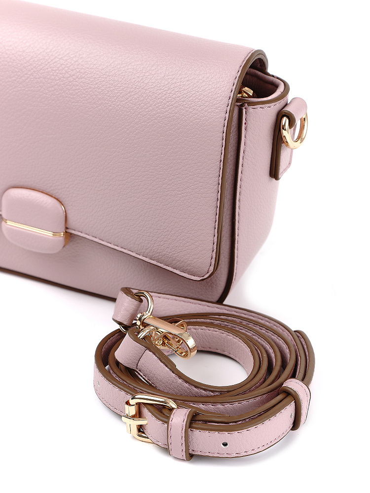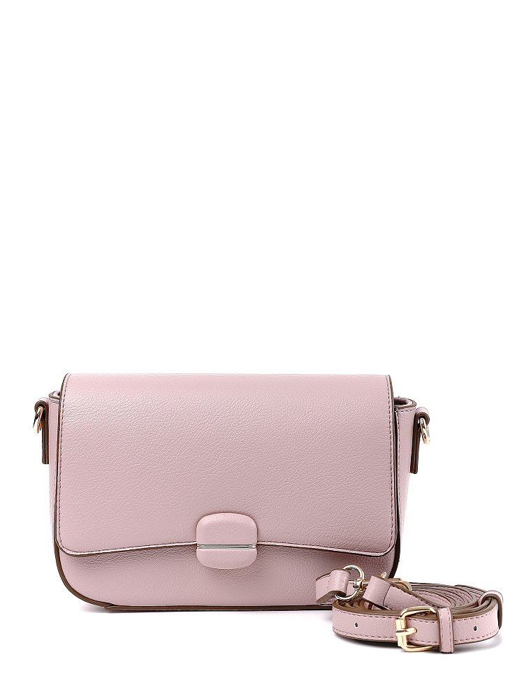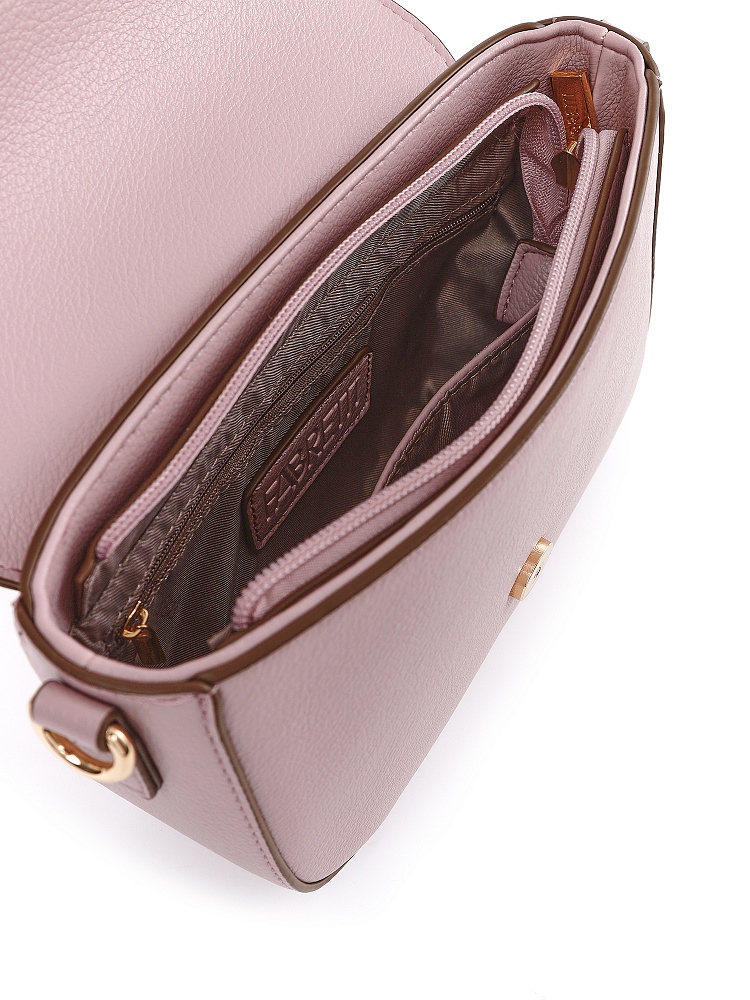Изящная женская сумка кросс-боди с клапаном итальянского бренда FABRETTI из высококачественной зернистой экокожи нежно-розового цвета с коричневой окантовкой срезов.У сумки прямоугольная форма с плавными изгибами, клапан украшен обтянутой кожей пряжкой с магнитным замком.Классическая форма делает эту модель универсальным повседневным аксессуаром, но благодаря дизайнерской отделке сумка выглядит небанально и респектабельно.Основное отделение закрывается на молнию, внутри открытый карман и на молнии.Модель дополнена регулируемым узким ремнем с пряжкой.Длина ремня ок. 125 см. Цвет фурнитуры – золото.