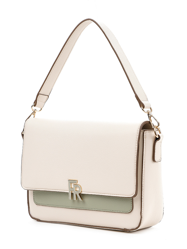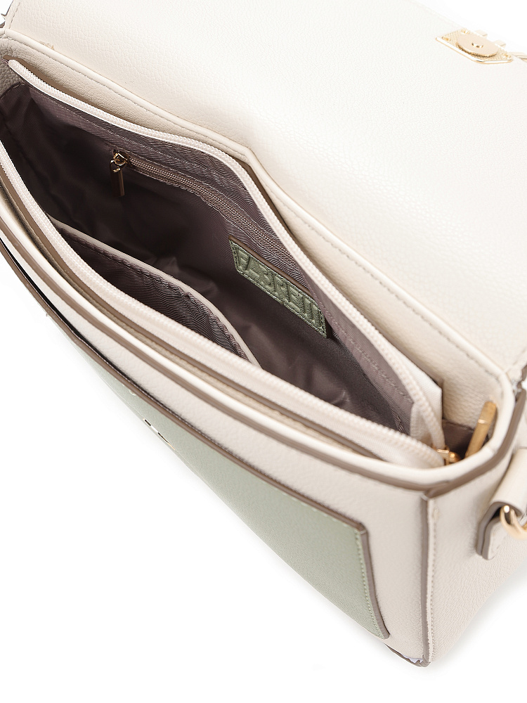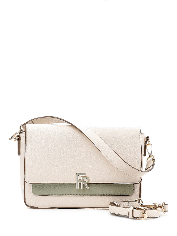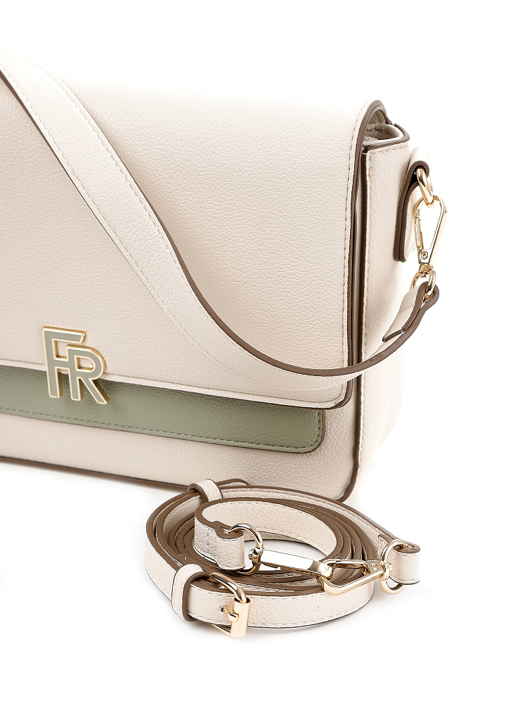 Прямоугольная женская сумка кросс-боди среднего размера с клапаном из коллекции итальянского бренда FABRETTI – образец лаконичности и стиля для повседневной городской моды. Она выполнена из зернистой экокожи молочного оттенка с пастельно-зеленой отделкой.У модели плавные углы, которые визуально смягчают образ. Клапан с магнитным замком украшен крупной монограммой бренда с эмалью. Под клапаном открытый накладной карман. С тыльной стороны открытый карман на магнитном замке. Основное отделение закрывается на молнию, внутри открытый карман и на молнии.Сумка дополнена двумя съемными ремнями на карабинах – короткой ручкой и длинным регулируемым ремешком с пряжкой.Длина ремня ок. 125 см. Цвет фурнитуры – золото.