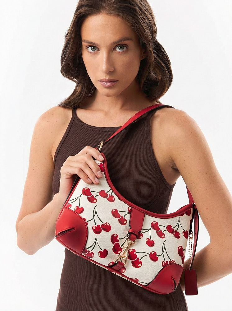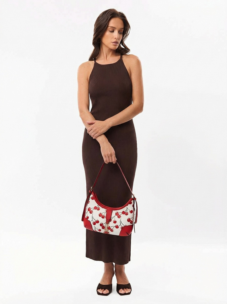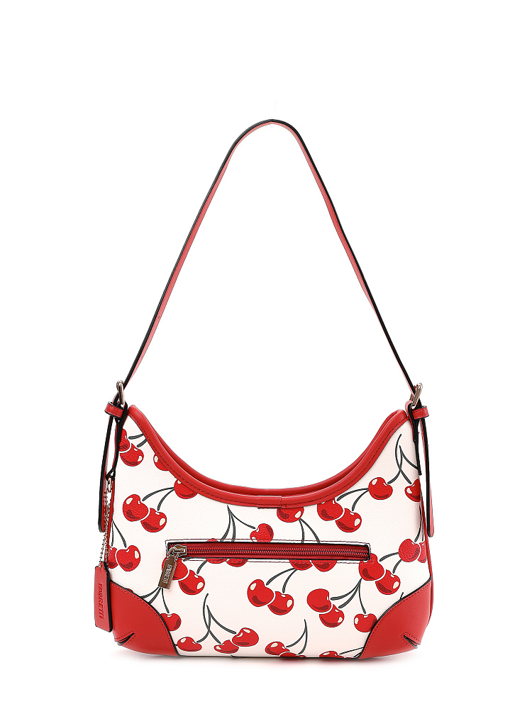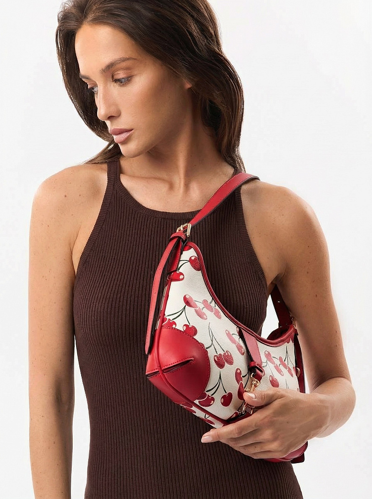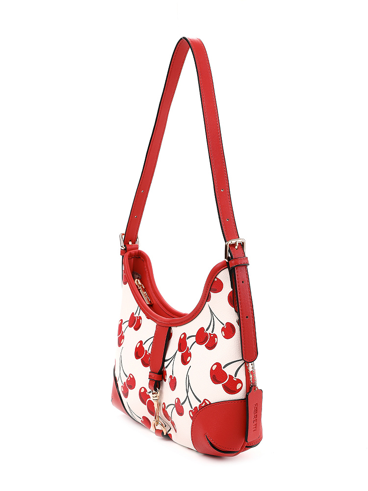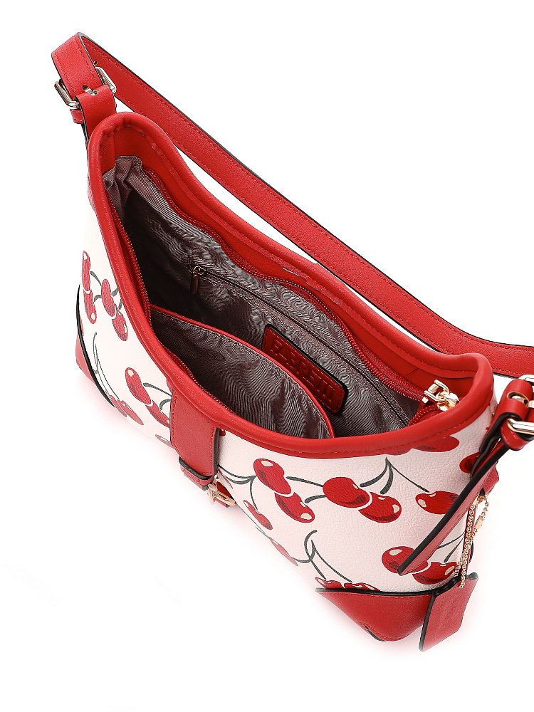 Яркая и необычная женская сумка хобо итальянского бренда FABRETTI из жесткой мелкозернистой экокожи с принтом. У этой модели эффектный летний дизайн – белый каркас украшен крупными изображениями вишенок, отделка из однотонной ярко-красной экокожи, края откантованы черным.Основное отделение на молнии, внутри два кармана – открытый и на молнии, на тыльной стороне карман быстрого доступа.На лицевой стороне сумка украшена декоративным ремешком с карабином. Длина ручки регулируется пряжками по бокам.Цвет фурнитуры – золото.