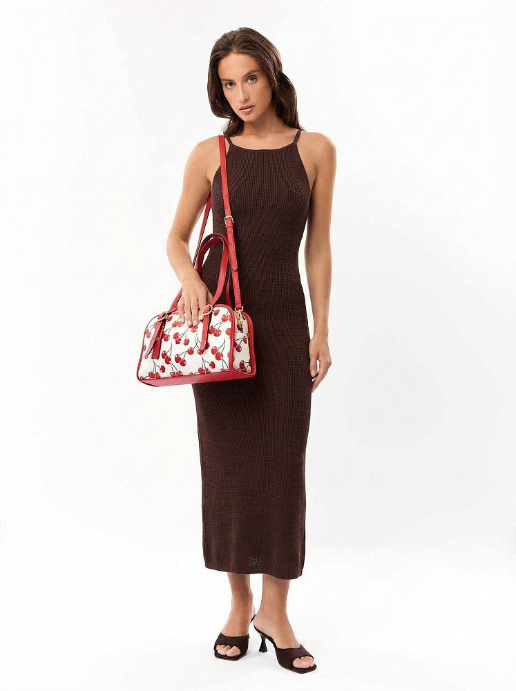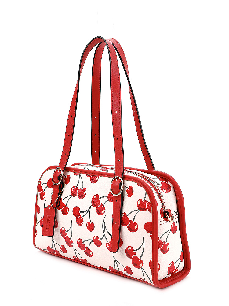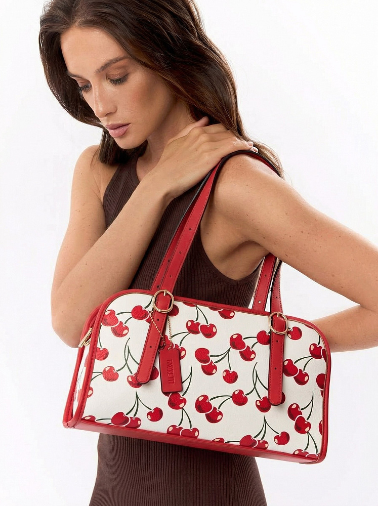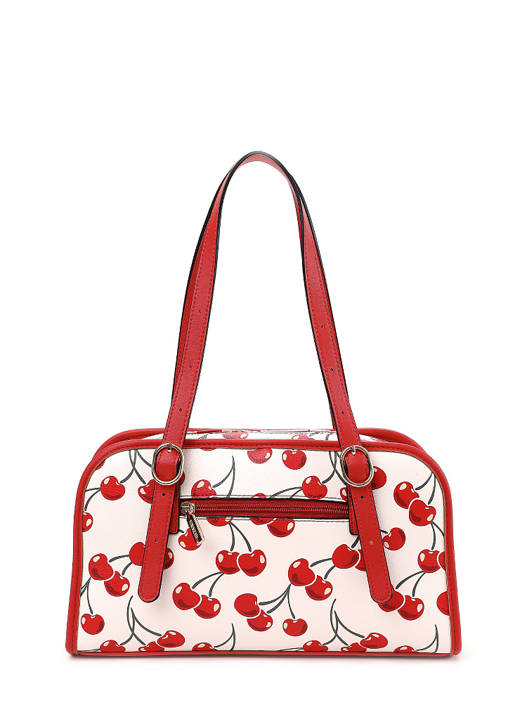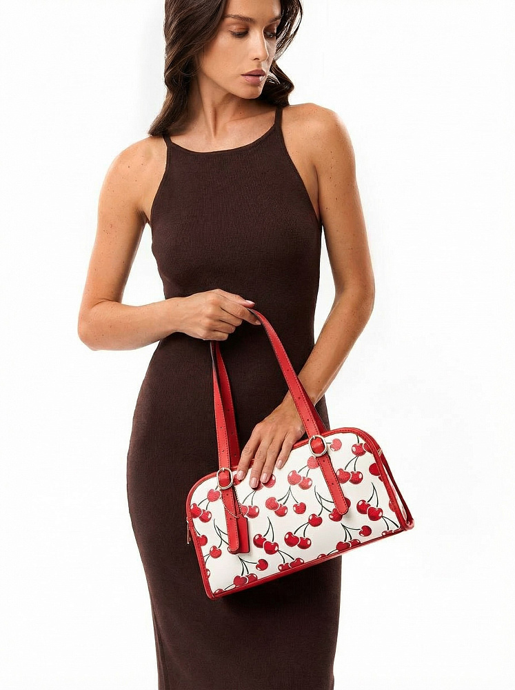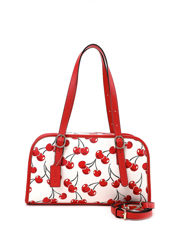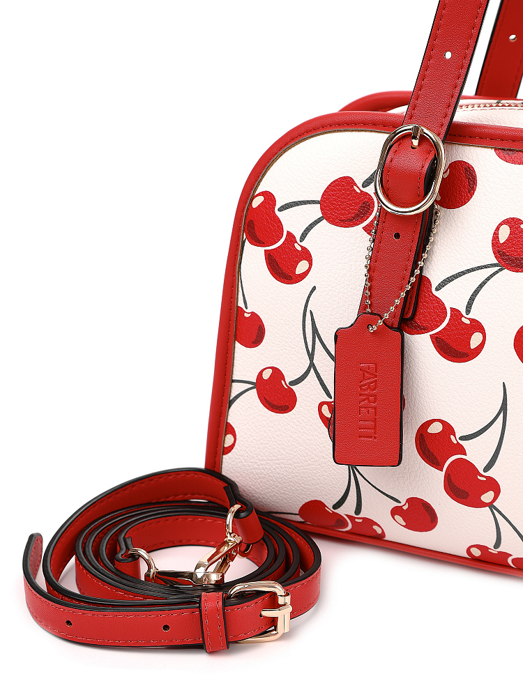 Яркая и позитивная женская сумка боулер итальянского бренда FABRETTI из жесткой мелкозернистой экокожи с принтом. У этой модели эффектный летний дизайн – белый каркас украшен крупными изображениями вишенок, отделка из однотонной ярко-красной экокожи, края откантованы черным.Основное отделение на молнии, внутри два кармана – открытый и на молнии, на тыльной стороне карман быстрого доступа.У модели два вида ручек – короткие, регулируемые по длине, и ремешок на карабинах для ношения кросс-боди. На ручке небольшой съемный брелок из экокожи.Длина ремня ок. 125 см. Цвет фурнитуры – золото.