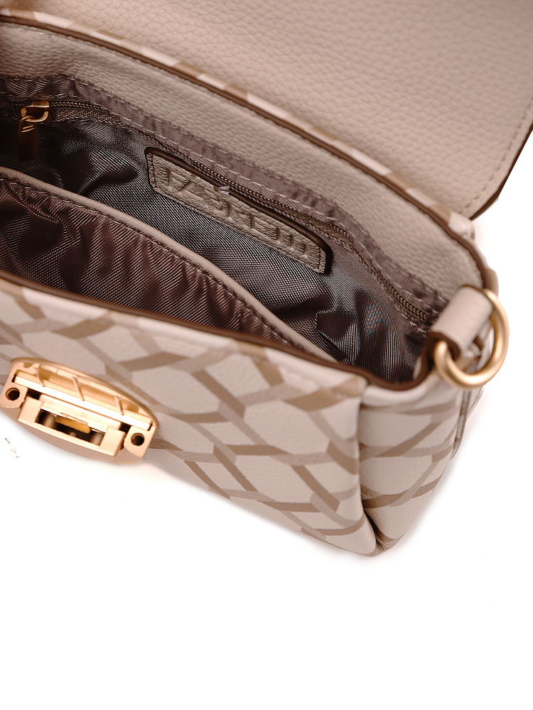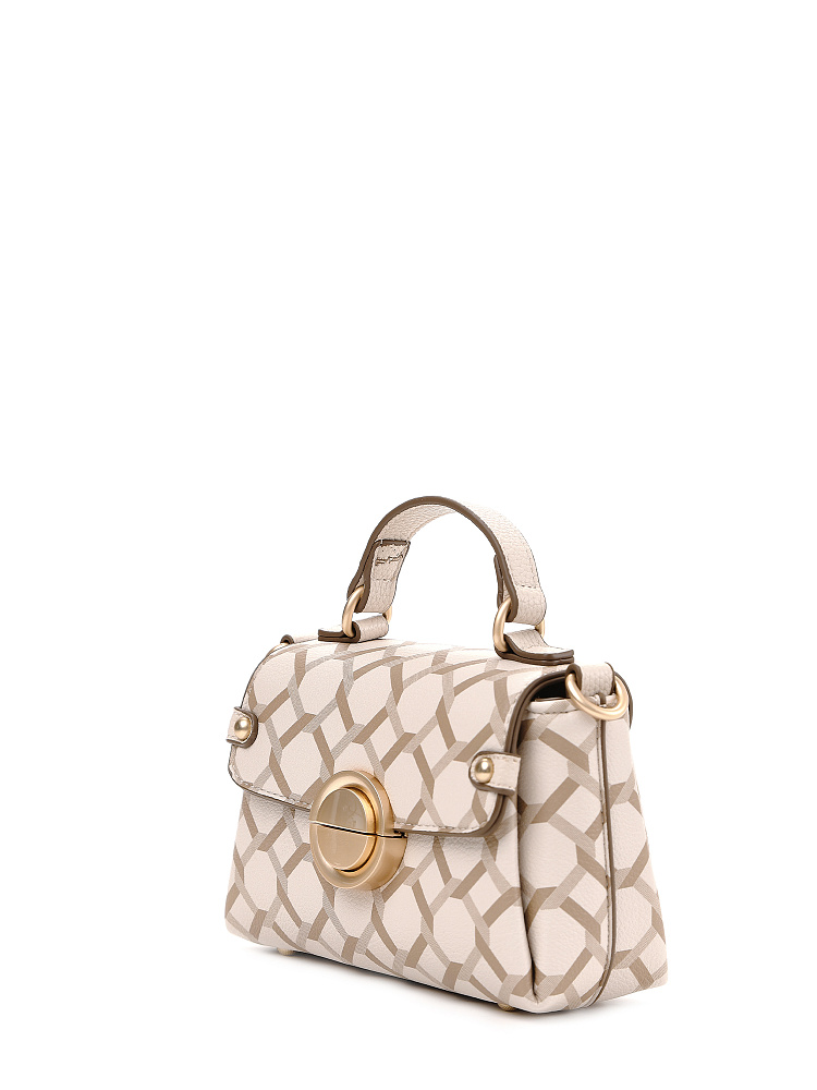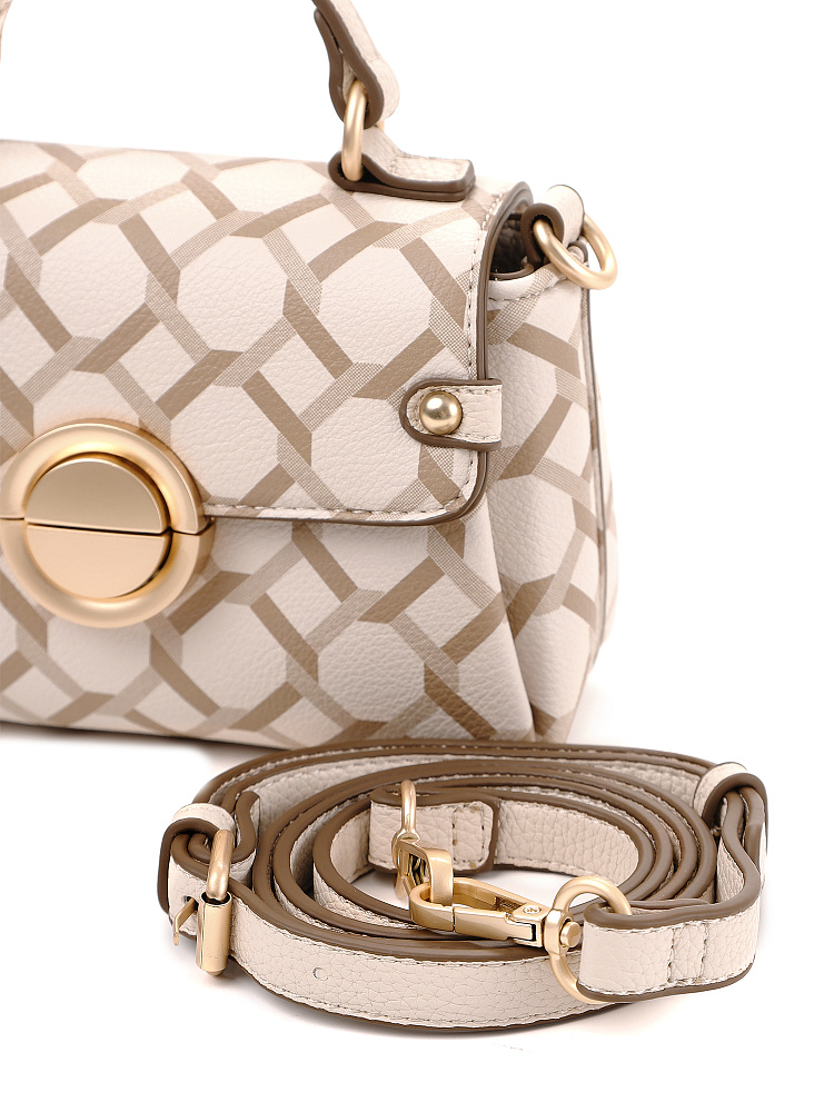 Миниатюрная женская сумка кросс-боди из коллекции итальянского бренда FABRETTI – впечатляющий аксессуар для городского образа. Трапециевидная сумочка с клапаном выполнена из мелкозернистой экокожи кремово-бежевого оттенка и украшена лаконичным геометрическим узором. Края оформлены коричневым кантом; на клапане круглый металлический замок цвета матового золота, декоративные хлястики с кнопкой.Сумка с со строгим узором делает образ более сложным, но одновременно структурирует его. Этот аксессуар привлекает внимание и может стать эффектным акцентом с однотонным костюмом.У сумки одно отделение с открытым карманом и карманом на молнии. На тыльной стороне карман быстрого доступа на молнии. Сумка дополнена короткой ручкой для ношения в руках.Узкий съемный плечевой ремень на карабинах регулируется по длине при помощи пряжки. Дно дополнено металлическими ножками.Длина ремня ок. 125 см. Цвет фурнитуры – матовое золото.