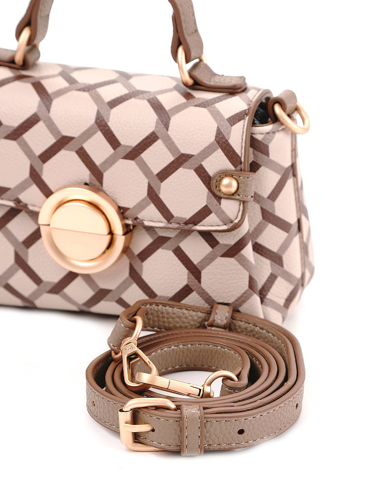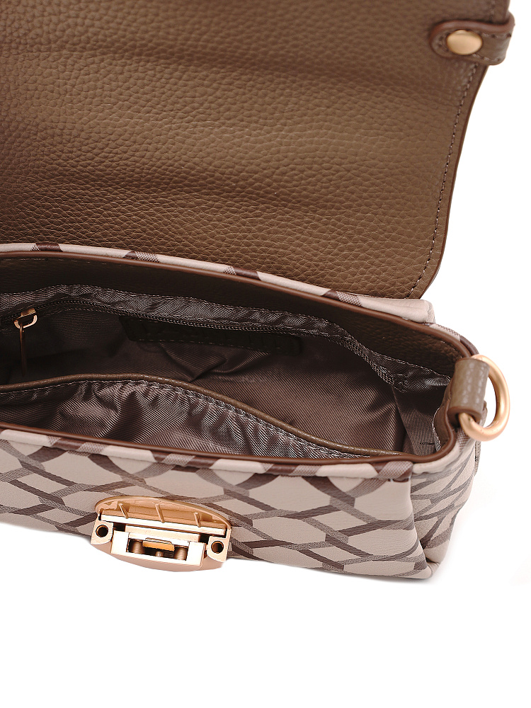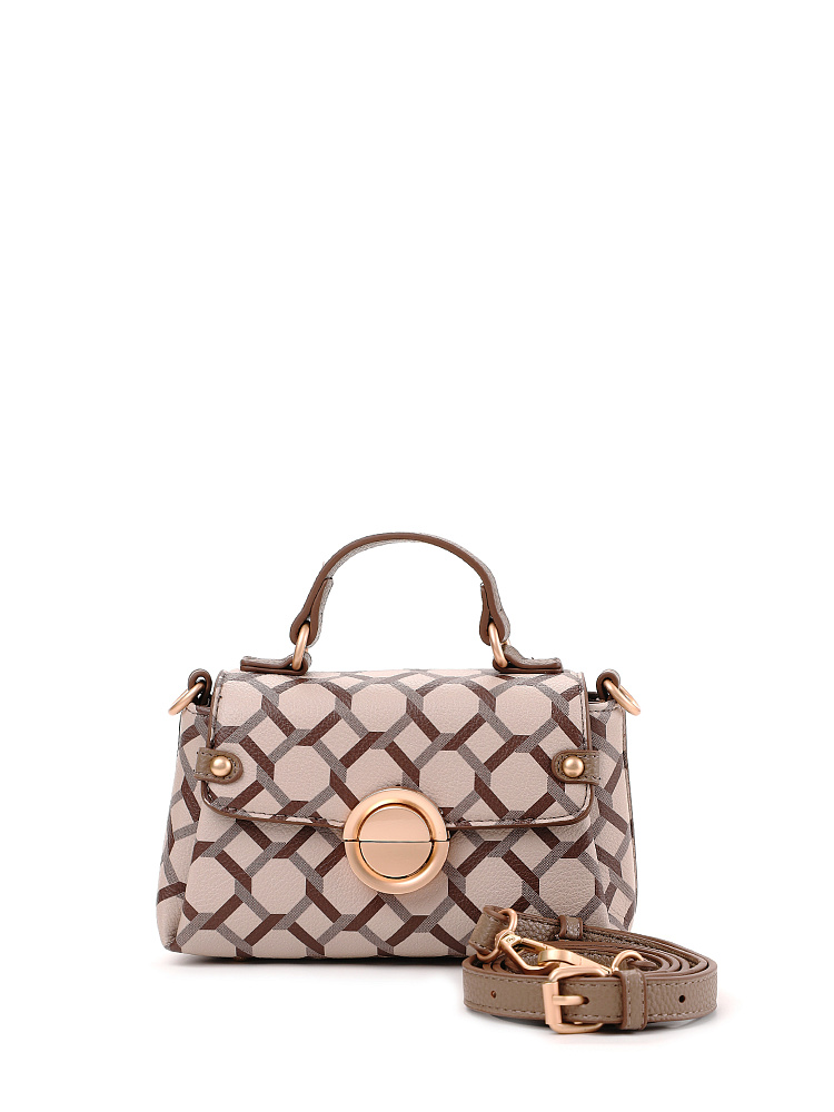 Миниатюрная женская сумка кросс-боди из коллекции итальянского бренда FABRETTI – впечатляющий аксессуар для городского образа. Трапециевидная сумочка с клапаном выполнена из мелкозернистой экокожи темного серо-бежевого оттенка и украшена лаконичным геометрическим узором. Края оформлены коричневым кантом; на клапане круглый металлический замок цвета матового золота, декоративные хлястики с кнопкой.Сумка с со строгим узором делает образ более сложным, но одновременно структурирует его. Этот аксессуар привлекает внимание и может стать эффектным акцентом с однотонным костюмом.У сумки одно отделение с открытым карманом и карманом на молнии. На тыльной стороне карман быстрого доступа на молнии. Сумка дополнена короткой ручкой для ношения в руках.Узкий съемный плечевой ремень на карабинах регулируется по длине при помощи пряжки. Дно дополнено металлическими ножками.Длина ремня ок. 125 см. Цвет фурнитуры – матовое золото.