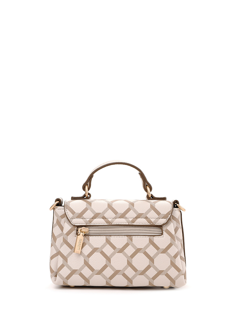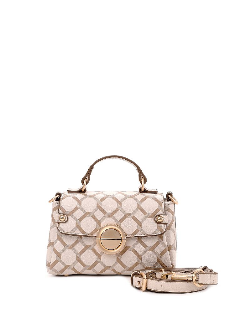 Миниатюрная женская сумка кросс-боди из коллекции итальянского бренда FABRETTI – впечатляющий аксессуар для городского образа. Трапециевидная сумочка с клапаном выполнена из мелкозернистой экокожи светло-бежевого оттенка и украшена лаконичным геометрическим узором. Края оформлены коричневым кантом; на клапане круглый металлический замок цвета матового золота, декоративные хлястики с кнопкой.Сумка с со строгим узором делает образ более сложным, но одновременно структурирует его. Этот аксессуар привлекает внимание и может стать эффектным акцентом с однотонным костюмом.У сумки одно отделение с открытым карманом и карманом на молнии. На тыльной стороне карман быстрого доступа на молнии. Сумка дополнена короткой ручкой для ношения в руках.Узкий съемный плечевой ремень на карабинах регулируется по длине при помощи пряжки. Дно дополнено металлическими ножками.Длина ремня ок. 125 см. Цвет фурнитуры – матовое золото.