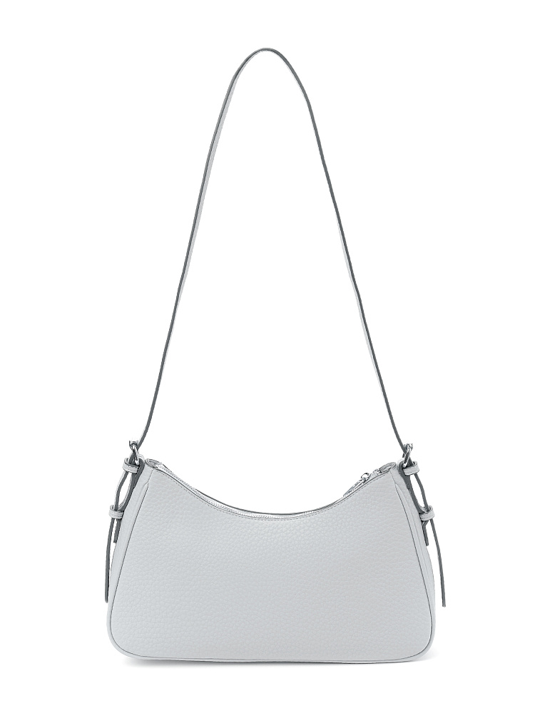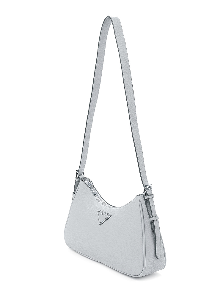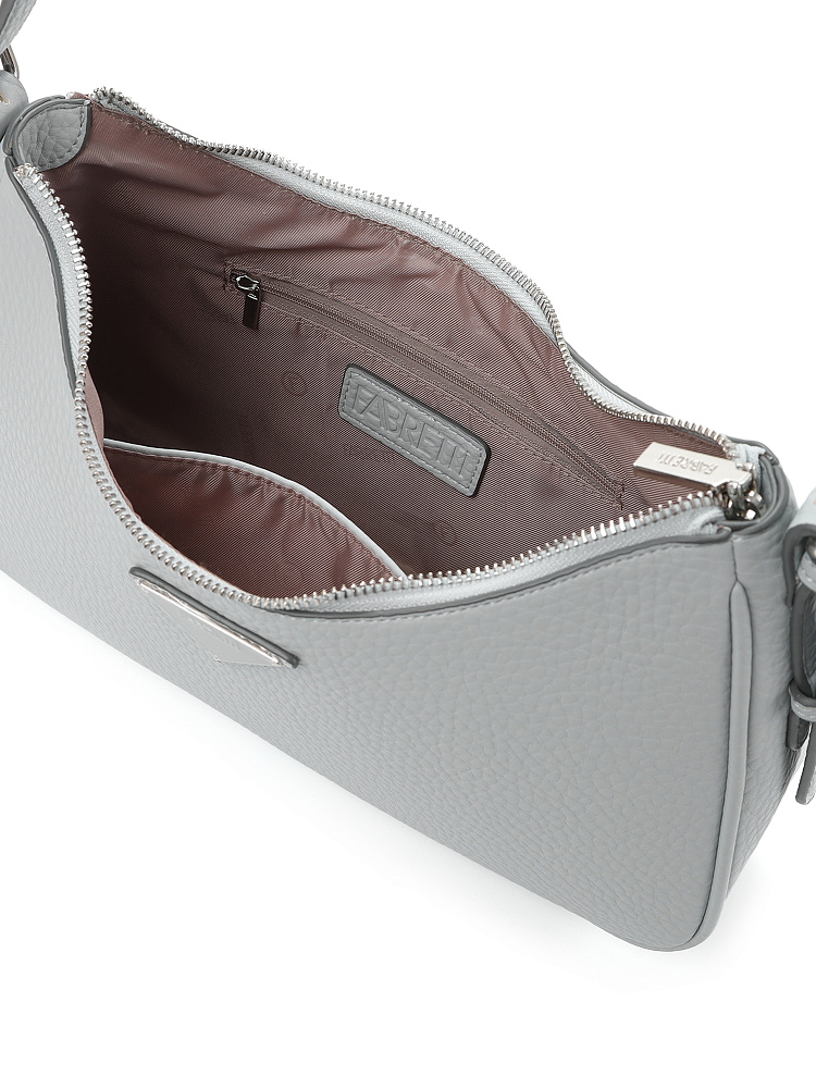 Небольшая женская сумка кросс-боди из жесткой крупнозернистой экокожи пастельно-голубого оттенка. Это классическая городская модель повседневного ношения, которая подходит под любой образ.У сумки форма трапеции с заниженным центром, широкий ремень на двух пряжках, отделение на металлической молнии. Внутри открытый карман и на молнии.Лицевая сторона украшена металлическим логотипом с эмалью.Длина ремня ок. 110 см. Цвет фурнитуры – серебро.