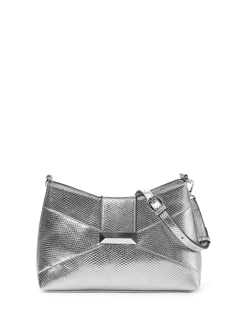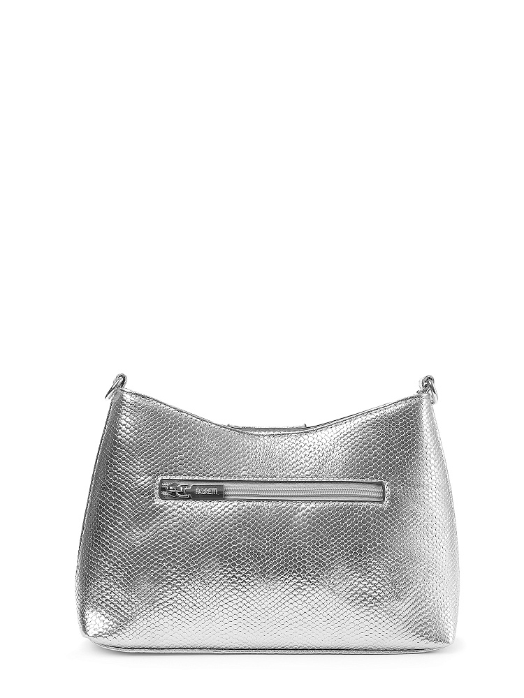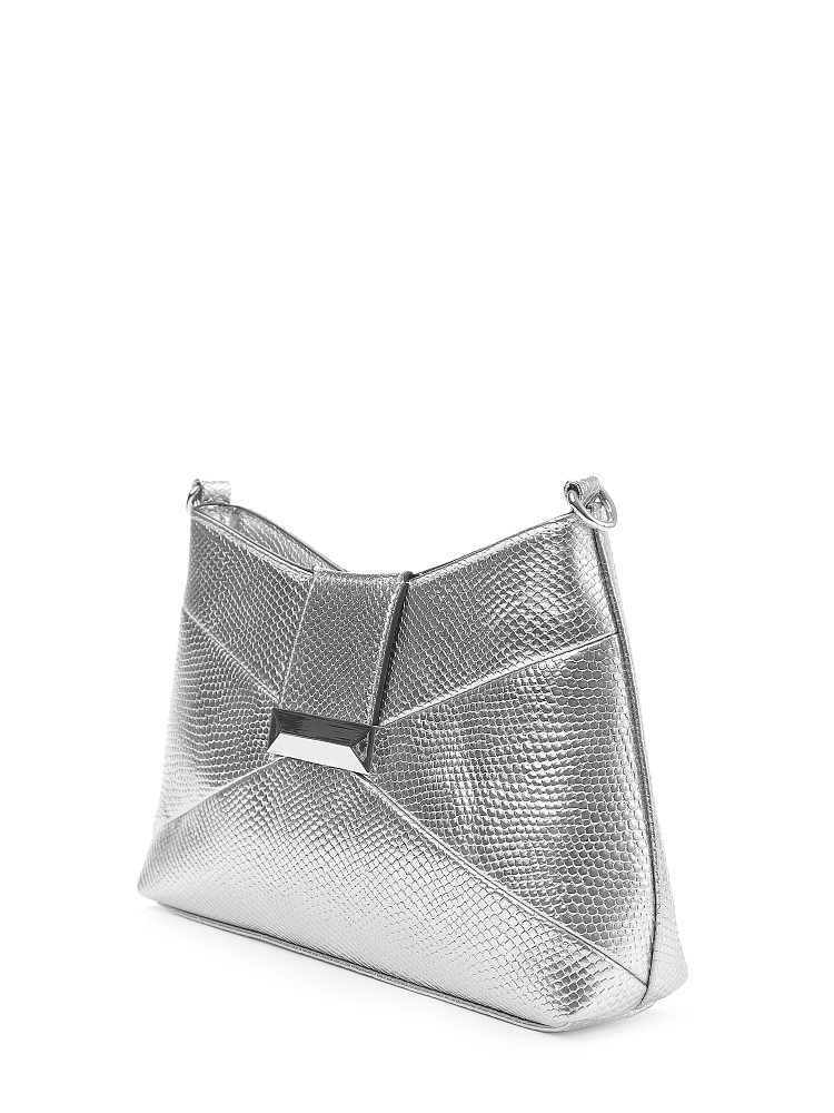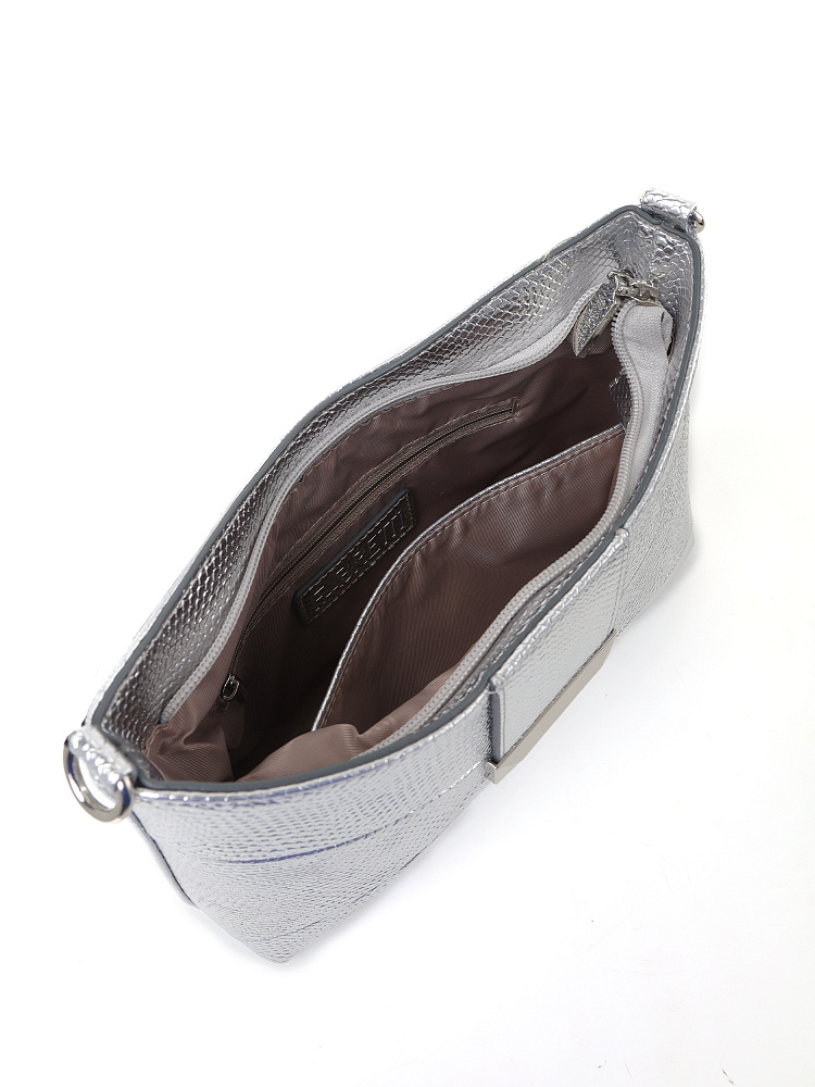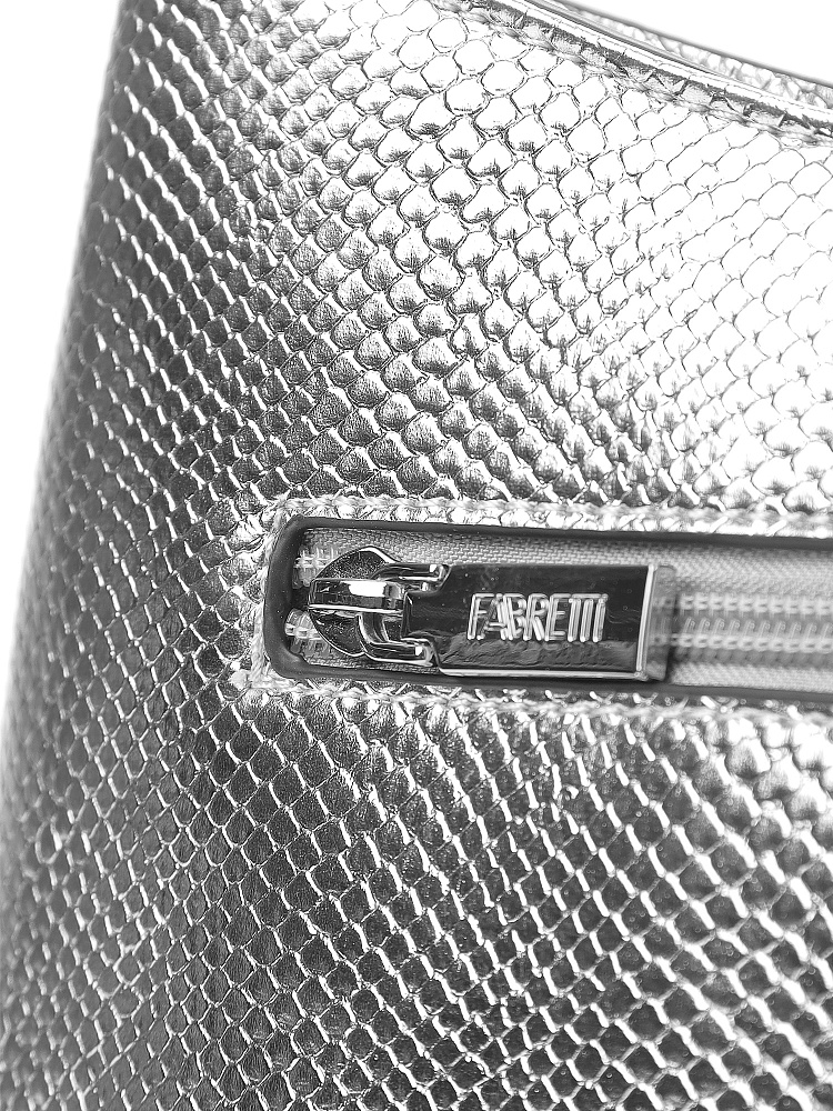 Невероятно эффектная серебристая женская сумка кросс-боди итальянского бренда FABRETTI из экокожи с тиснением под шкуру рептилии. Великолепный вариант для дерзкого современного образа; отлично сочетается с однотонной одеждой классического стиля или позволяет создать трендовые неформальные образы, построенные на контрасте фактур материалов.У сумки прямоугольный силуэт с небольшим изгибом в центре, строгую геометрию подчеркивают диагональные швы и декоративный хлястик с крупной металлической пряжкой на лицевой стороне. Жесткий каркас четко держит форму. На тыльной стороне карман быстрого доступа.Основное отделение закрывается молнией. Внутри небольшой карман на молнии и открытый карман.Узкий съемный плечевой ремень на карабинах регулируется по длине при помощи пряжки.Длина ремня ок. 135 см. Цвет фурнитуры – серебро.