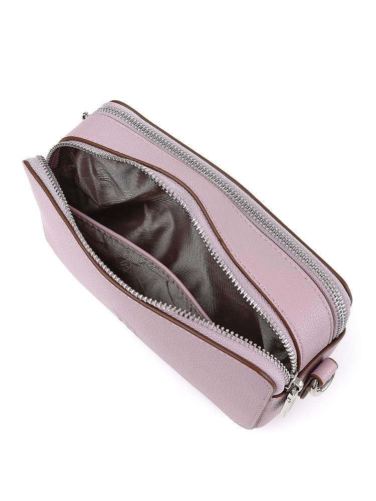 Небольшая женская сумка кросс-боди итальянского бренда FABRETTI с двумя отделениями выполнена из высококачественной экокожи нежного сиренево-розового оттенка с мелкозернистой фактурой. Это универсальный аксессуар под любой городской стиль – от кэжуал, до спорт-шик, небольшая сумка на каждый день, которая вмещает все самое необходимое.У сумки прямоугольный силуэт с коричневой отделкой краев и скругленными углами. Оба отделения застегиваются на молнии. Внутри одного карман на молнии, в другом – открытый карман. На лицевой стороне лаконичное тиснение в виде монограммы бренда.Модель дополнена съемным узким ремнем на карабинах, регулируемым пряжкой.Длина ремня ок. 125см. Цвет фурнитуры – серебро.