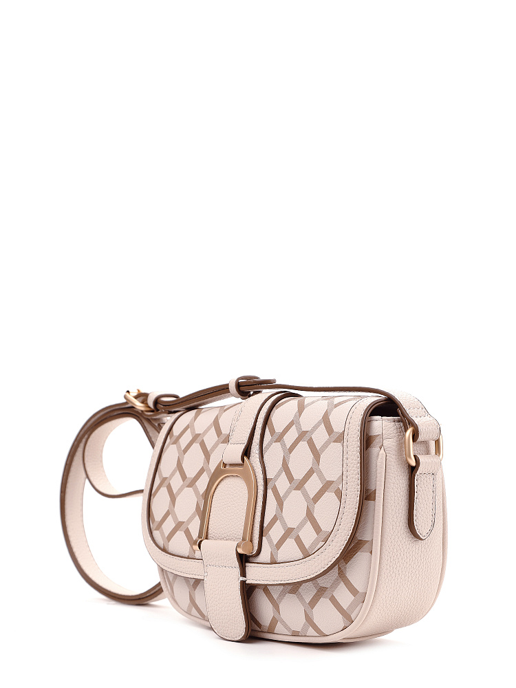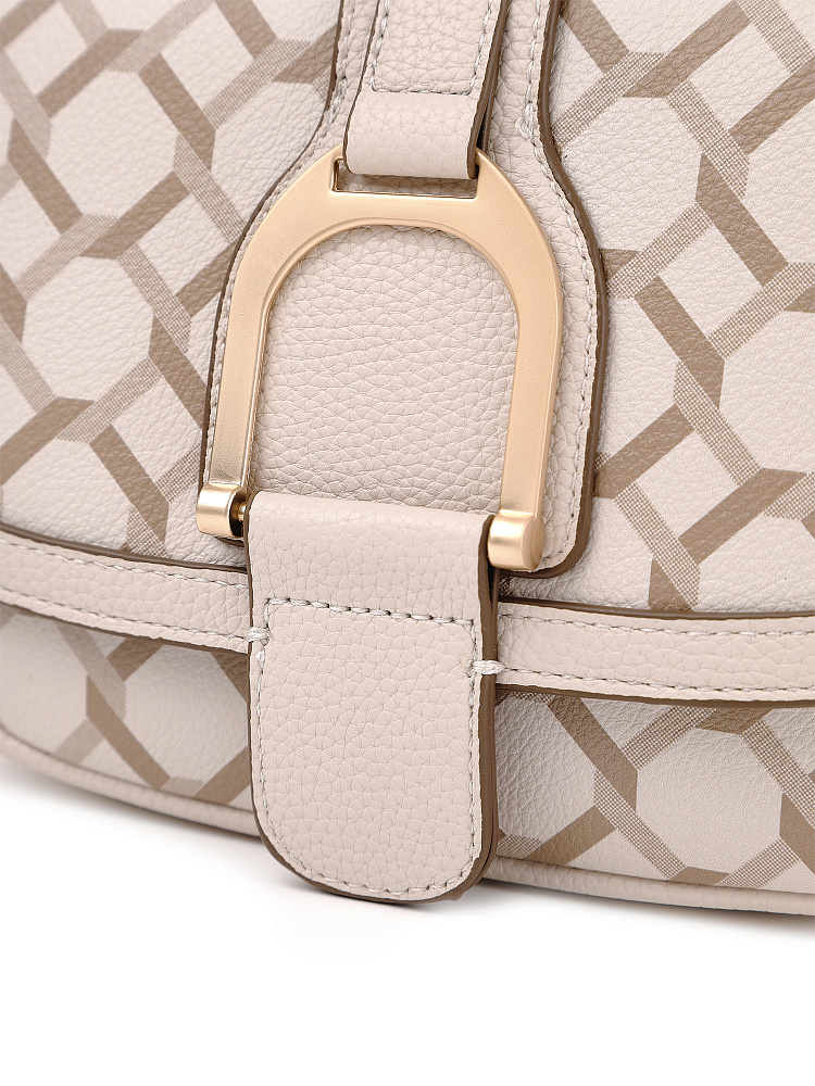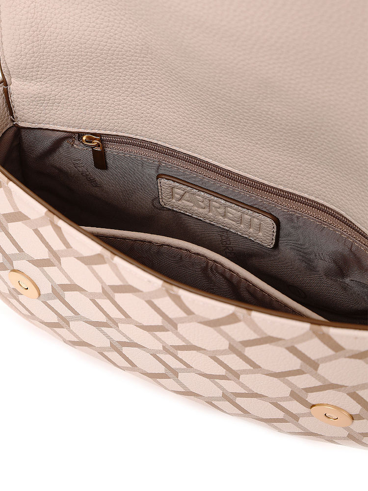 Небольшая женская сумка кросс-боди из коллекции итальянского бренда FABRETTI идеально подойдет для повседневного образа на теплый сезон. Округлая сумочка с клапаном на двух магнитах выполнена из мелкозернистой экокожи кремово-бежевого оттенка и украшена лаконичным геометрическим узором. Края оформлены коричневым кантом; на клапане декоративный ремень с крупной металлической пряжкой.Сумка с со строгим узором делает образ более сложным, но одновременно структурирует его. Этот аксессуар привлекает внимание и может стать эффектным акцентом с однотонным костюмом.У сумки одно отделение с открытым карманом и карманом на молнии. Узкий плечевой ремень регулируется по длине при помощи пряжки.Длина ремня ок. 125 см. Цвет фурнитуры – матовое золото.